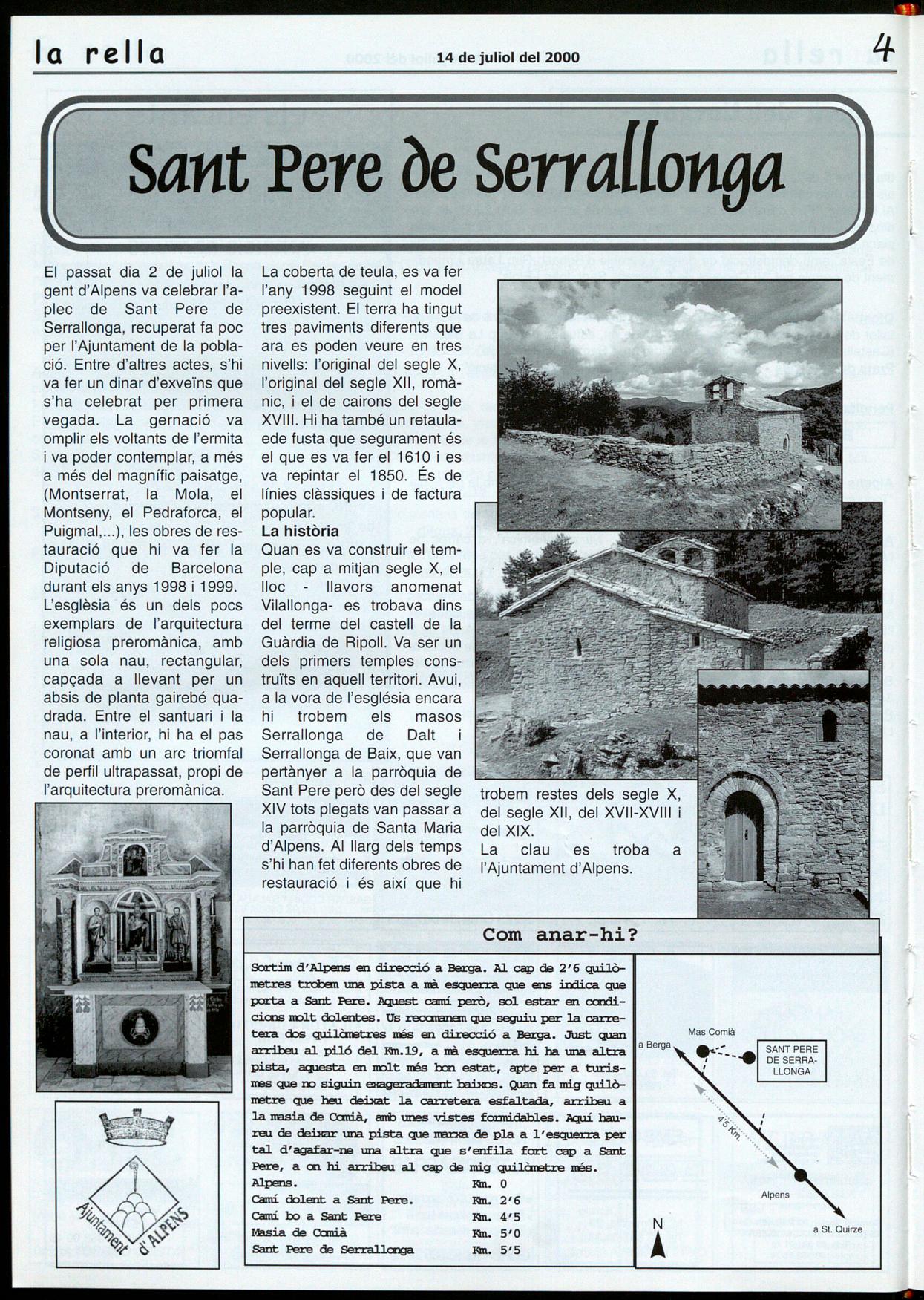El passat dia 2 de juliol la gent d'Alpens va celebrar l'aplec de Sant Pere de Serrallonga, recuperat fa poc per l'Ajuntament de la població. Entre d'altres actes, s'hi va fer un dinar d'exveïns que s'ha celebrat per primera vegada. La gernació va omplir els voltants de l'ermita va poder contemplar, a més a més del magnífic paisatge, (Montserrat, la Mola, el Montseny, el Pedraforca, el Puigmal, ), les obres de restauració que hi va fer la Diputació de Barcelona durant els anys 1998 1999. L'esglèsia és un dels pocs exemplars de l'arquitectura religiosa preromànica, amb una sola nau, rectangular, capçada a llevant per un absis de planta gairebé quadrada. Entre el santuari la nau, a l'interior, hi ha el pas coronat amb un arc triomfal de perfil ultrapassat, propi de l'arquitectura preromànica.