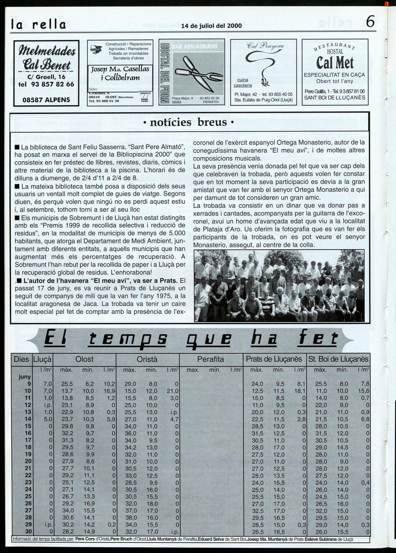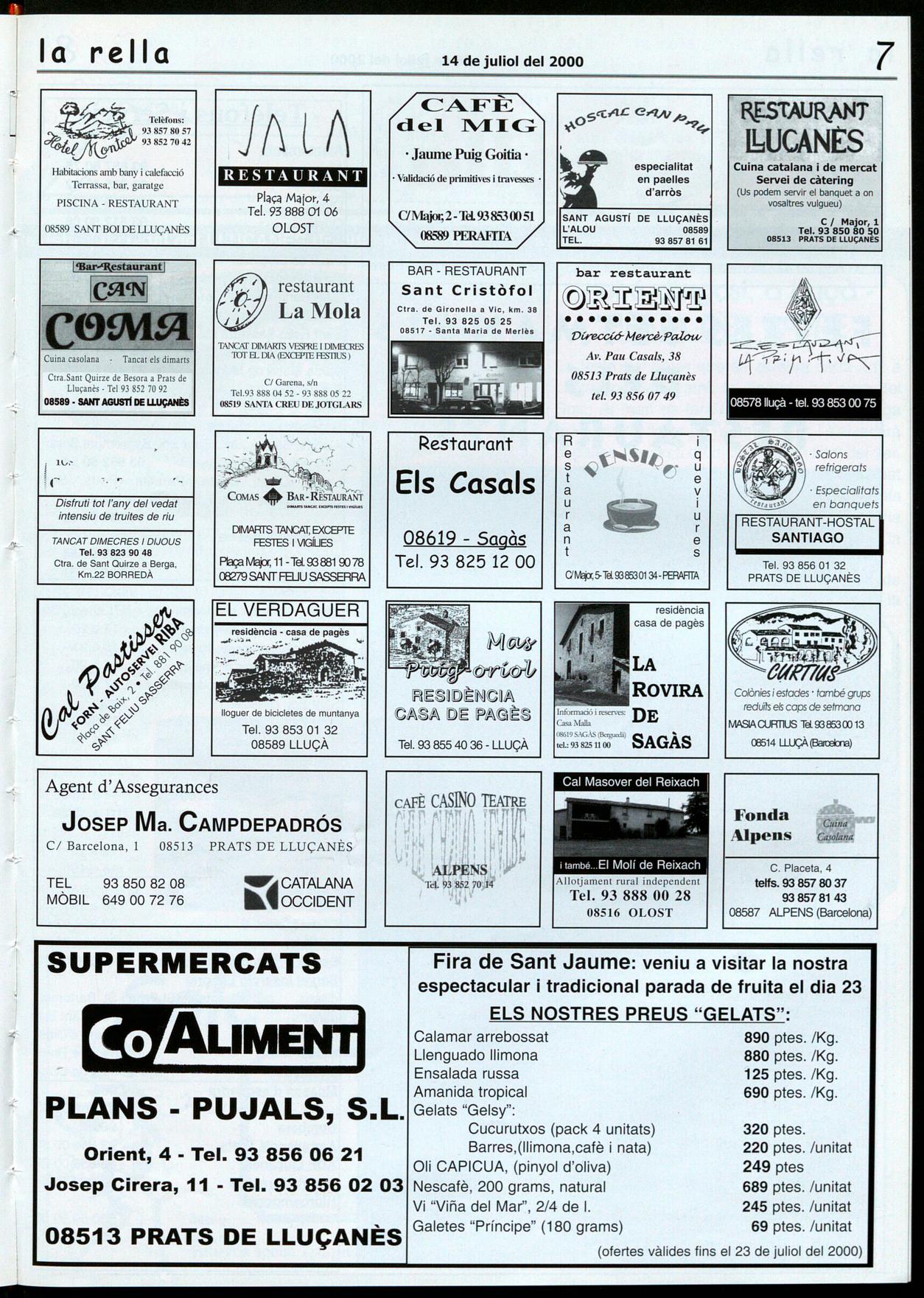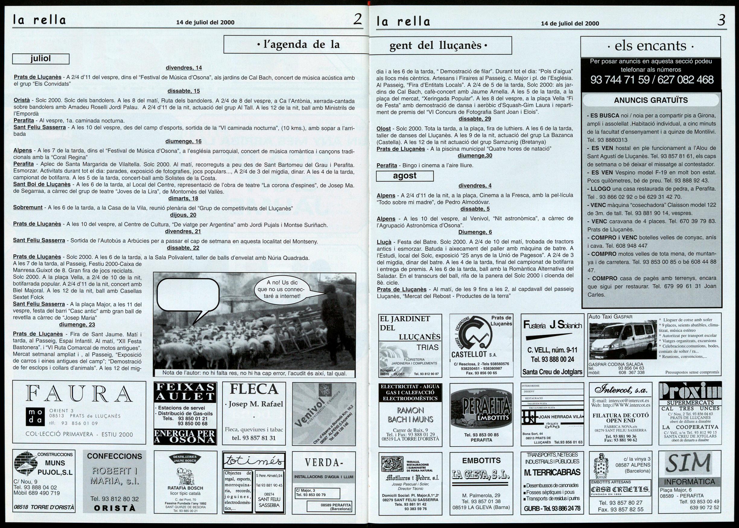Olost - Solc 2000. Tota la tarda, a la plaça, fira de luthiers. A les 6 de la tarda, taller de danses del Lluçanès. A les 9 de la nit, actuació del grup La Bazanca (Castella). A les 12 de la nit actuació del grup Samzunig (Bretanya) Prats de Lluçanès - A la piscina municipal "Quatre hores de natació" diumenge.30