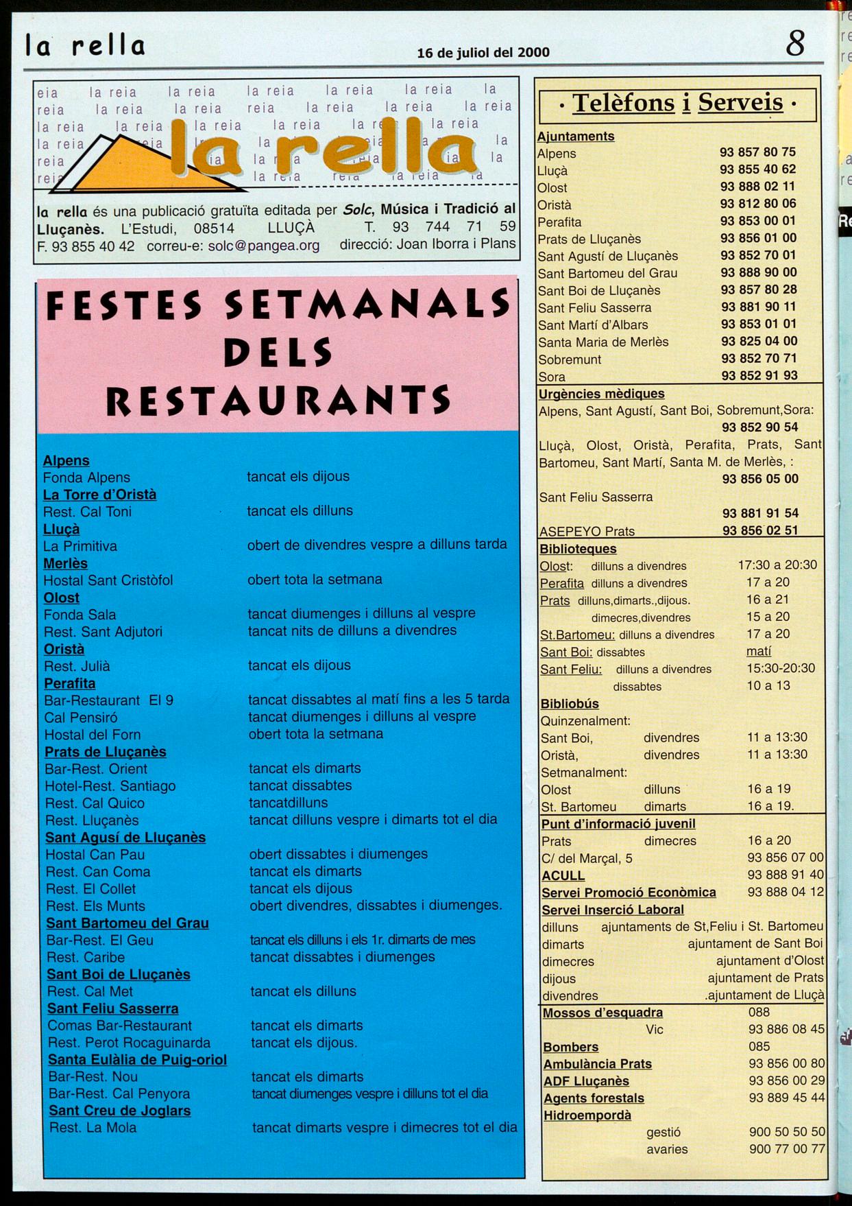 la rella és una publicació gratuïta editada per Solc, Música i Tradició al Lluçanès. L'Estudi, 08514 LLUÇÀ T. 93 744 71 59 F. 93 855 40 42 correu-e: solc@pangea.org direcció: Joan Iborra i Plans rei