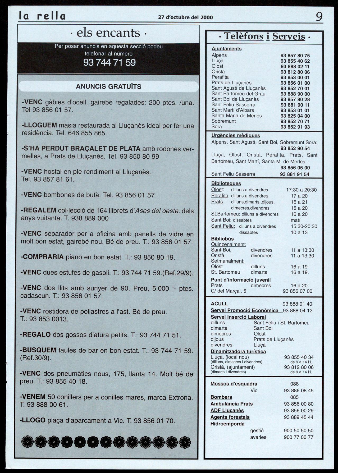 Lluçà, (local nou) 938554034 (dilluns, dimecres divendres) de 9 a 14 H. Oristà, (ajuntament) 938128006 (dimarts divendres) de 9 a 14 H.