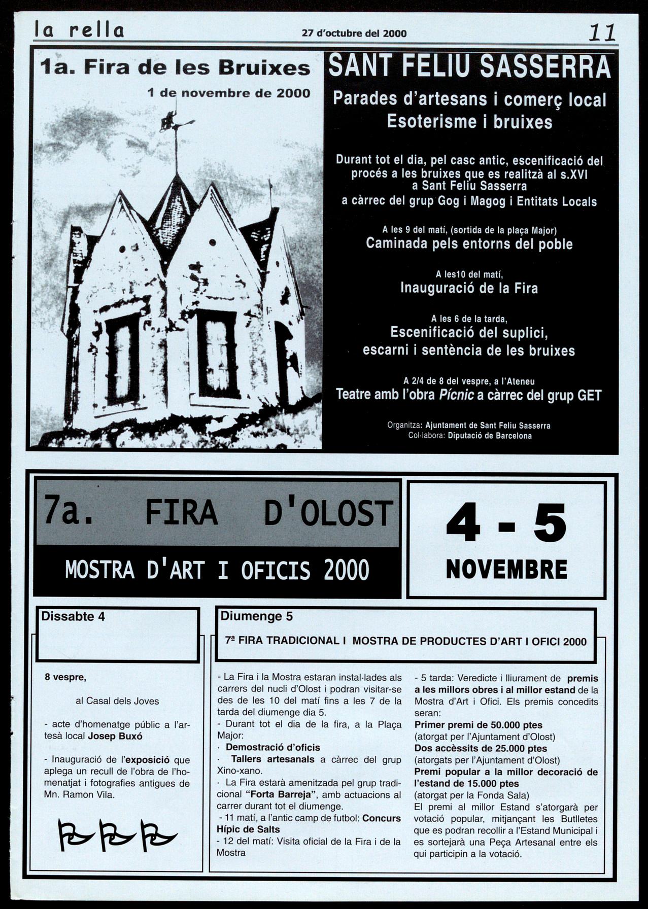 Olost - 7a. Fira Tradicional i Mostra de productes d'art i ofici 2000. A les 11 del matí, a l'antic camp de futbol, concurs hípic de salts. A les 12, visita oficial de la fira de la mostra. A les 5 de la tarda, veredicte i lliurament de premis a les millors obres al millor estand de la Mostra d'Art Ofici. Durant tot el dia hi haurà demostració d'oficis, tallers artesanals a càrrec del grup "Xino-xano" actuacions al carrer del grup "Forta barreja" Prats de Lluçanès - Cada primer diumenge, al Passeig, Mercat del rebost. Sant Bartomeu del Grau - A les 6 de la tarda, al Casal d'avis, castanyada, organitzada per l'Associació de jubilats de Sant Bartomeu.