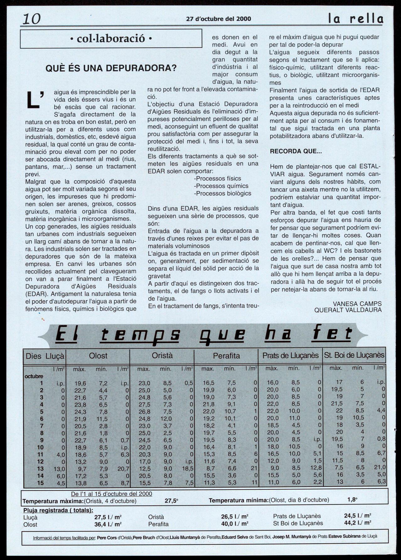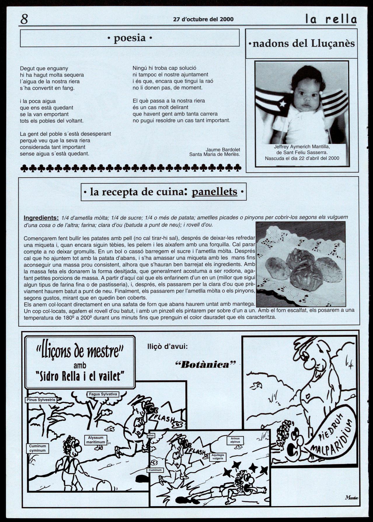 - A la pàgina 4, en l'entrevista a Oriol Comas, a on hi diu "Han mort petxines, cargols d'aigua, ha de dir "Han mort peixos, bibalbs, petxines, cargols d'aigua,