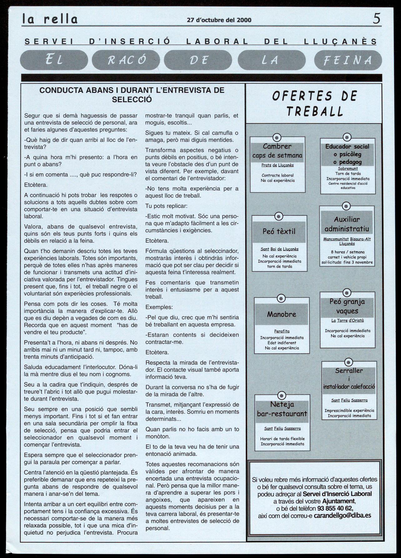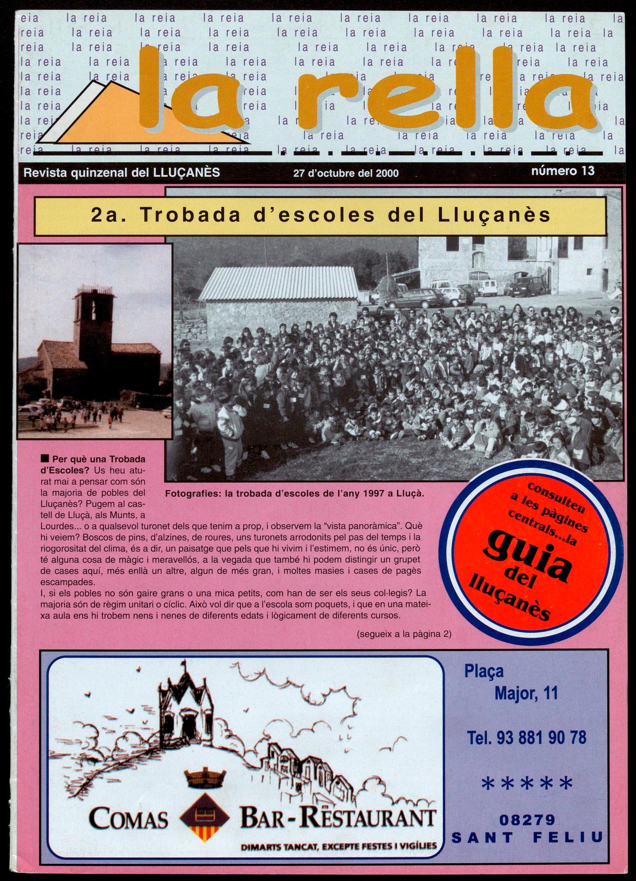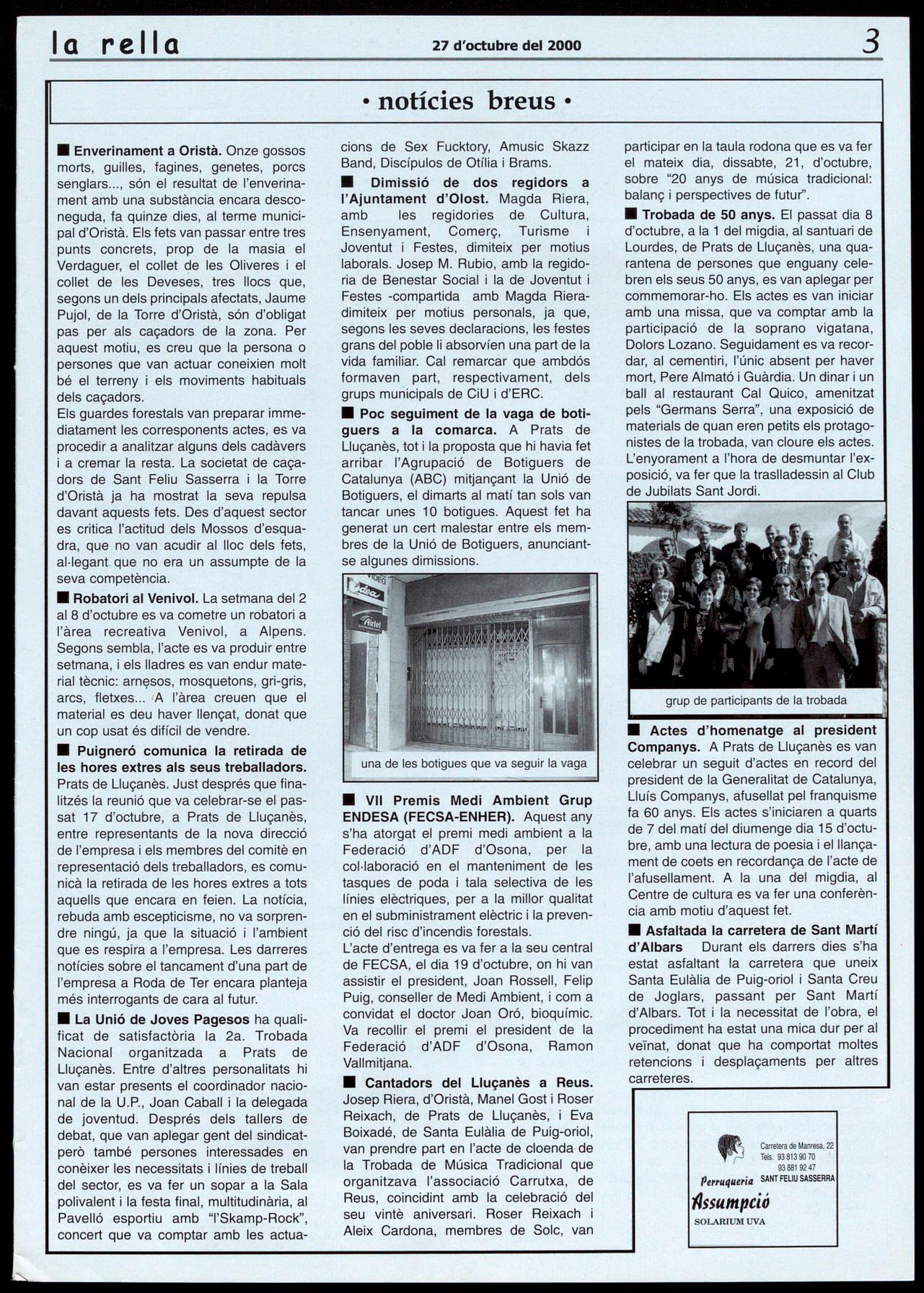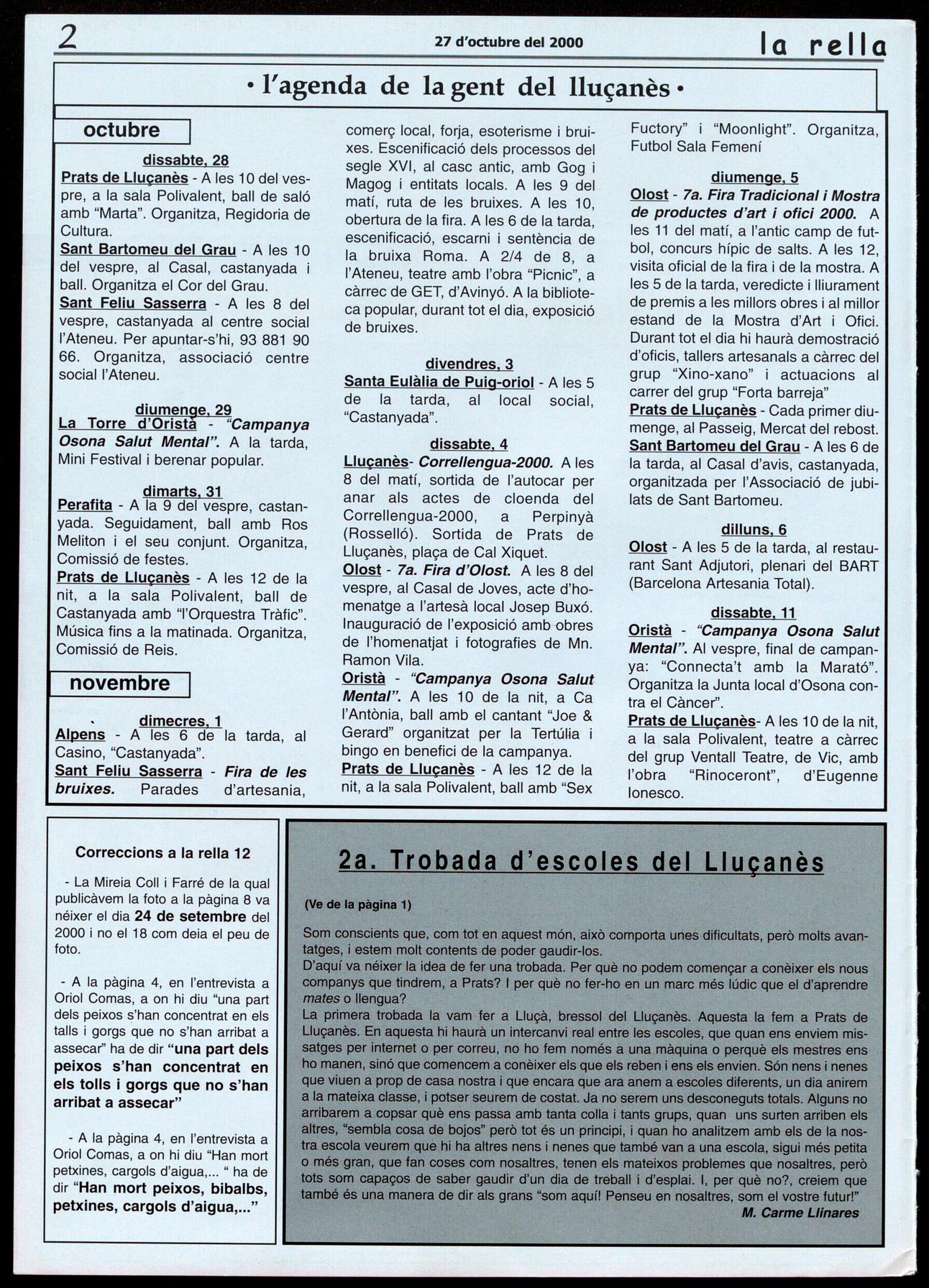 Lluçanès- CorrelJengua-2000. A les 8 del matí, sortida de l'autocar per anar als actes de cloenda del Correllengua-2000, a Perpinyà (Rosselló). Sortida de Prats de Lluçanès, plaça de Cal Xiquet. Olost - 7a. Fira d'Olost. A les 8 del vespre, al Casal de Joves, acte d'homenatge a l'artesà local Josep Buxó. Inauguració de l'exposició amb-obres de l'homenatjat fotografies de Mn. Ramon Vila. Oristà - "Campanya Osona Salut Mental". A les 10 de la nit, a Ca I'Antònia, ball amb el cantant "Joe & Gerard" organitzat per la Tertúlia bingo en benefici de la campanya. Prats de Lluçanès - A les 12 de la nit, a la sala Polivalent, ball amb "Sex