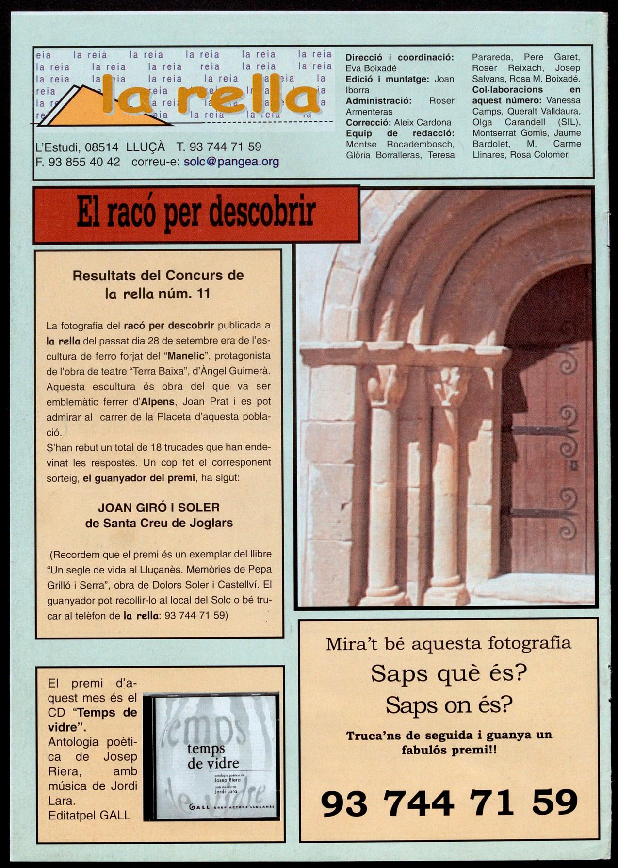 (Recordem que el premi és un exemplar del llibre "Un segle de vida al Lluçanès. Memòries de Pepa Grilló Serra", obra de Dolors Soler i Castellví. El guanyador pot recollir-lo al local del Solc a bé trucar al telèfon de la rella: 9374471 59)