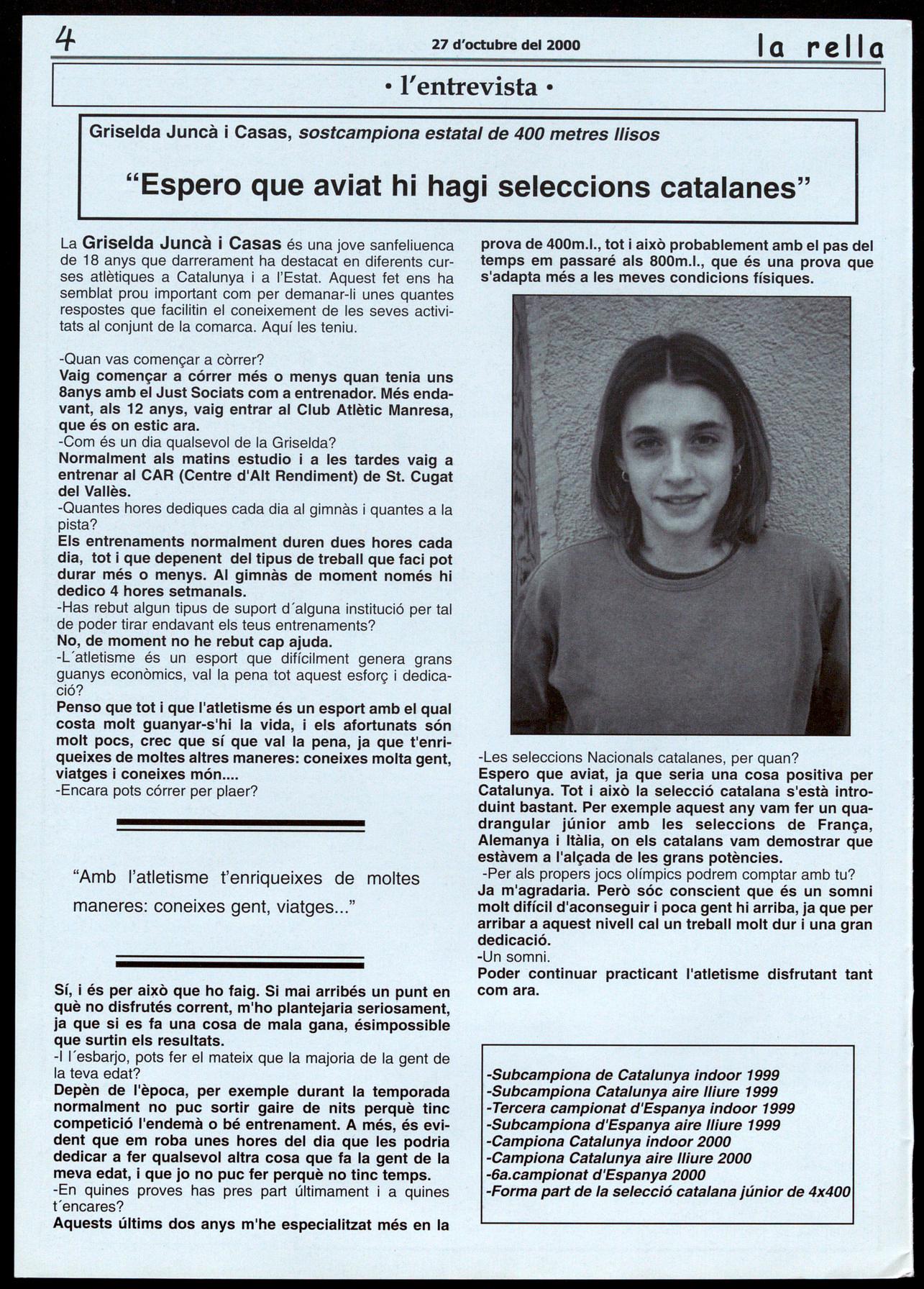 La Griselda Juncà i Casas és una JOV€? sanfeliuenca de 18 anys que darrerament ha destacat en diferents curses atlètiques a Catalunya a l'Estat. Aquest fet ens ha semblat prou important com per demanar-li unes quantes respostes que facilitin el coneixement de les seves activitats al conjunt de la comarca. Aquí les teniu.