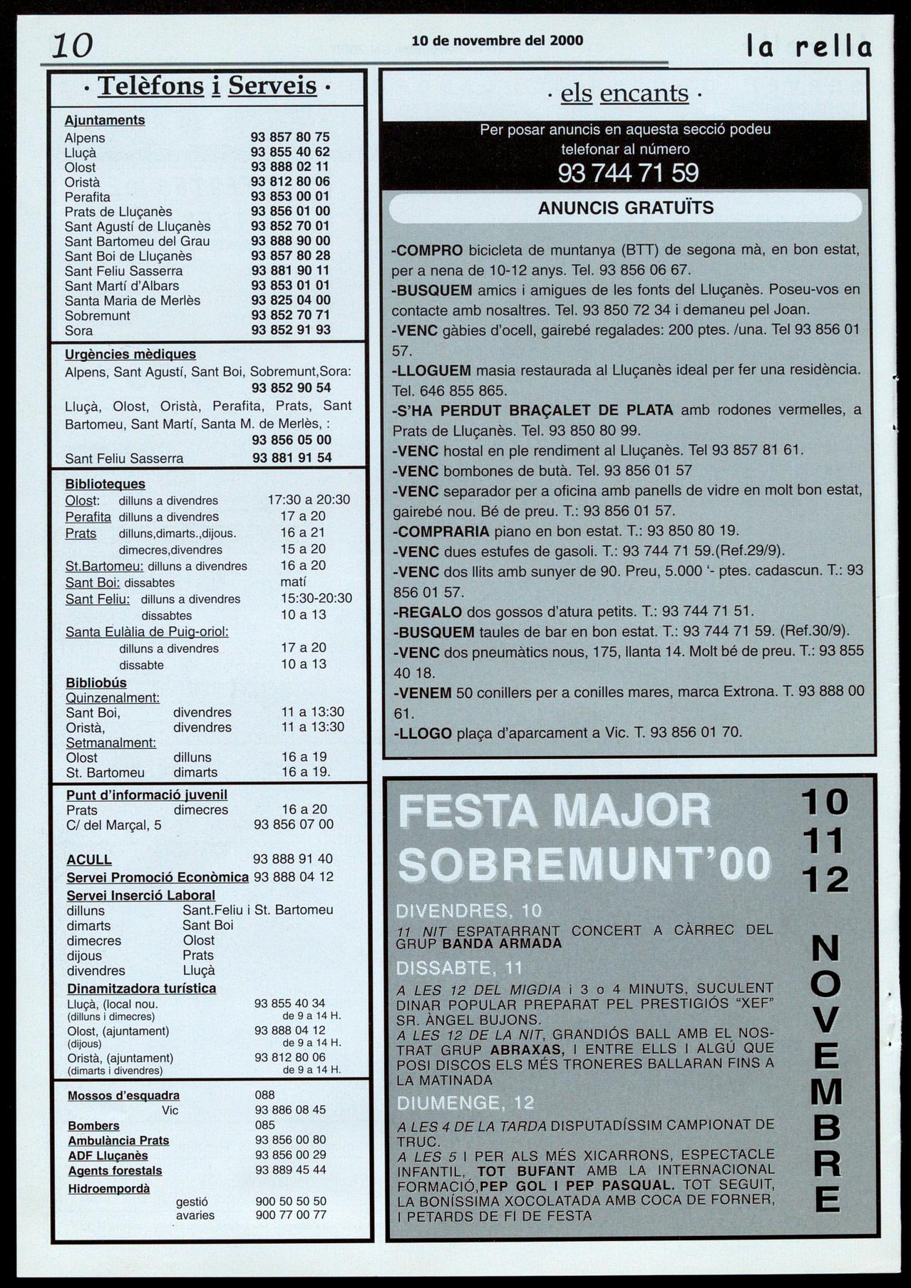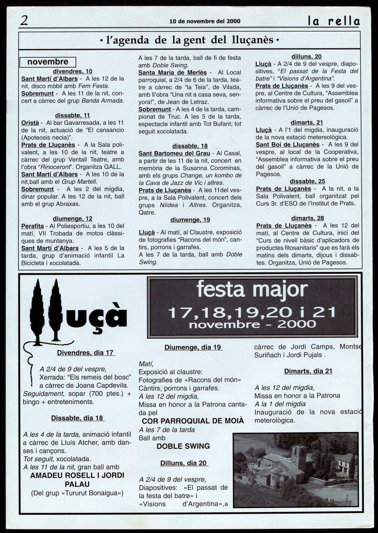 Lluçà - A 2/4 de 9 del vespre, diapodivendres, 10 Santa Maria de Merlès - Al Local sitives, "El passat de la Festa del Sant Martí d'Albars - A les 12 de la parroquial, a 2/4 de 6 de la tarda, tea- bette" i "Visions d'Argentina". nit, disco mòbil amb Fem Festa. tre a càrrec de "la Teia", de Vilada, Prats de Lluçanès - A les 9 del vesSobremunt - A les 11 de la nit, con- amb lI'obra "Una nit a casa seva, sen- pre, al Centre de Cultura, "Assemblea cert a càrrec del grup Banda Armada. yora!", de Jean de Letraz. informativa sobre el preu del gasoil" a Sobremunt - A les 4 de la tarda, cam- càrrec de l'Unió de Pagesos.