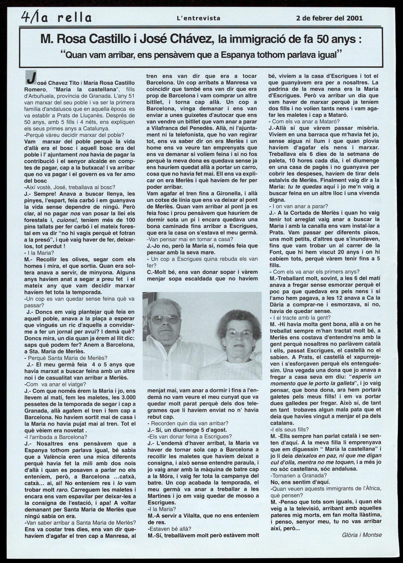 osé Chavez Tito i María Rosa Castillo Romero, "Maria la castellana", fills d'Arbuñuela, província de Granada. L'any 51 van marxar del seu poble va ser la primera família d'andalusos que en aquella època es va establir a Prats de Lluçanès. Després de 50 anys, amb 5 fills i 4 néts, ens expliquen els seus primes anys a Catalunya.