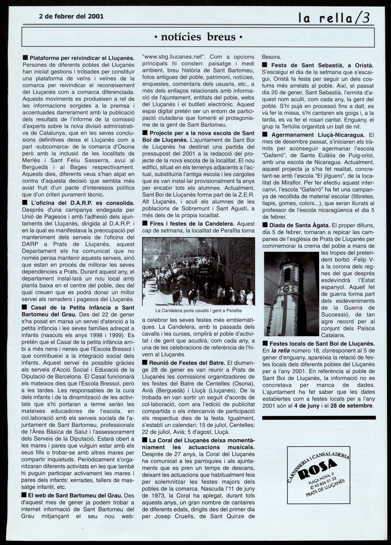 • Reunió de Festes del Batre. El diumenge 28 de gener es van reunir a Prats de Lluçanès les comissions organitzadores de les festes del Batre de Centelles (Osona), Avià (Berguedà) Lluçà (Lluçanès). De la trobada en van sortir un seguit d'acords de col-laboració, com ara l'edició de publicitat compartida a els intercanvis de participació els respectius dies de la festa. Igualment, s'establí un calendari: 15 de juliol, Centelles; 22 de juliol, Avià; 5 d'agost, Lluçà.
