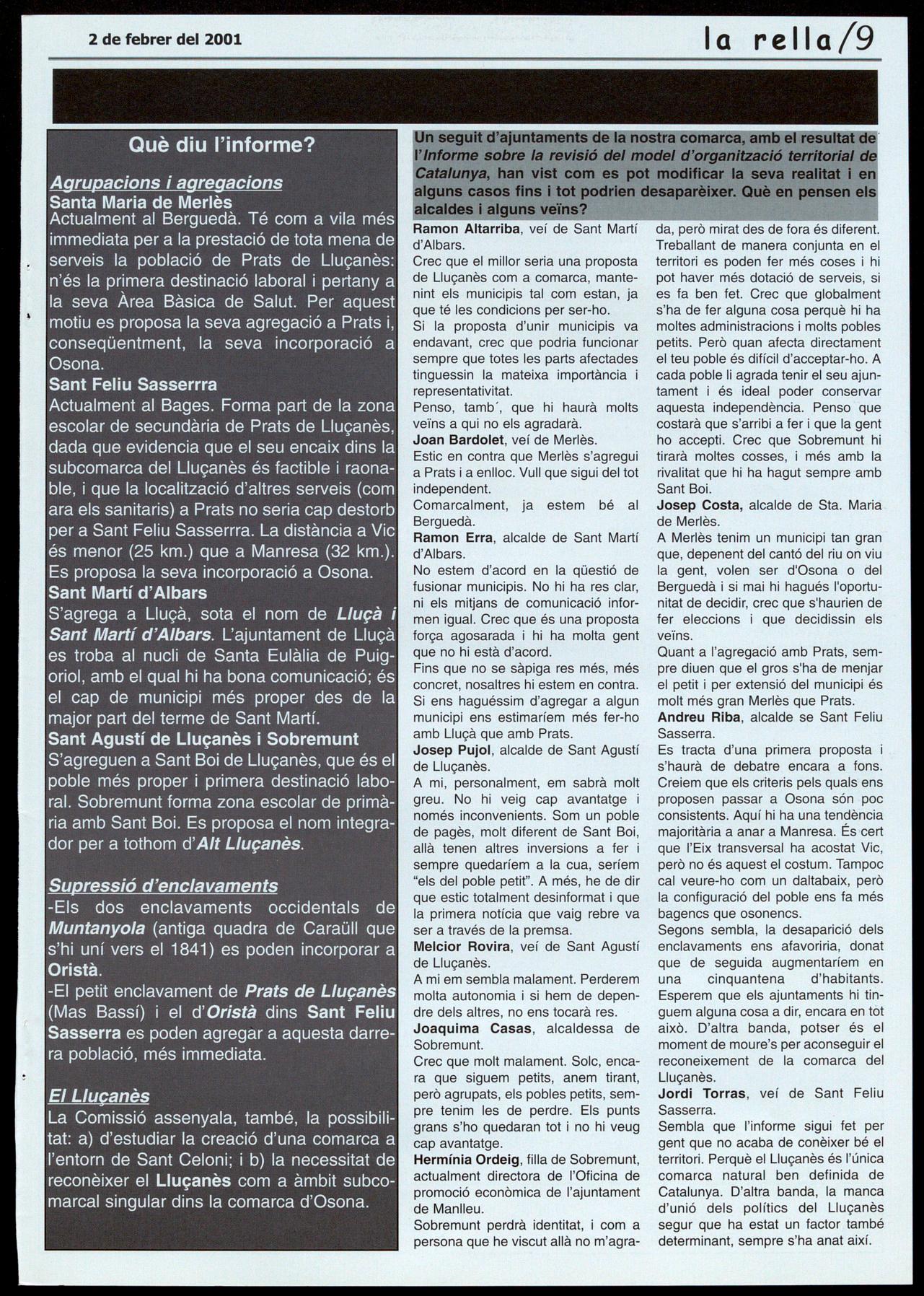 Jordi Torras, veí de Sant Feliu Sasserra. Sembla que l'informe sigui fet per gent que no acaba de conèixer bé el territori. Perquè el Lluçanès és l'única comarca natural ben definida de Catalunya. D'altra banda, la manca d'unió dels polítics del Lluçanès segur que ha estat un factor també determinant, sempre s'ha anat així.