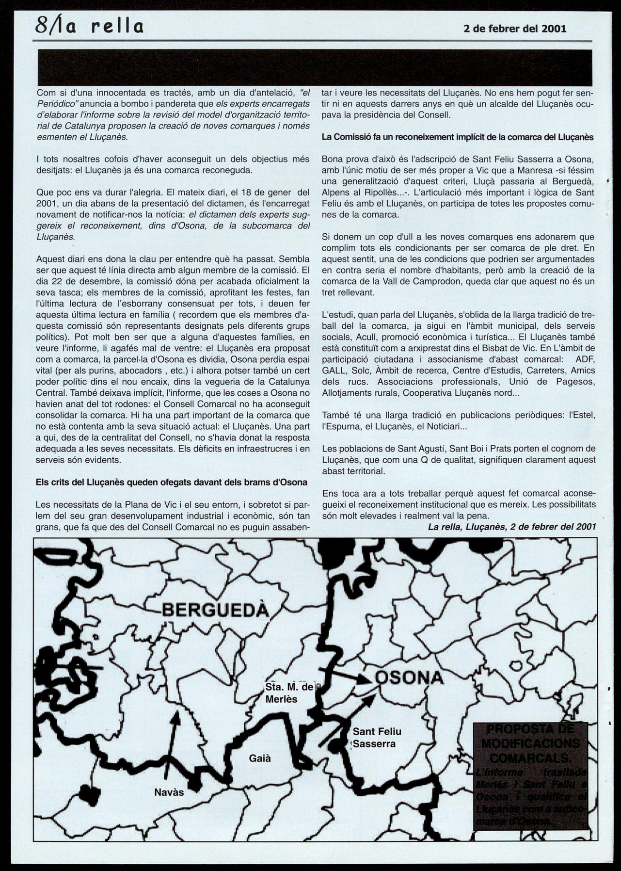 Que poc ens va durar l'alegria. El mateix diari, el 18 de gener del 2001, un dia abans de la presentació del dictamen, és l'encarregat novament de notificar-nos la notícia: el dictamen dels experts suggereix el reconeixement, dins d'Osona, de la subcomarca del Lluçanès.