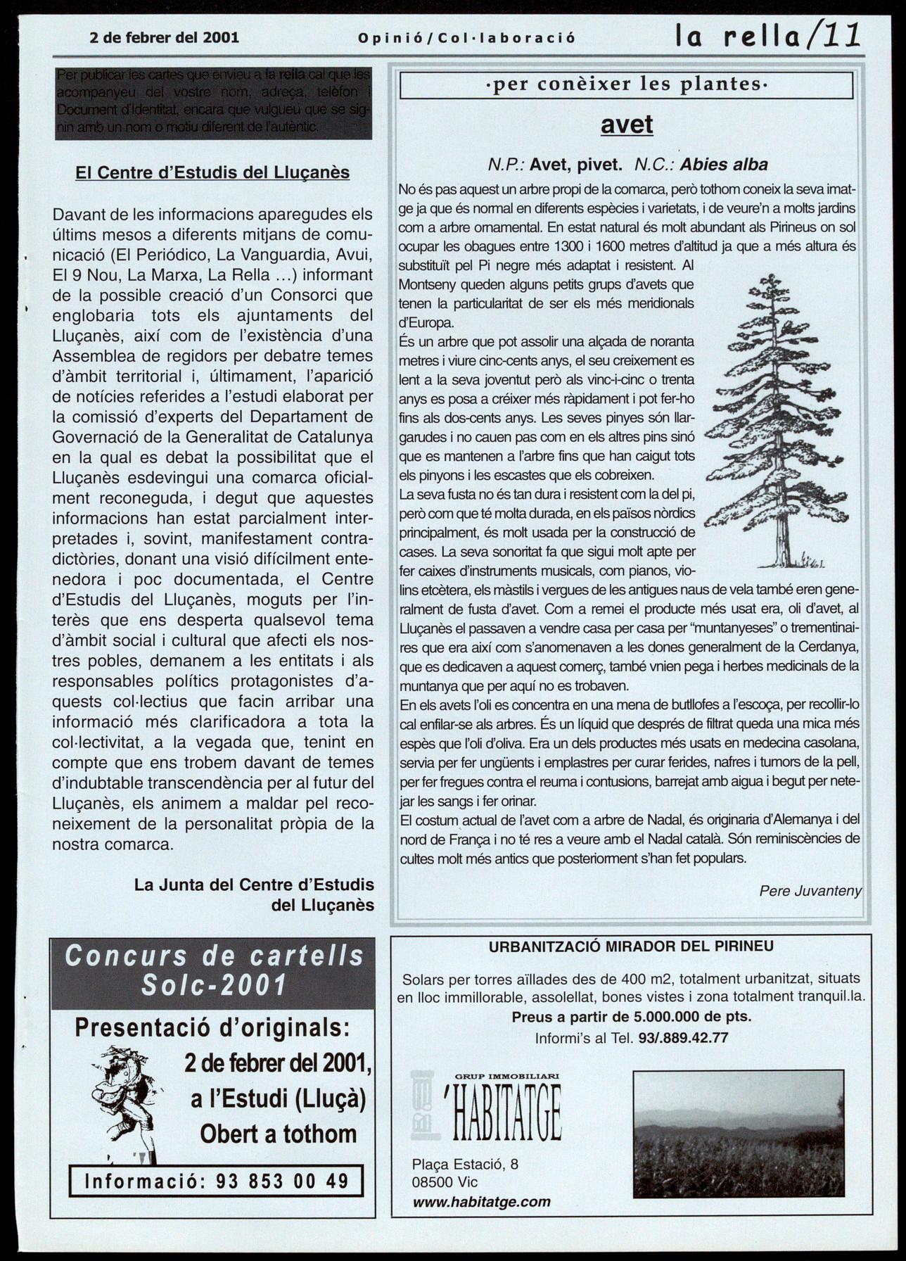 Davant de les informacions aparegudes els últims mesos a diferents mitjans de comunicació (El Periódico, La Vanguardia, Avui, EI9 Nou, La Marxa, La Rella ) informant de la possible creació d'un Consorci que englobaria tots els ajuntaments del Lluçanès, així com de l'existència d'una Assemblea de regidors per debatre temes d'àmbit territorial i, últimament, l'aparició de notícies referides a l'estudi elaborat per la comissió d'experts del Departament de Governació de la Generalitat de Catalunya en la qual es debat la possibilitat que el Lluçanès esdevingui una comarca oficialment reconeguda, degut que aquestes informacions han estat parcialment interpretades i, sovint, manifestament contradictòries, donant una visió difícilment entenedora poc documentada, el Centre d'Estudis del Lluçanès, moguts per l'interès que ens desperta qualsevol tema d'àmbit social cultural que afecti els nostres pobles, demanem a les entitats als responsables polítics protagonistes d'aquests col-lectius que facin arribar una informació més clarificadora a tota la col-Iectivitat, a la vegada que, tenint en compte que ens trobem davant de temes d'indubtable transcendència per al futur del Lluçanès, els animem a maldar pel reconeixement de la personalitat pròpia de la nostra comarca.