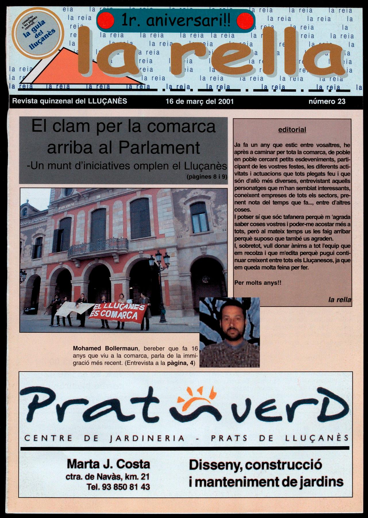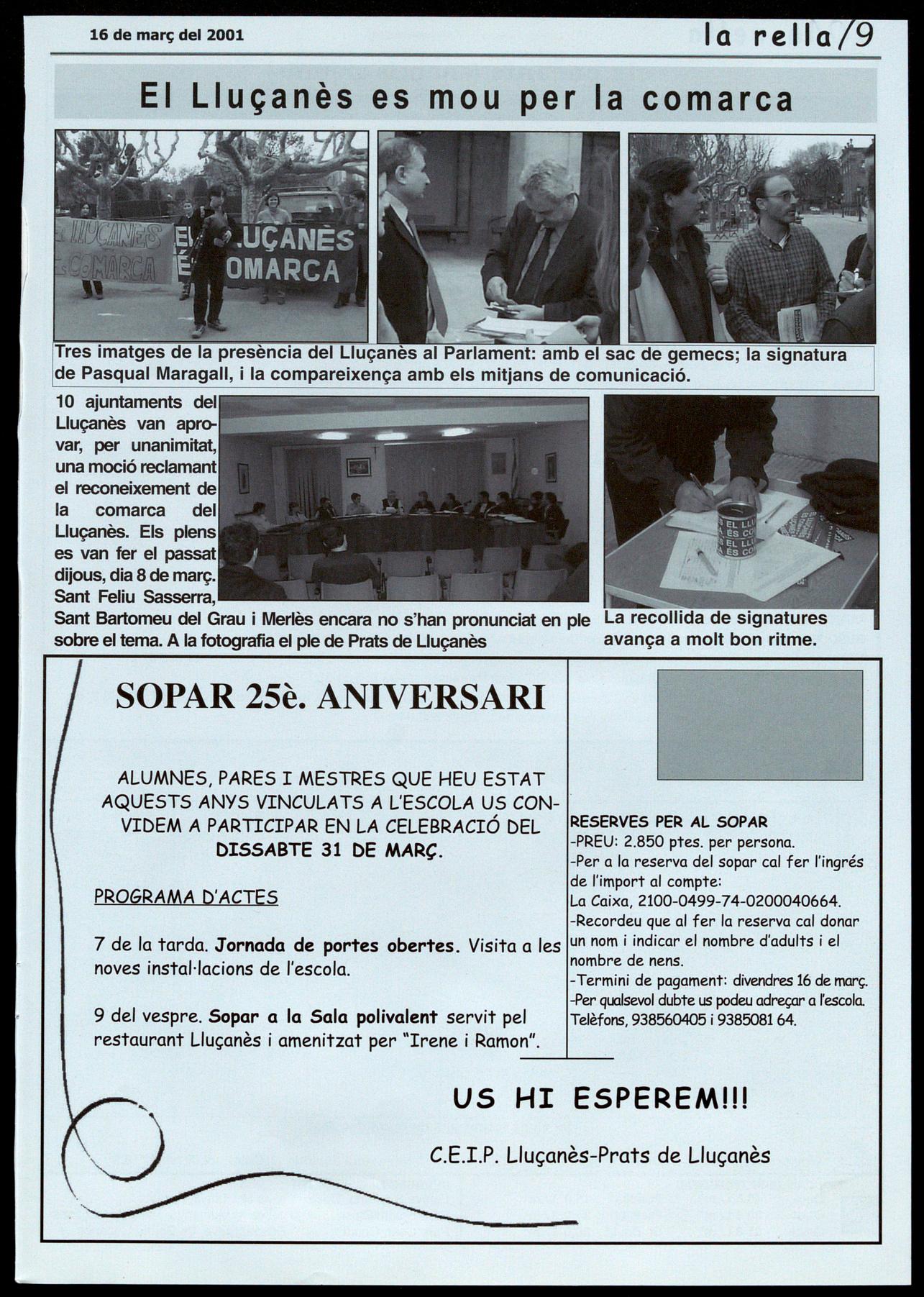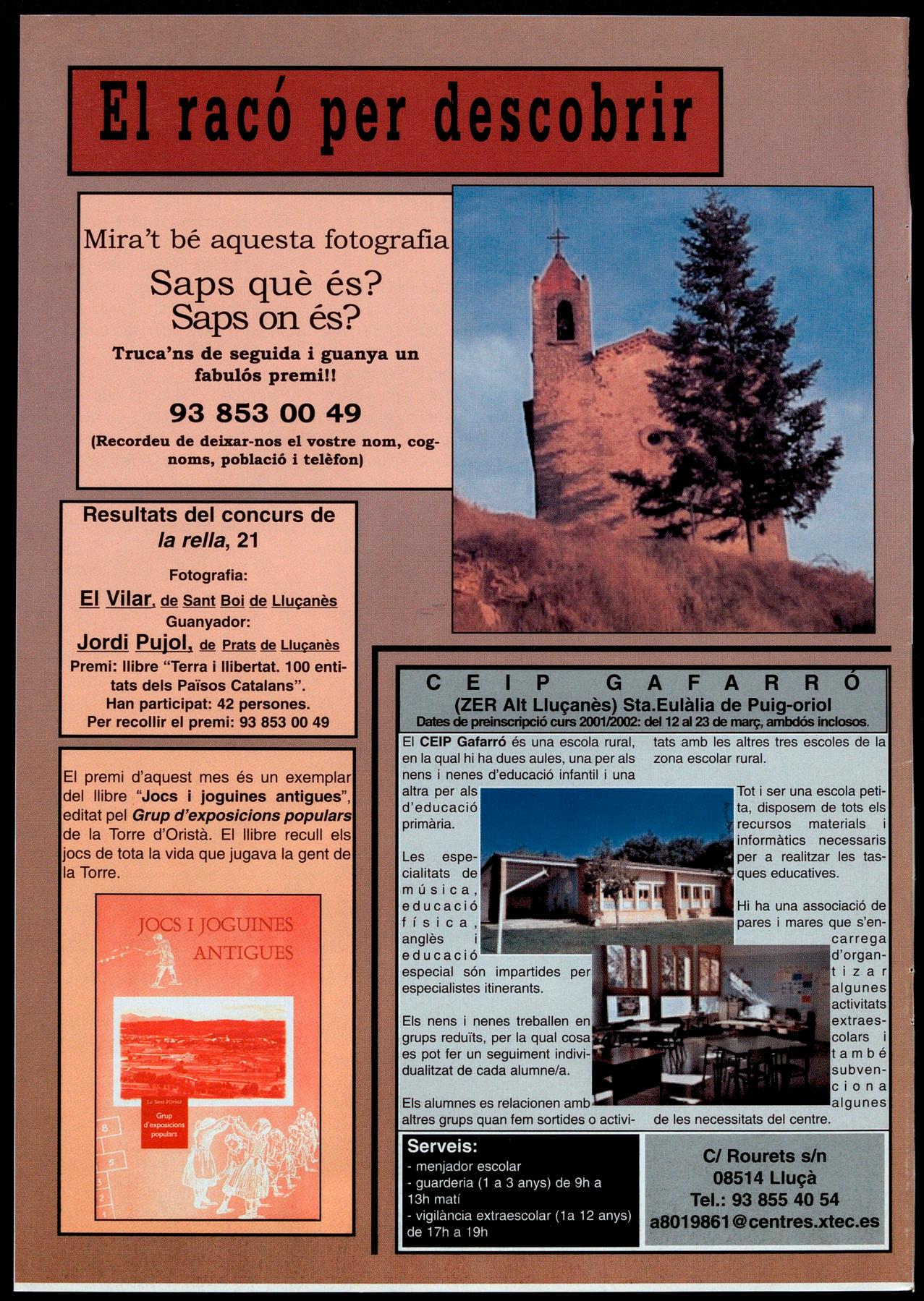 L'Estudi-L1uçà- 1 r. Aniversari de /a rella. A partir de les 7 del vespre, lliurament del premi del concurs de cartells Solc-2oo1 celebració del1 r. aniversari de la revista, amb pastes, cava i música.
