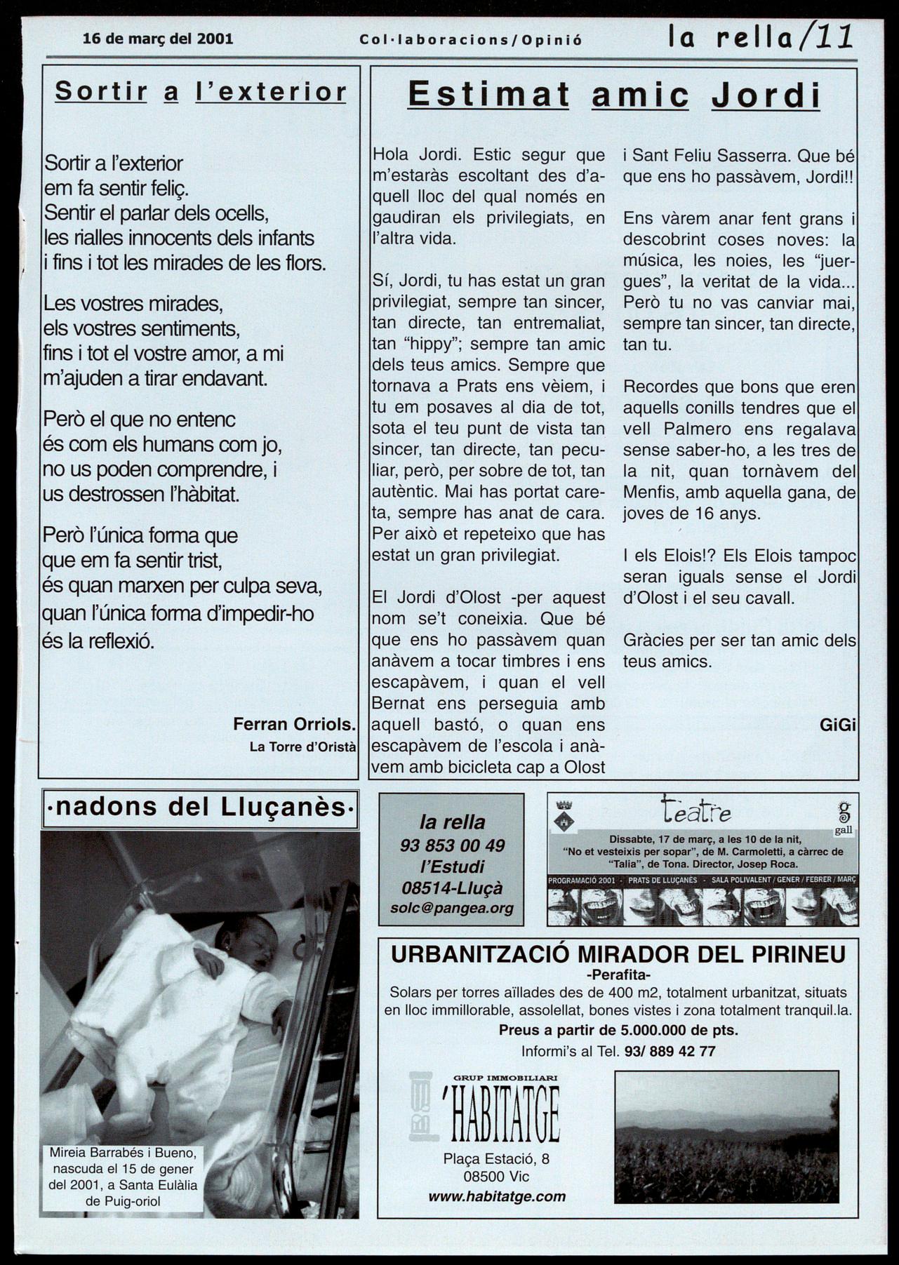 El Jordi d'Olost -per aquest nom se't coneixia. Que bé que ens ho passàvem quan anàvem a tocar timbres i ens escapàvem, quan el vell Bernat ens perseguia amb aquell bastó, a quan ens escapàvem de l'escola i anàvem amb bicicleta cap a Olost