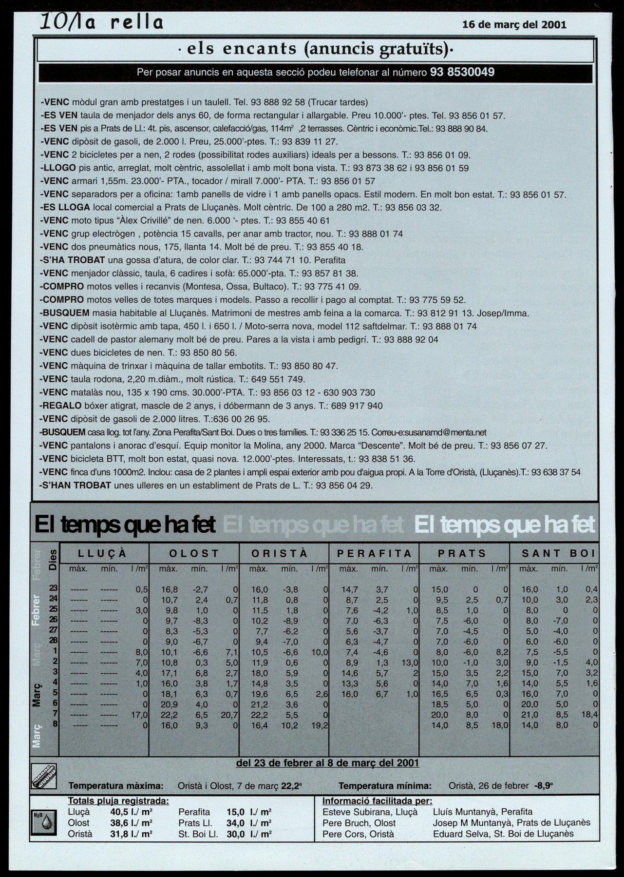 • Informadors forestals. Com ja ve fent els darrers anys, la Diputació de Barcelona promou el Pla de vigilància complementària 2001 per a l'àmbit forestal. El període d'aplicació del Pla serà entre el 15 de juny el 17 de setembre. De moment, I'esmantada institució ha fet arribar als ajuntaments la informació per al procés de selecció dels informadors. El Lluçanès compta amb un seguit d'unitats ruta, que són Oristà-Sant Feliu Sasserra; Sobremunt-Sant Bartomeu del Grau; Olost-Prats de Lluçanès-Sant Martí d'Albars; Lluçà; Sant Agustí de LluçanèsPerafita-Sant Boi de Lluçanès, AlpensSora. Les sol-licituds per ocupar les places d'informadors han d'haver-se validat abans del 19 de març. Per informació cal posar-se en contacte amb els ajuntaments.