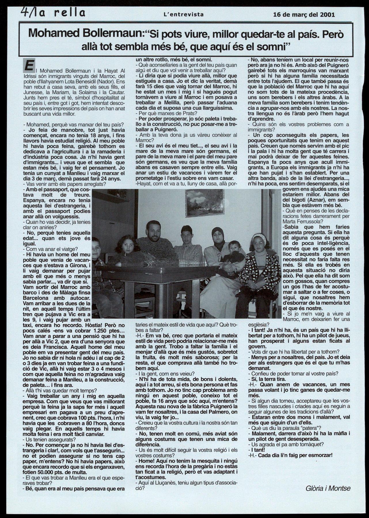 - N'hi ha de tota mida, de bons i dolents, aquí i a tot arreu, si ets bona persona et fas amb tothom. Jo no tinc cap problema amb ningú en aquest poble, coneixo tot el poble, fa 16 anys que sóc aquí, m'entens? Aquesta nau nova de la fàbrica Puigneró la vam fer nosaltres, i la casa del Palmera, on viu, la vaig fer jo - Creieu que la vostra cultura i la nostra són tan diferents?