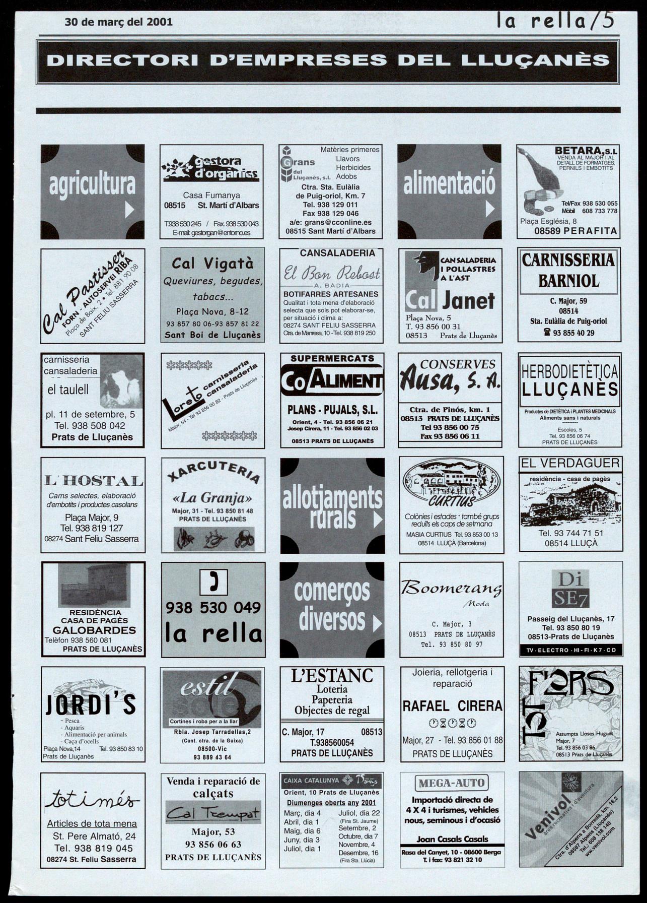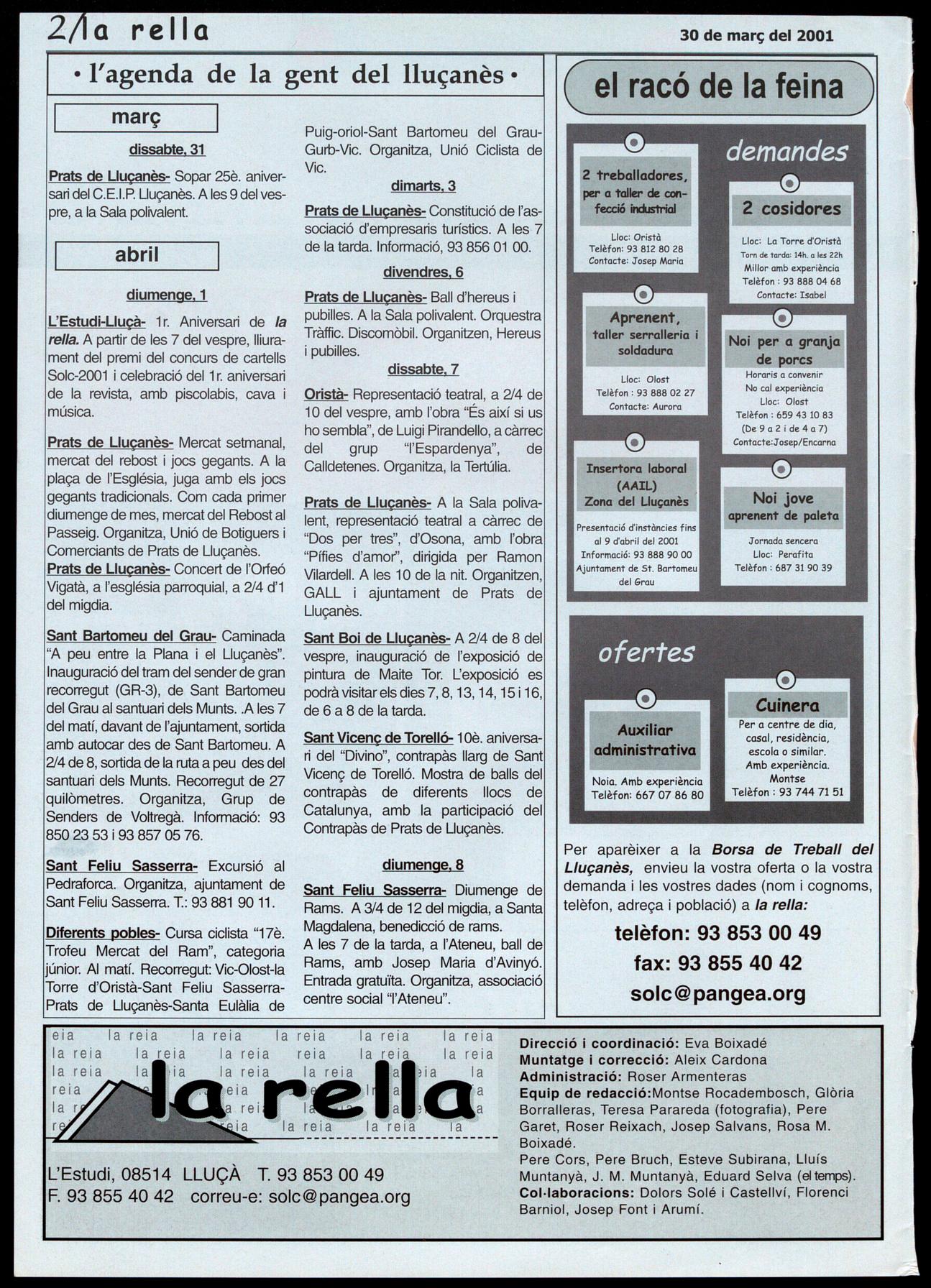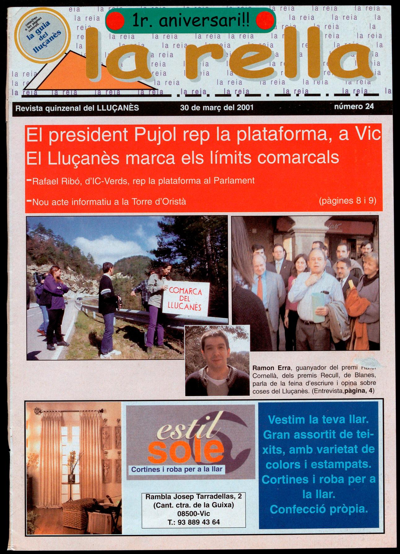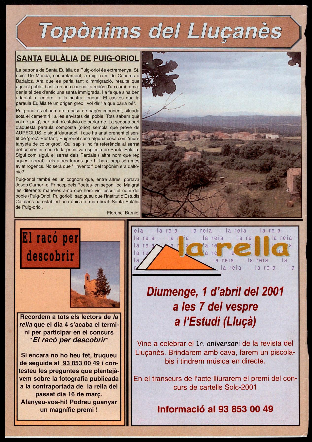 L'Estudi-Lluçà- 1 r. Aniversari de la rel/a. A partir de les 7 del vespre, lliurament del premi del concurs de cartells Solc-2001 i celebració del 1 r. aniversari de la revista, amb piscolabis, cava música.