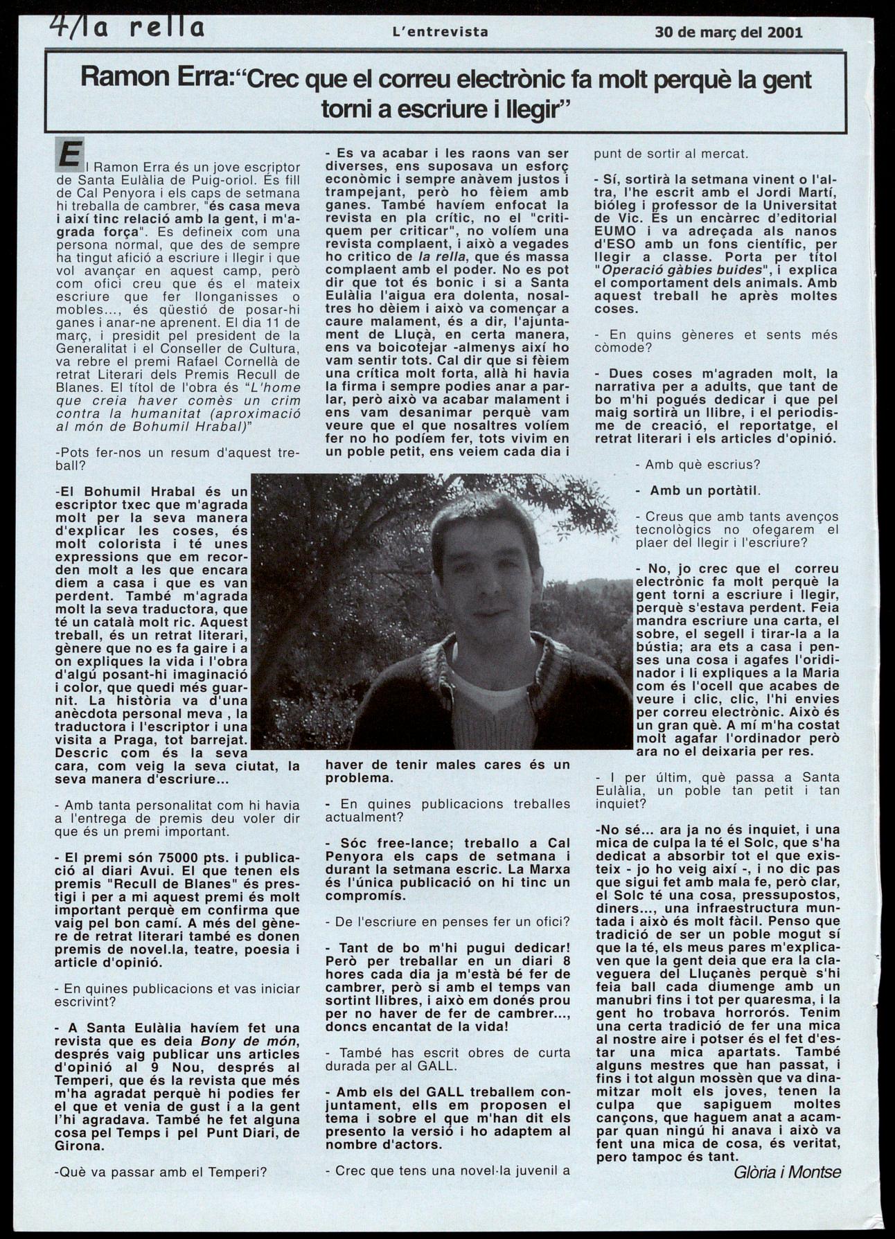 Ramon Erra és un jove escriptor de Santa Eulàlia de Puig-oriol. Es fill de Cal Penyora els caps de setmana hi treballa de cambrer, "és casa meva i així tinc relació amb la gent, i m'agrada força". Es defineix com una persona normal, que des de sempre ha tingut afició a escriure llegir que vol avançar en aquest camp, però com ofici creu que és el mateix escriure que fer llonganisses o mobles és qüestió de posar-hi ganes i anar-ne aprenent. El dia 11 de març, presidit pel president de la Generalitat el Conseller de Cultura, va rebre el premi Rafael Cornellà de retrat Literari dels Premis Recull de Blanes. El títol de l'obra és UL 'home que creia haver comès un crim contra la humanitat (aproximació al món de Bohumil Hrabal)"