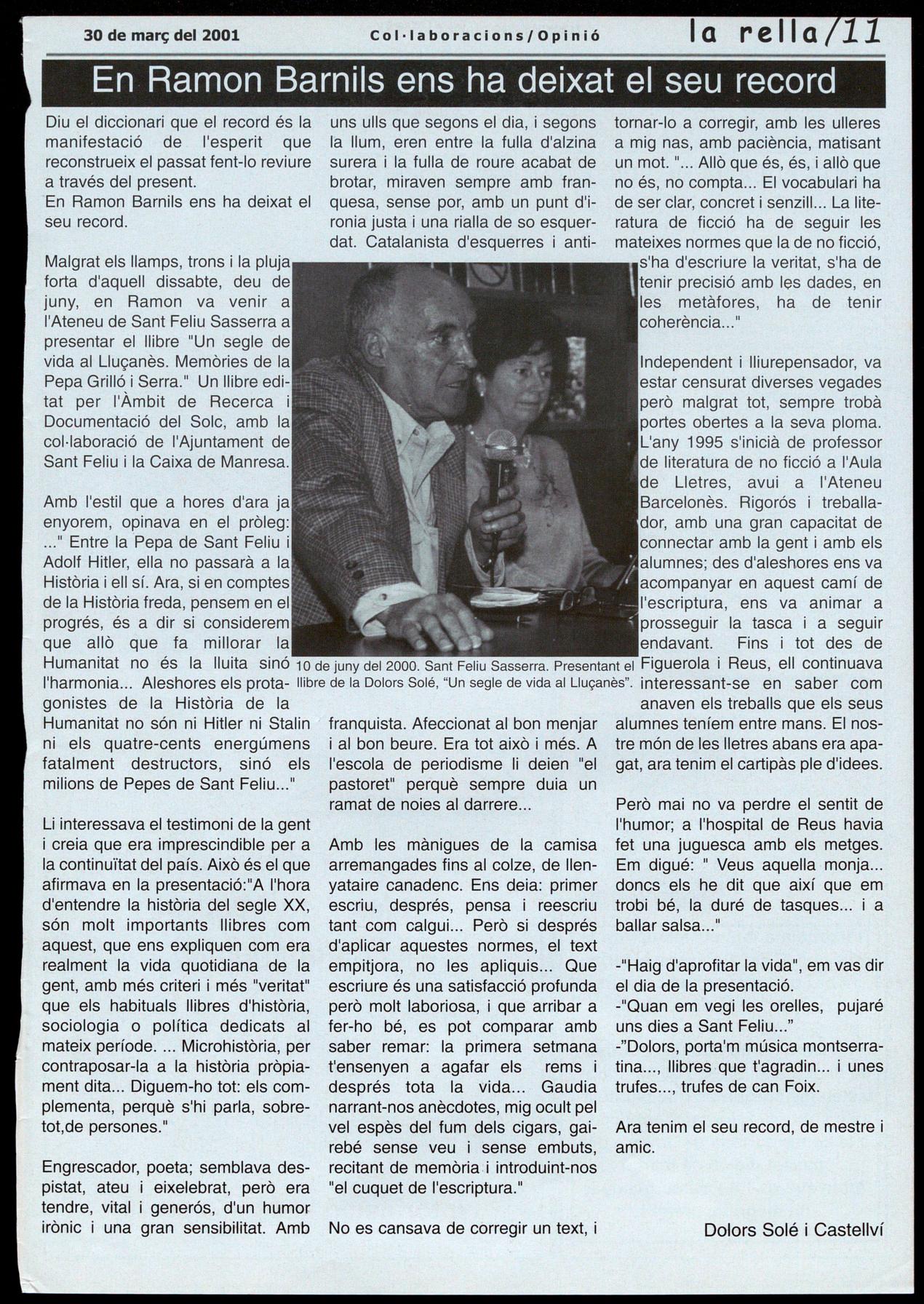 de Lletres, avui a l'Ateneu Amb l'estil que a hores d'ara ja Barcelonès. Rigorós i treballaenyorem, opinava en el pròleg: dar, amb una gran capacitat de Entre la Pepa de Sant Feliu connectar amb la gent i amb els Adolf Hitler, ella no passarà a la alumnes; des d'aleshores ens va Història i ell sí. Ara, si en comptes acompanyar en aquest camí de de la Història freda, pensem en el l'escriptura, ens va animar a progrés, és a dir si considerem prosseguir la tasca a seguir que allò que fa millorar la endavant. Fins i tot des de Humanitat no es la lluita sinó 10 de juny de12000. Sant Feliu Sasserra. Presentant el Figuerola Reus, ell continuava l'harmonia Aleshores els prota- llibre deia Dolors Solé, "Un segle de vida al Lluçanès". interessant-se en saber com gonistes de la Història de la anaven els treballs que els seus Humanitat no són ni Hitler ni Stalin ; franquista. Afeccionat al bon menjar alumnes teníem entre mans. El nosni els quatre-cents energúmens i al bon beure. Era tot això més. A tre món de les lletres abans era apafatalment destructors, sinó els l'escola de periodisme li deien "el gat, ara tenim el cartipàs ple d'idees. milions de Pepes de Sant Feliu pastoret" perquè sempre duia un ramat de noies al darrere