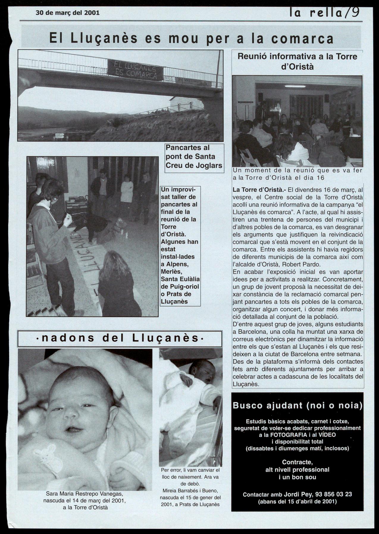 La Torre d'Oristà.- El divendres 16 de març, al vespre, el Centre social de la Torre d'Oristà acollí una reunió informativa de la campanya "el Lluçanès és comarca". A l'acte, al qual hi assistiren una trentena de persones del municipi d'altres pobles de la comarca, es van desgranar els arguments que justifiquen la reivindicació comarcal que s'està movent en el conjunt de la comarca. Entre els assistents hi havia regidors de diferents municipis de la comarca així com l'alcalde d'Oristà, Robert Pardo. En acabar l'exposició inicial es van aportar idees per a activitats a realitzar. Concretament, un grup de jovent proposà la necessitat de deixar constància de la reclamació comarcal penjant pancartes a tots els pobles de la comarca, organitzar algun concert, i donar més informació detallada al conjunt de la població. D'entre aquest grup de joves, alguns estudiants a Barcelona, una colla ha muntat una xarxa de correus electrònics per dinamitzar la informació entre els que s'estan al Lluçanès els que resideixen a la ciutat de Barcelona entre setmana. Des de la plataforma s'informà dels contactes fets amb diferents ajuntaments per arribar a celebrar actes a cadascuna de les localitats del