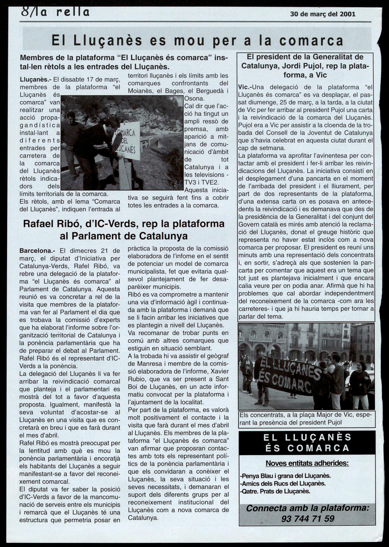 Vic.-Una delegació de la plataforma "el Lluçanès és comarca" es va desplaçar, el passat diumenge, 25 de març, a la tarda, a la ciutat de Vic per fer arribar al president Pujol una carta la reivindicació de la comarca del Lluçanès. Pujol era a Vic per assistir a la cloenda de la trobada del Consell de la Joventut de Catalunya que s'havia celebrat en aquesta ciutat durant el cap de setmana.