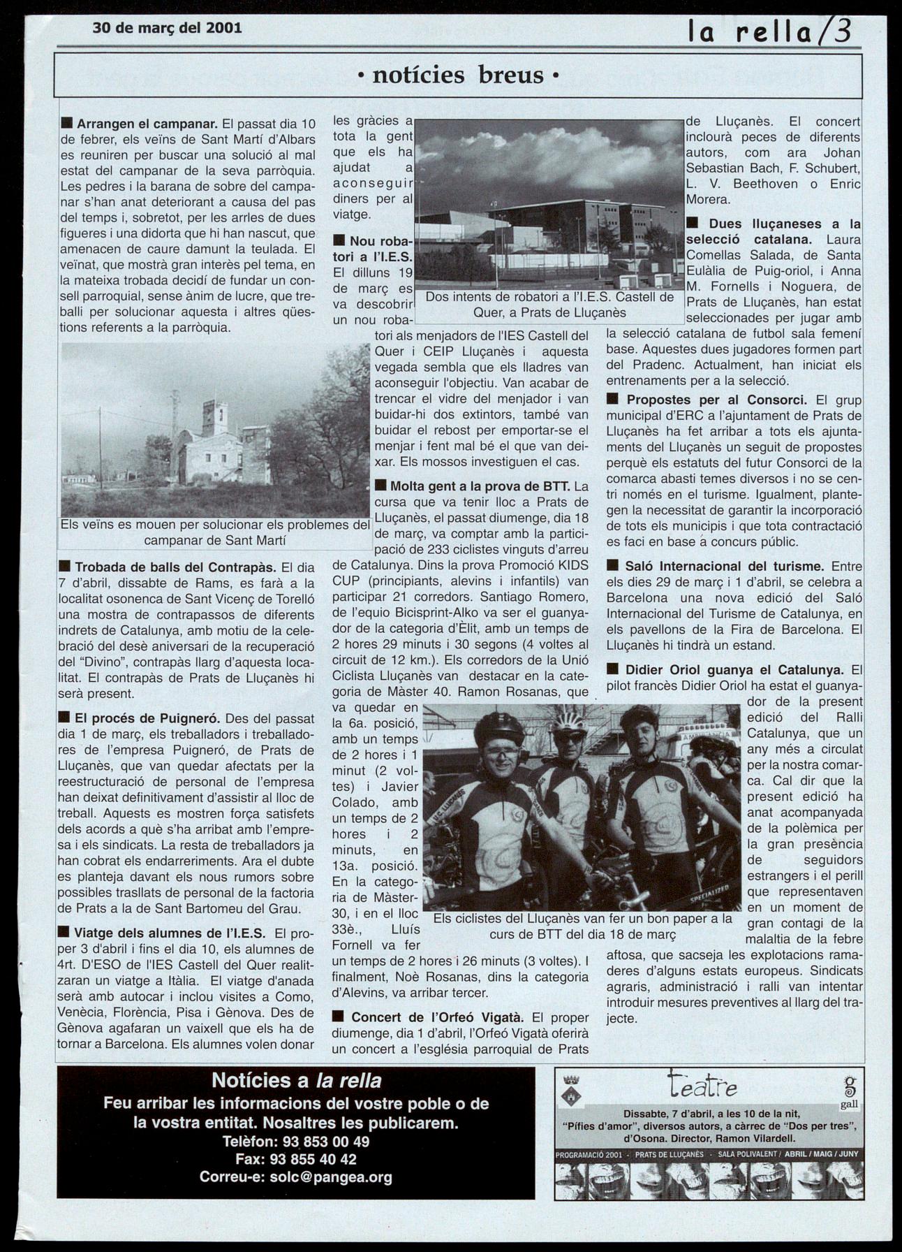 - Es va acabar i les raons van ser diverses, ens suposava un esforç econòmic i sempre anàvem justos trampejant, però ho fèiem amb ganes. També havíem enfocat la revista en pla crític, no el "critiquem per criticar", no volíem una revista complaent, i això a vegades ho critico de la rella, que és massa complaent amb el poder. No es pot dir que tot és bonic i si a Santa Eulàlia l'aigua era dolenta, nosaltres ho dèiem i això va començar a caure malament, és a dir, l'ajuntament de Lluçà, en certa manera, ens va boicotejar -almenys així ho vam sentir tots. Cal dir que si fèiem una crítica molt forta, allà hi havia la firma i sempre podies anar a parlar, però això va acabar malament i ens vam desanimar perquè vam veure que el que nosaltres volíem fer no ho podíem fer, tots vivim en un poble petit, ens veiem cada dia i