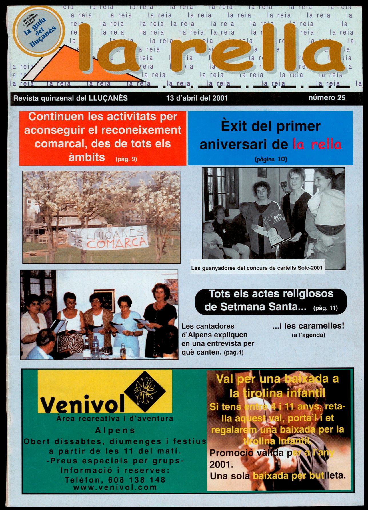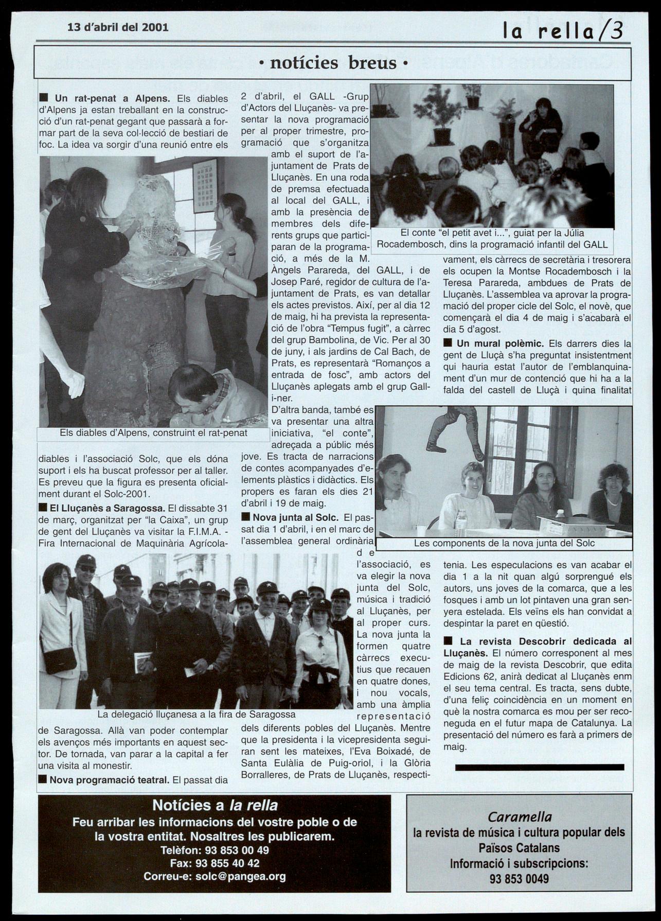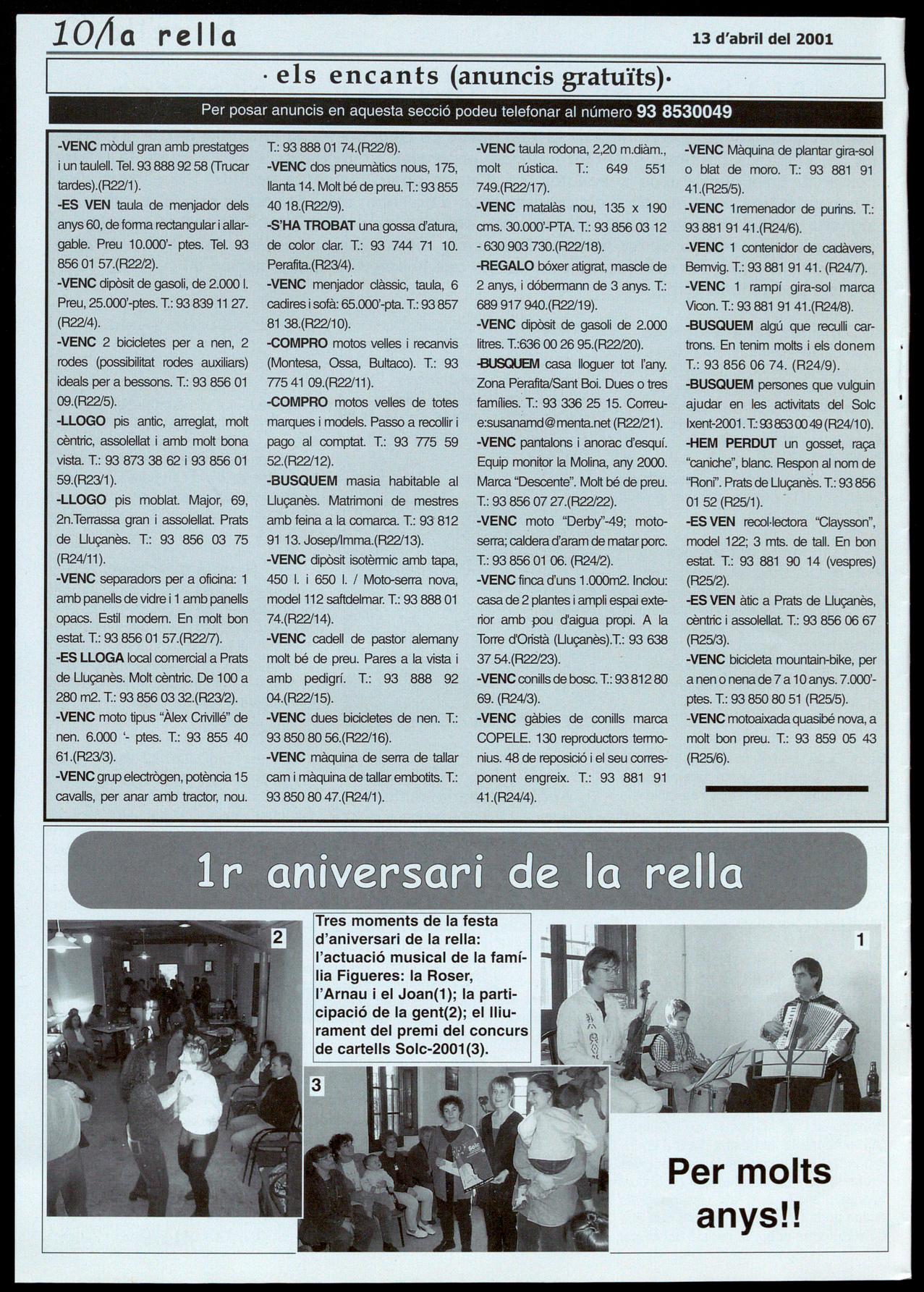 1 d'aniversari de la rella: l'actuació musical de la família Figueres: la Roser, I'Arnau i el Joan(1); la participació de la gent(2); el lliurament del premi del concurs de cartells Solc-2001 (3). Per molts