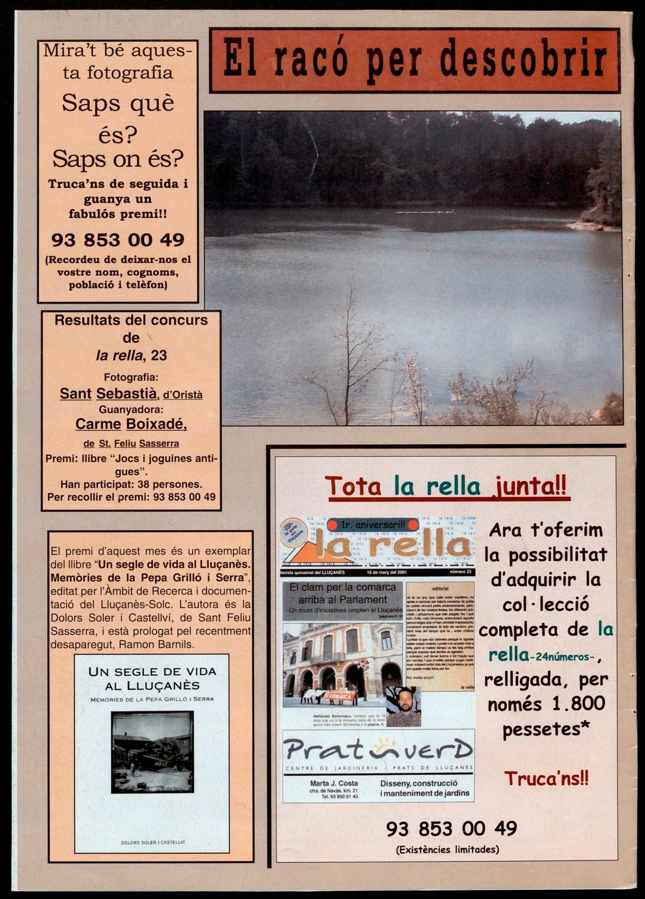 El premi d'aquest mes és un exemplar del llibre "Un segle de vida al Lluçanès. Memòries de la Pepa Grilló i Serra", editat per I'Àmbit de Recerca i documentació del Lluçanès-Solc. L'autora és la Dolors Soler i Castellví, de Sant Feliu Sasserra, està prologat pel recentment desaparegut, Ramon Barnils.
