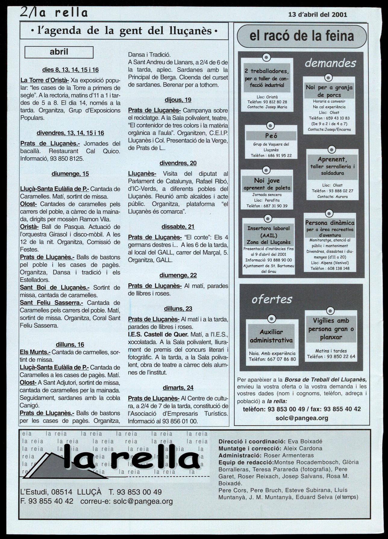 Per aparèixer a la Borsa de Treball del Lluçanès, envieu la vostra oferta o la vostra demanda i les vostres dades (nom i cognoms, telèfon, adreça població) a la rella: telèfon: 938530049/ fax: 938554042 solc@pangea.org e