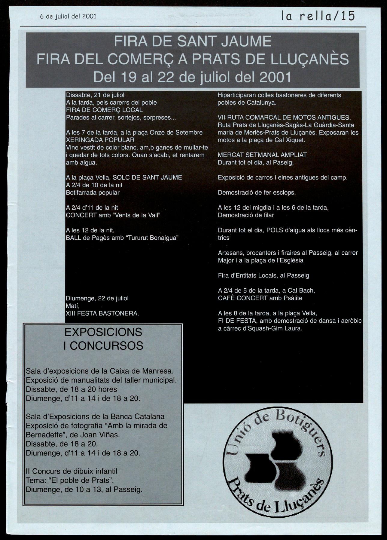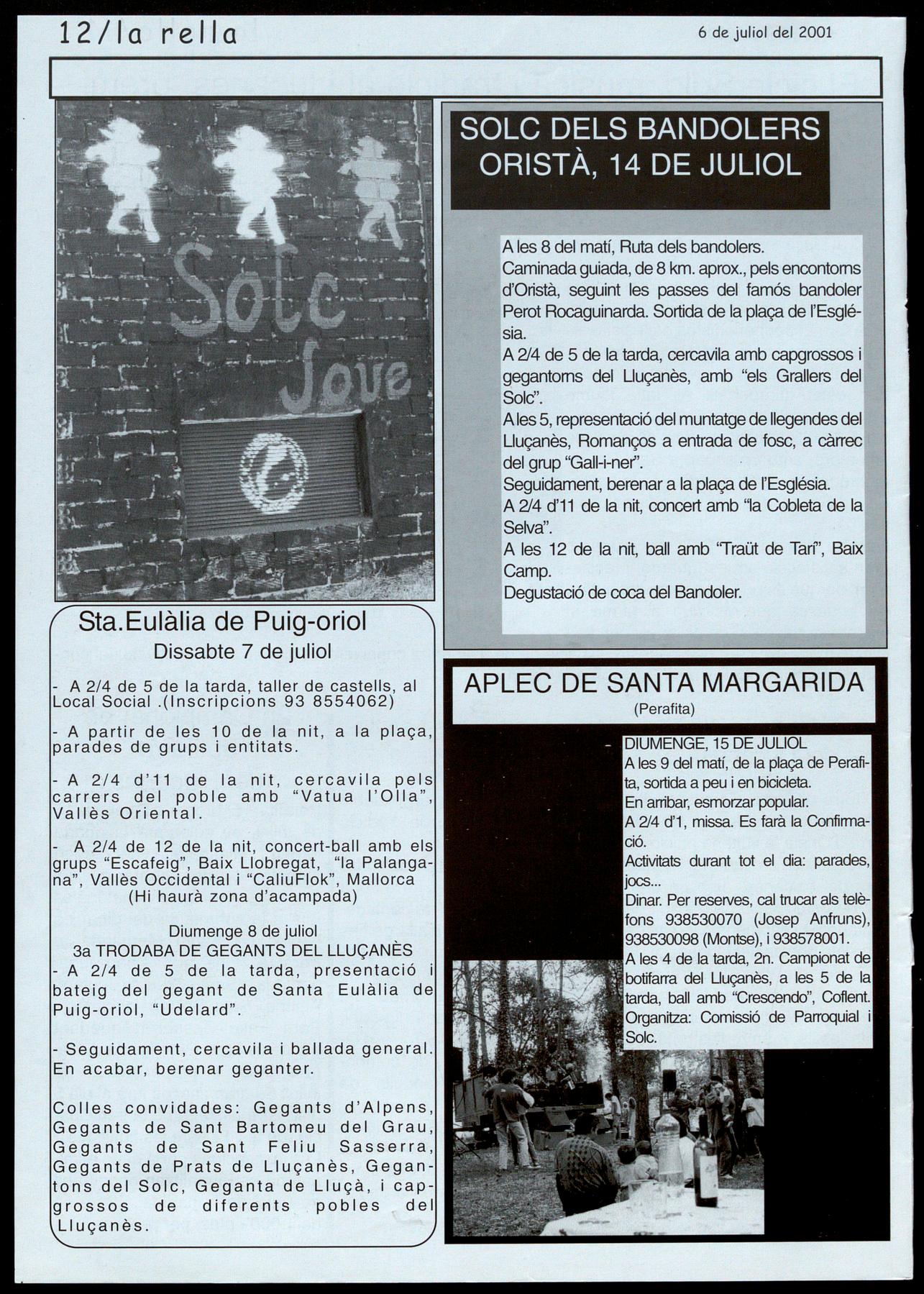 Oristà- Solc dels Bandolers. A les 8 del matí, Ruta deis bandolers. Caminada guiada, de 8 Km. aprox., pels encontoms d'Oristà, seguint les passes del famós bandoler Perot Rocaguinarda. A 2/4 de 5 de la tarda, cercavila amb capgrossos gegantoms del Uuçanès, amb"els Grallers del Solc".Ales 5, representació del muntatge de llegendes de Uuçanès Romanços a entrada de fosc, a càrrec del grup "Gall-i-ner". Seguidament, berenar a la plaça de l'Església. A2/4d'11 de la nIT, concert amb "la Cobleta de la Selva". A les 12 de la nIT, ball amb 'Traütde Tarí", Baix Camp. Degustació de coca del Bandoler. Organitza, Solc Comissió de Festes. Prats de Uuçanès- 2n Festival de música d'Osona. Jardins de Cal Bach. A2/4 d'11 de la nIT. Concert a càrrec d'un duet acústic, The Unpluggeds. Entrada gratuïta.-