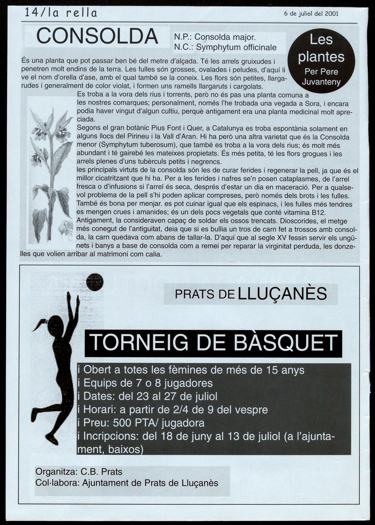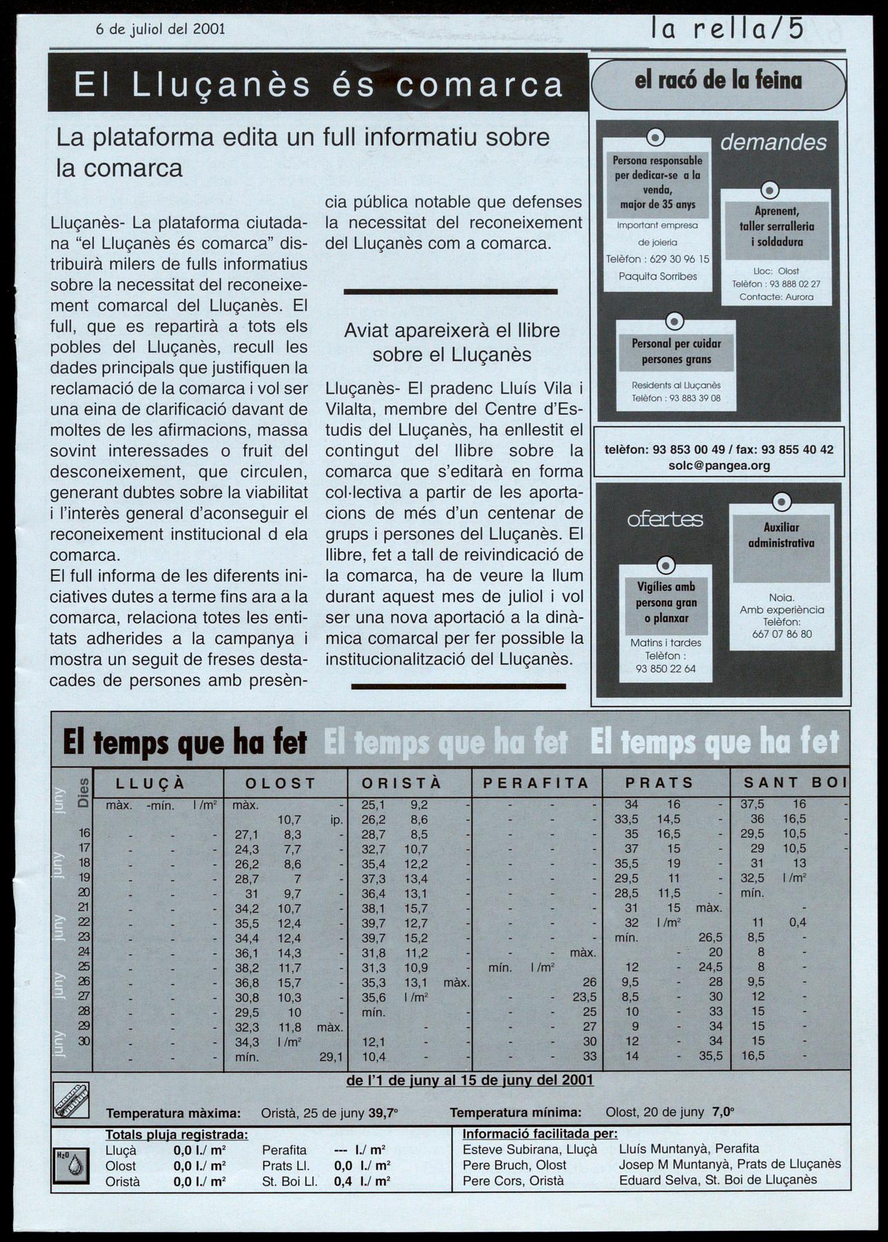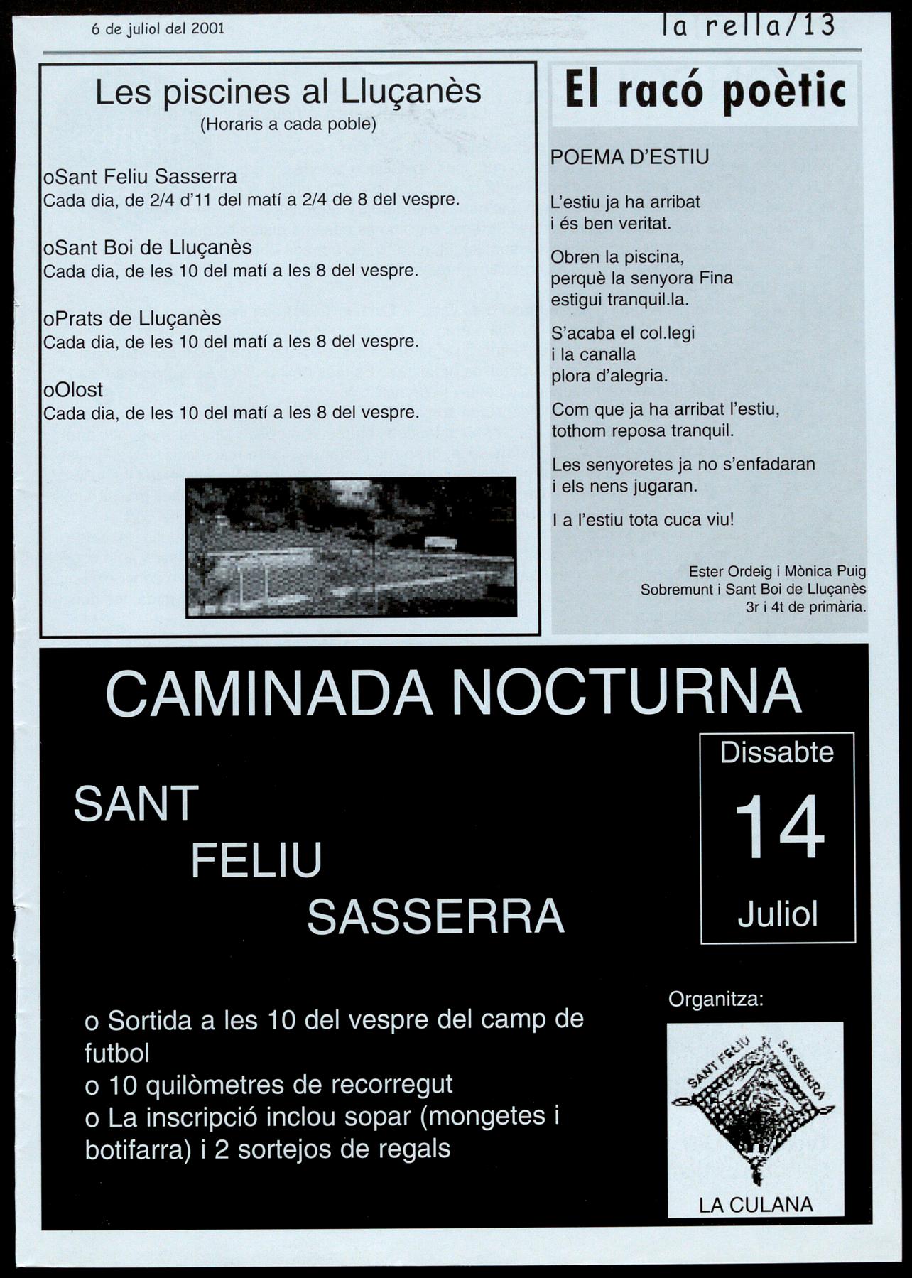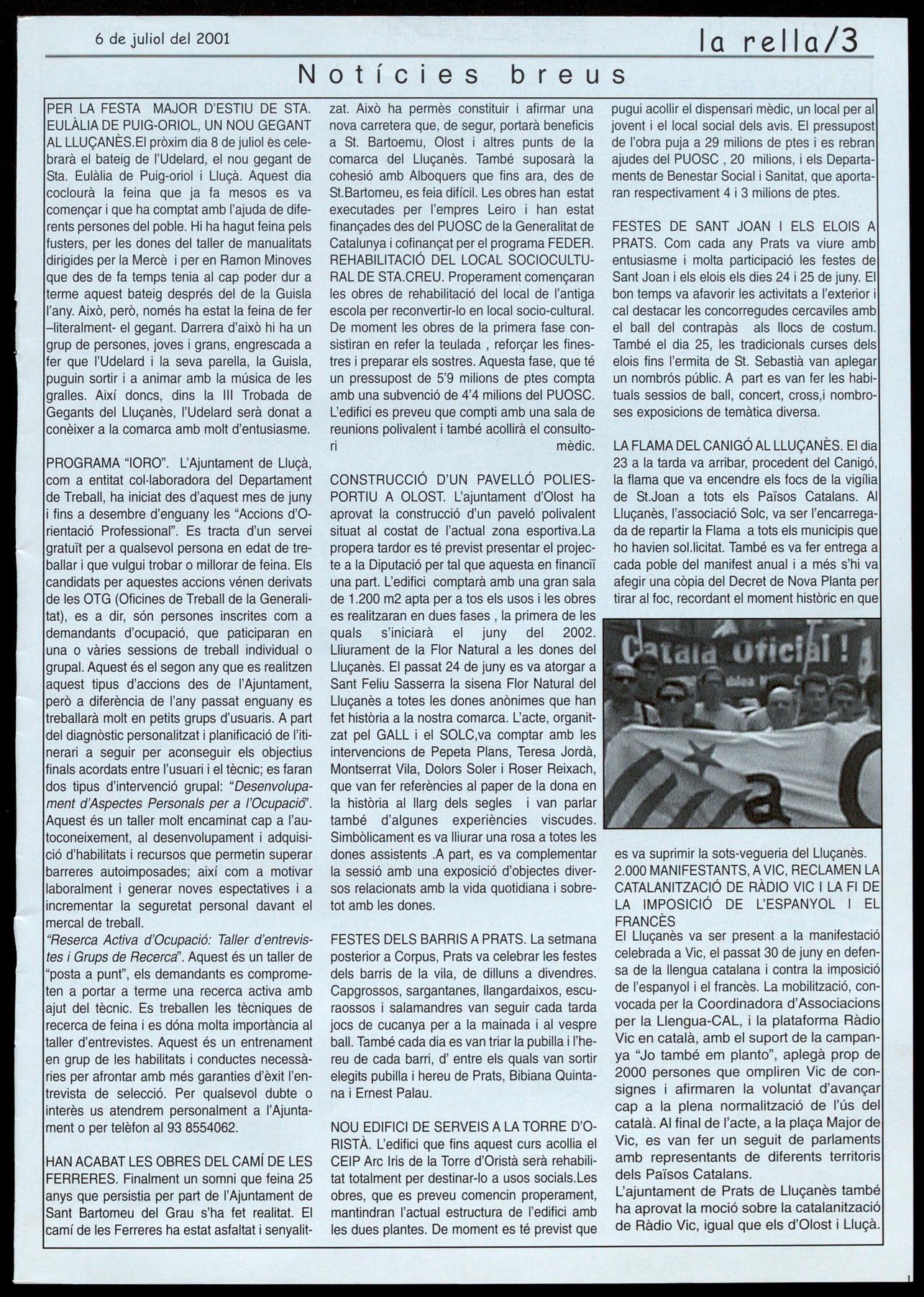 CONSTRUCCiÓ D'UN PAVELLÓ POLIESPORTIU A OLOST. L'ajuntament d'Olost ha aprovat la construcció d'un paveló polivalent situat al costat de l'actual zona esportiva.La propera tardor es té previst presentar el projecte a la Diputació per tal que aquesta en financiï una part. L'edifici comptarà amb una gran sala de 1.200 m2 apta per a tos els usos les obres es realitzaran en dues fases, la primera de les quals s'iniciarà el juny del 2002. Lliurament de la Flor Natural a les dones del Lluçanès. El passat 24 de juny es va atorgar a Sant Feliu Sasserra la sisena Flor Natural del Lluçanès a totes les dones anònimes que han fet història a la nostra comarca. L'acte, organitzat pel GALL el SOLC,va comptar amb les intervencions de Pepeta Plans, Teresa Jordà, Montserrat Vila, Dolors Soler Roser Reixach, que van fer referències al paper de la dona en la història al llarg dels segles van parlar també d'algunes experiències viscudes. Simbòlicament es va lliurar una rosa a totes les dones assistents .A part, es va complementar la sessió amb una exposició d'objectes diversos relacionats amb la vida quotidiana sobretot amb les dones.