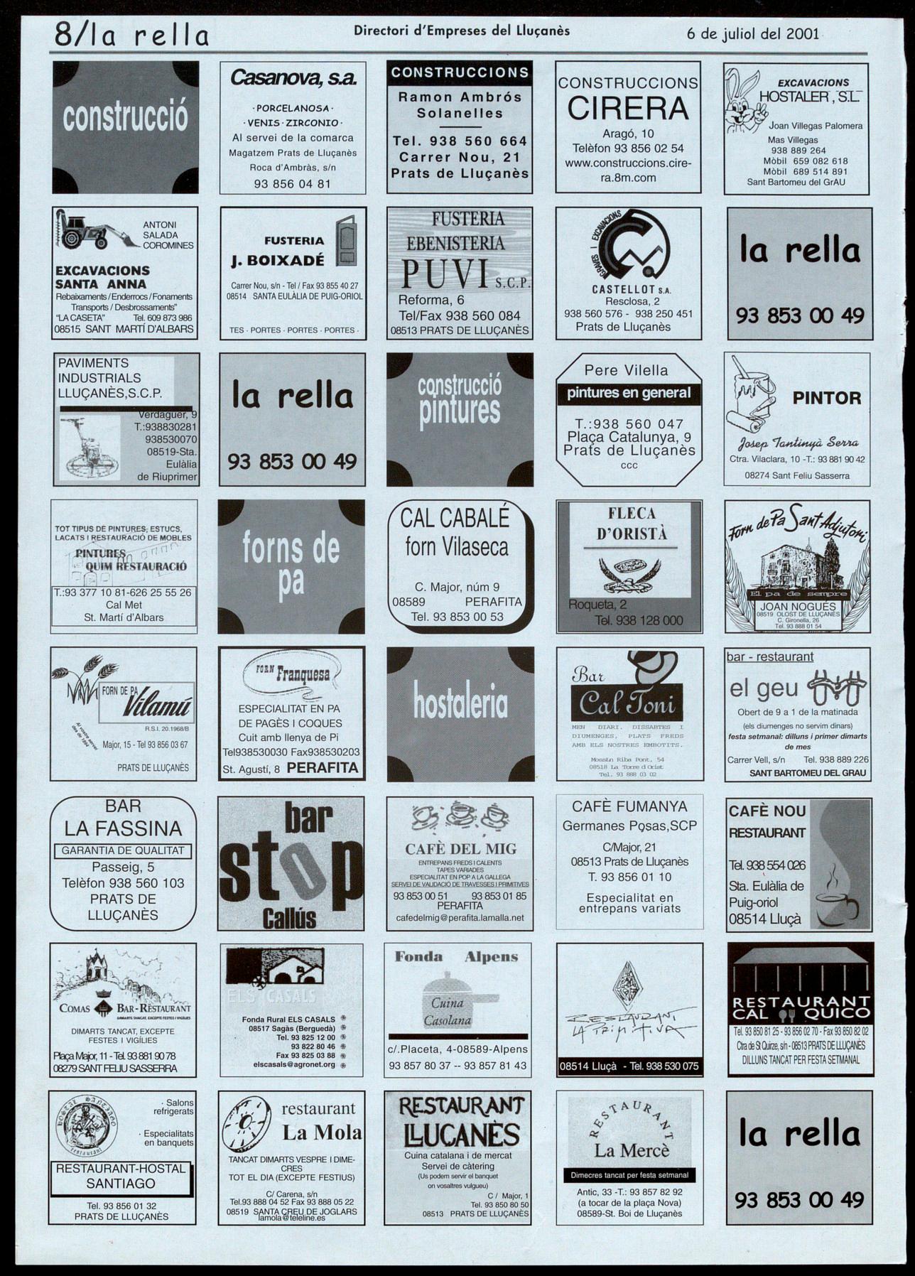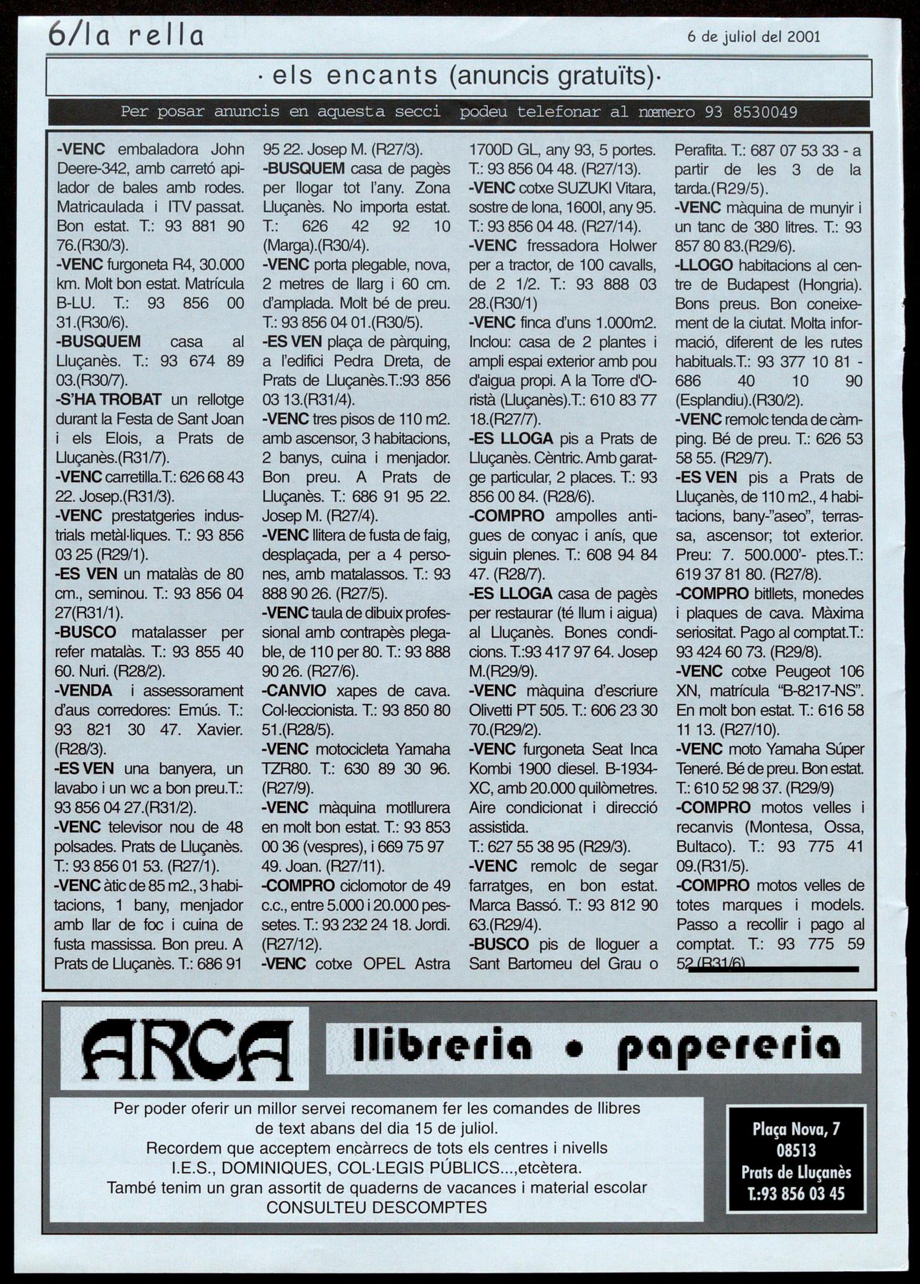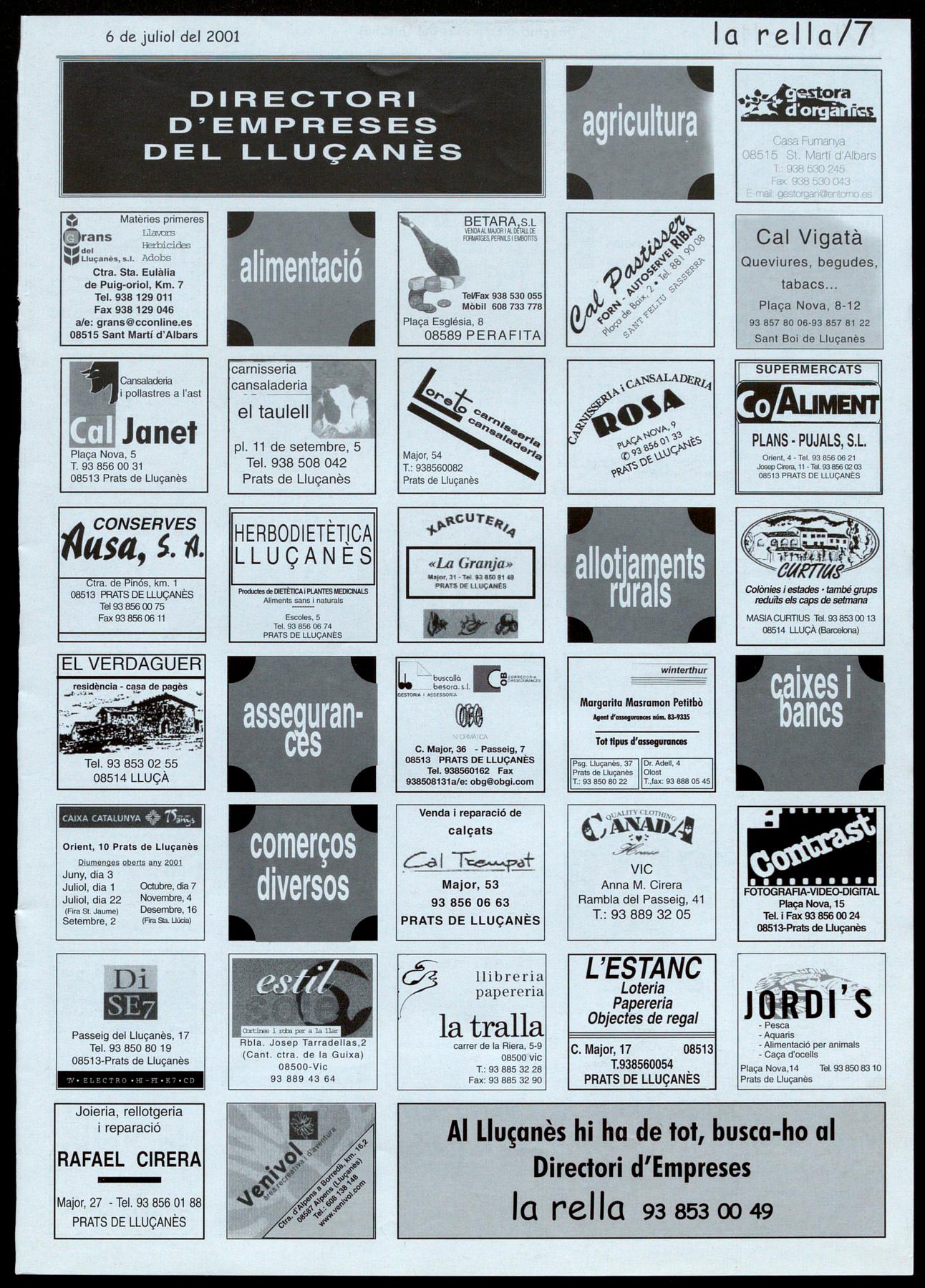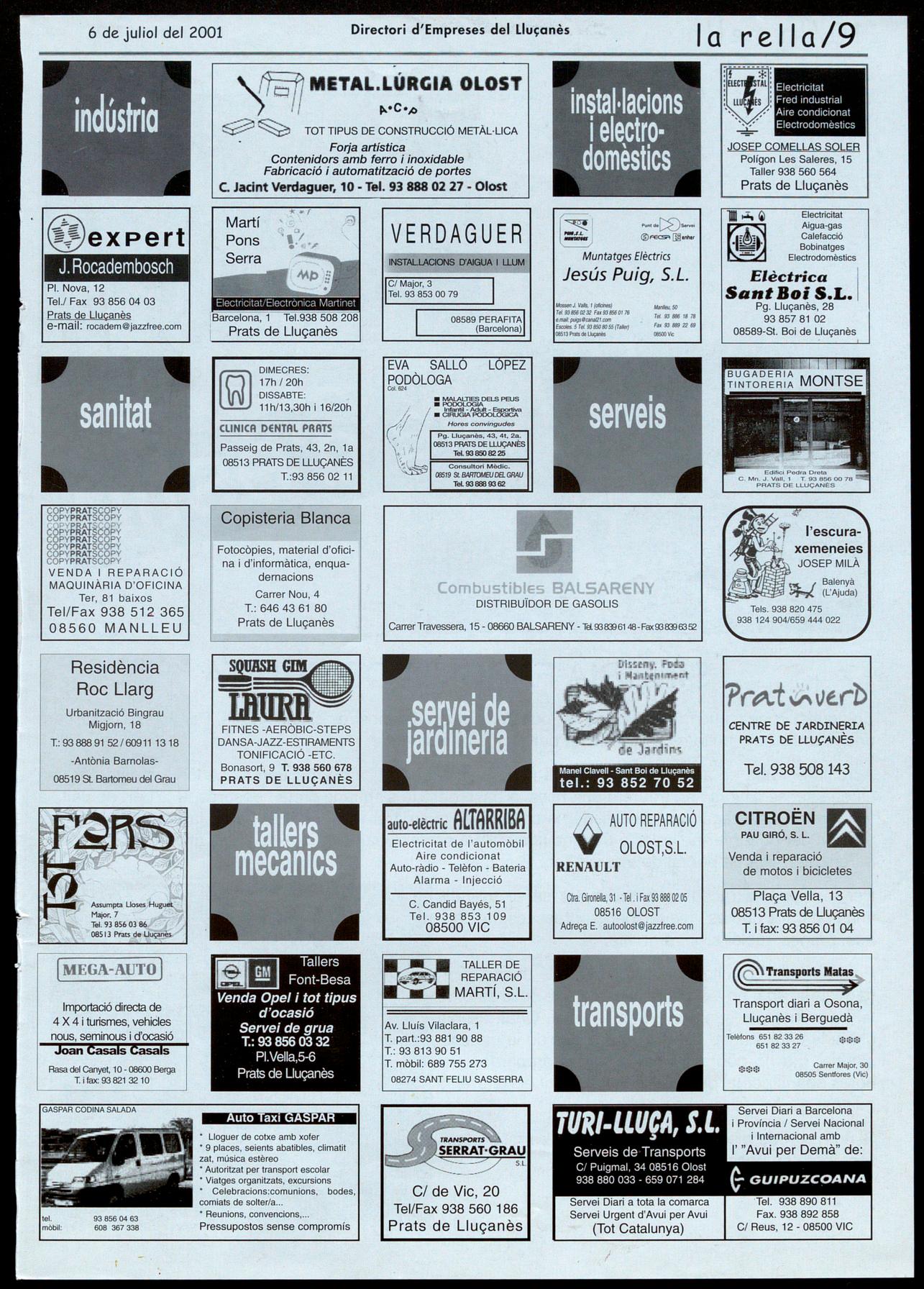 CONSTRUCCiÓ D'UN PAVELLÓ POLIESPORTIU A OLOST. L'ajuntament d'Olost ha aprovat la construcció d'un paveló polivalent situat al costat de l'actual zona esportiva.La propera tardor es té previst presentar el projecte a la Diputació per tal que aquesta en financiï una part. L'edifici comptarà amb una gran sala de 1.200 m2 apta per a tos els usos les obres es realitzaran en dues fases, la primera de les quals s'iniciarà el juny del 2002. Lliurament de la Flor Natural a les dones del Lluçanès. El passat 24 de juny es va atorgar a Sant Feliu Sasserra la sisena Flor Natural del Lluçanès a totes les dones anònimes que han fet història a la nostra comarca. L'acte, organitzat pel GALL el SOLC,va comptar amb les intervencions de Pepeta Plans, Teresa Jordà, Montserrat Vila, Dolors Soler Roser Reixach, que van fer referències al paper de la dona en la història al llarg dels segles van parlar també d'algunes experiències viscudes. Simbòlicament es va lliurar una rosa a totes les dones assistents .A part, es va complementar la sessió amb una exposició d'objectes diversos relacionats amb la vida quotidiana sobretot amb les dones.