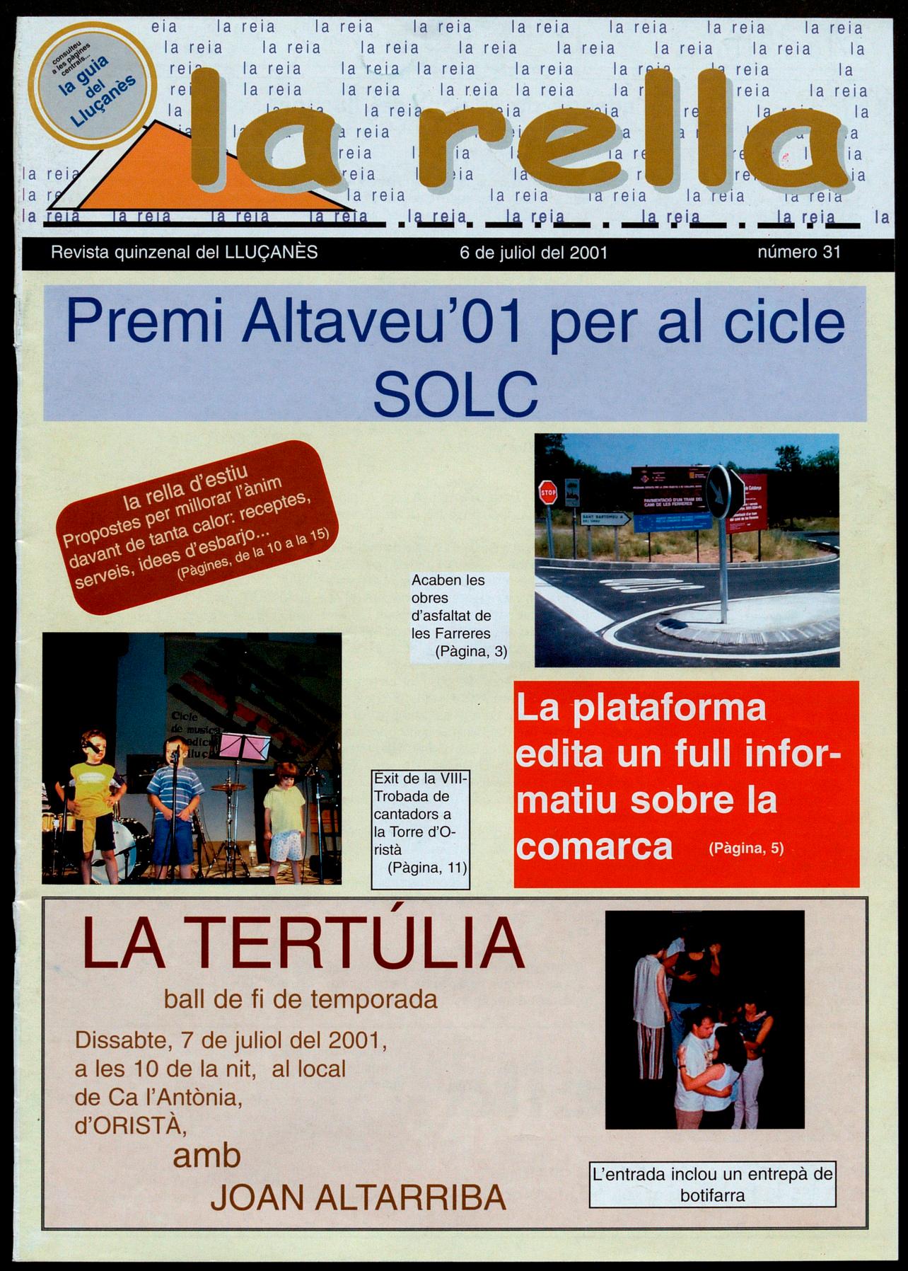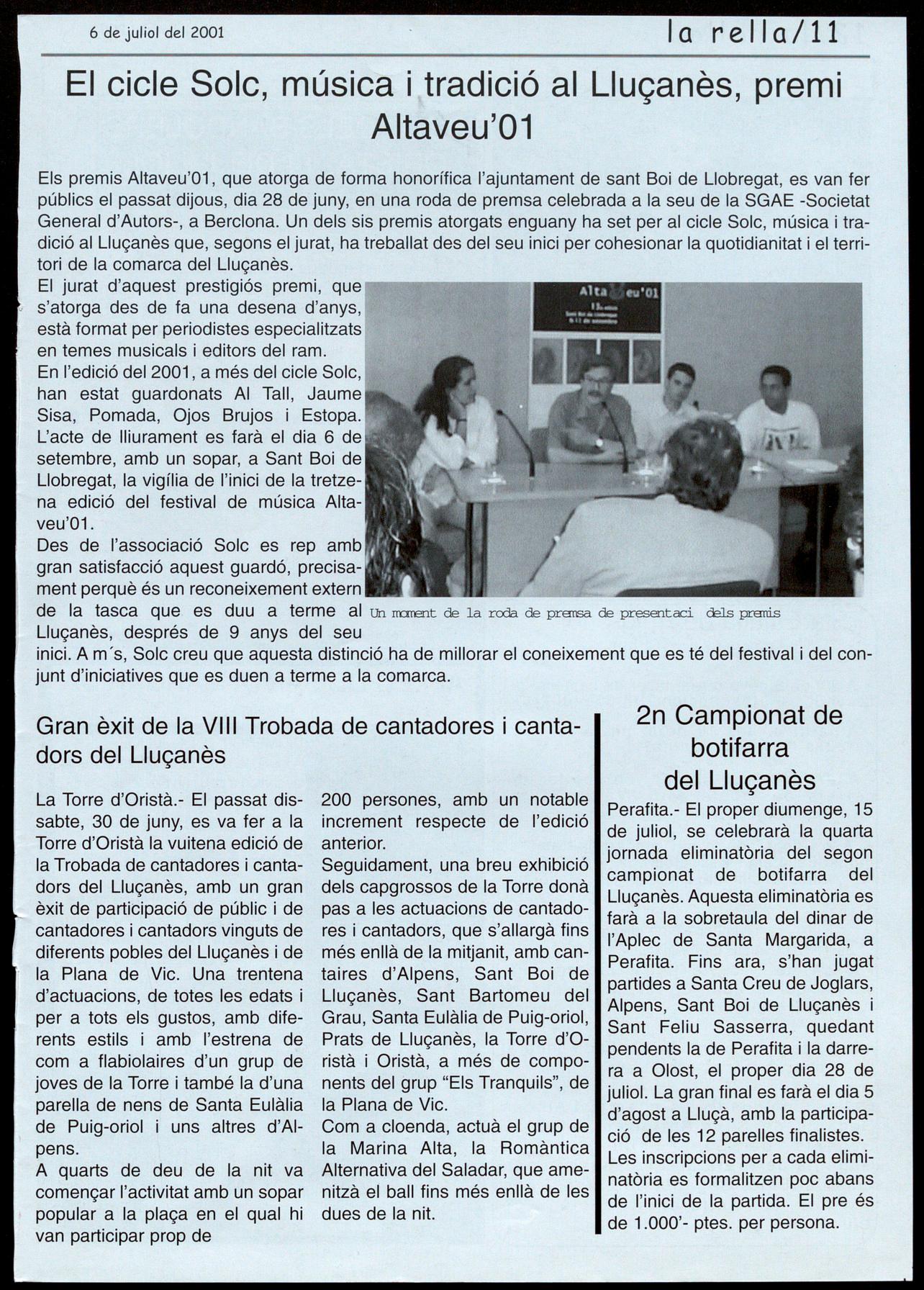Els premis Altaveu'01, que atorga de forma honorífica l'ajuntament de sant Boi de Llobregat, es van fer públics el passat dijous, dia 28 de juny, en una roda de premsa celebrada a la seu de la SGAE -Societat General d'Autors-, a Berciana. Un dels sis premis atorgats enguany ha set per al cicle Solc, música tradició al Lluçanès que, segons el jurat, ha treballat des del seu inici per cohesionar la quotidianitat i el territori de la comarca del Lluçanès. El jurat d'aquest prestigiós premi, que v s'atorga des de fa una desena d'anys, està format per periodistes especialitzats en temes musicals i editors del ram. En l'edició del 2001, a més del cicle Solc, han estat guardonats AI Tall, Jaume Sisa, Pomada, Ojos Brujos Estopa. L'acte de lliurament es farà el dia 6 de setembre, amb un sopar, a Sant Boi de Llobregat, la vigília de l'inici de la tretzena edició del festival de música Altaveu'01.