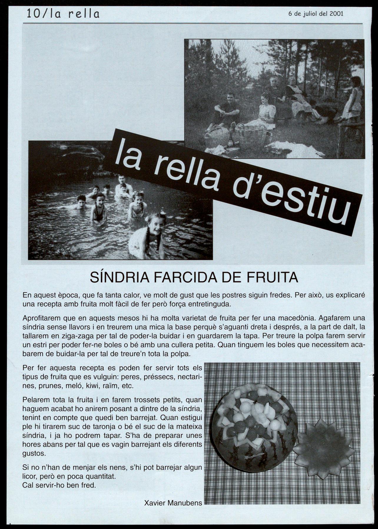 Aprofitarem que en aquests mesos hi ha molta varietat de fruita per fer una macedònia. Agafarem una síndria sense llavors en treurem una mica la base perquè s'aguanti dreta després, a la part de dalt, la tallarem en ziga-zaga per tal de poder-la buidar en guardarem la tapa. Per treure la polpa farem servir un estri per poder fer-ne boles o bé amb una cullera petita. Quan tinguem les boles que necessitem acabarem de buidar-la per tal de treure'n tota la polpa.
