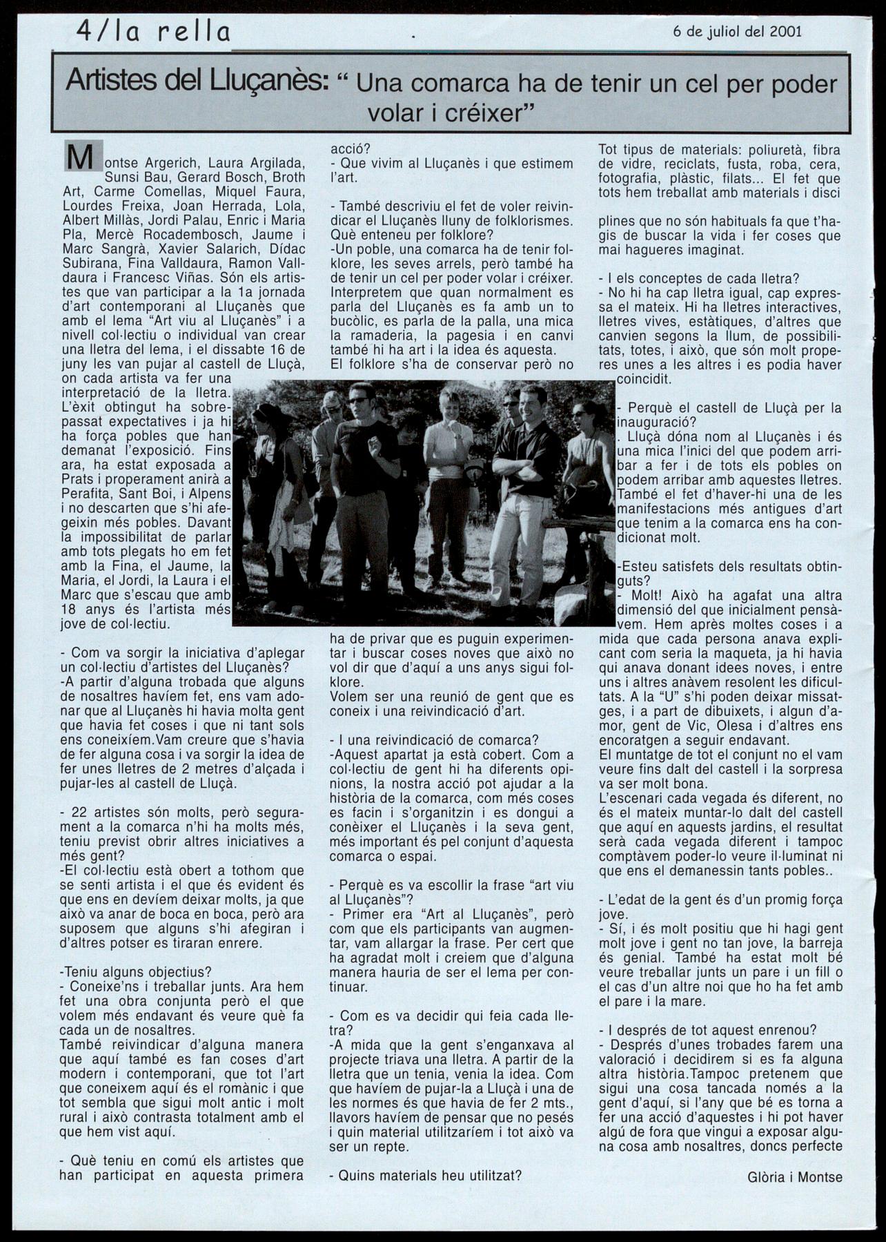 ontse Argerich, Laura Argilada, Sunsi Bau, Gerard Bosch, Broth Art, Carme Comellas, Miquel Faura, Lourdes Freixa, Joan Herrada, Lola, Albert Millàs, Jordi Palau, Enric i Maria Pla, Mercè Rocadembosch, Jaume Marc Sangrà, Xavier Salarich, Dídac Subirana, Fina Valldaura, Ramon Valldaura i Francesc Viñas. Són els artistes que van participar a la 1 a jornada d'art contemporani al Lluçanès que amb el lema "Art viu al Lluçanès" i a nivell col-lectiu o individual van crear una lletra del lema, el dissabte 16 de juny les van pujar al castell de Lluçà, on cada artista va fer una interpretació de la lletra. L'èxit obtingut ha sobrepassat expectatives i ja hi ha força pobles que han demanat l'exposició. Fins ara, ha estat exposada a Prats i properament anirà a Perafita, Sant Boi, i Alpens no descarten que s'hi afegeixin més pobles. Davant la impossibilitat de parlar amb tots plegats ho em fet amb la Fina, el Jaume, la Maria, el Jordi, la Laura i el Marc que s'escau que amb 18 anys és l'artista més jove de col-lectiu.