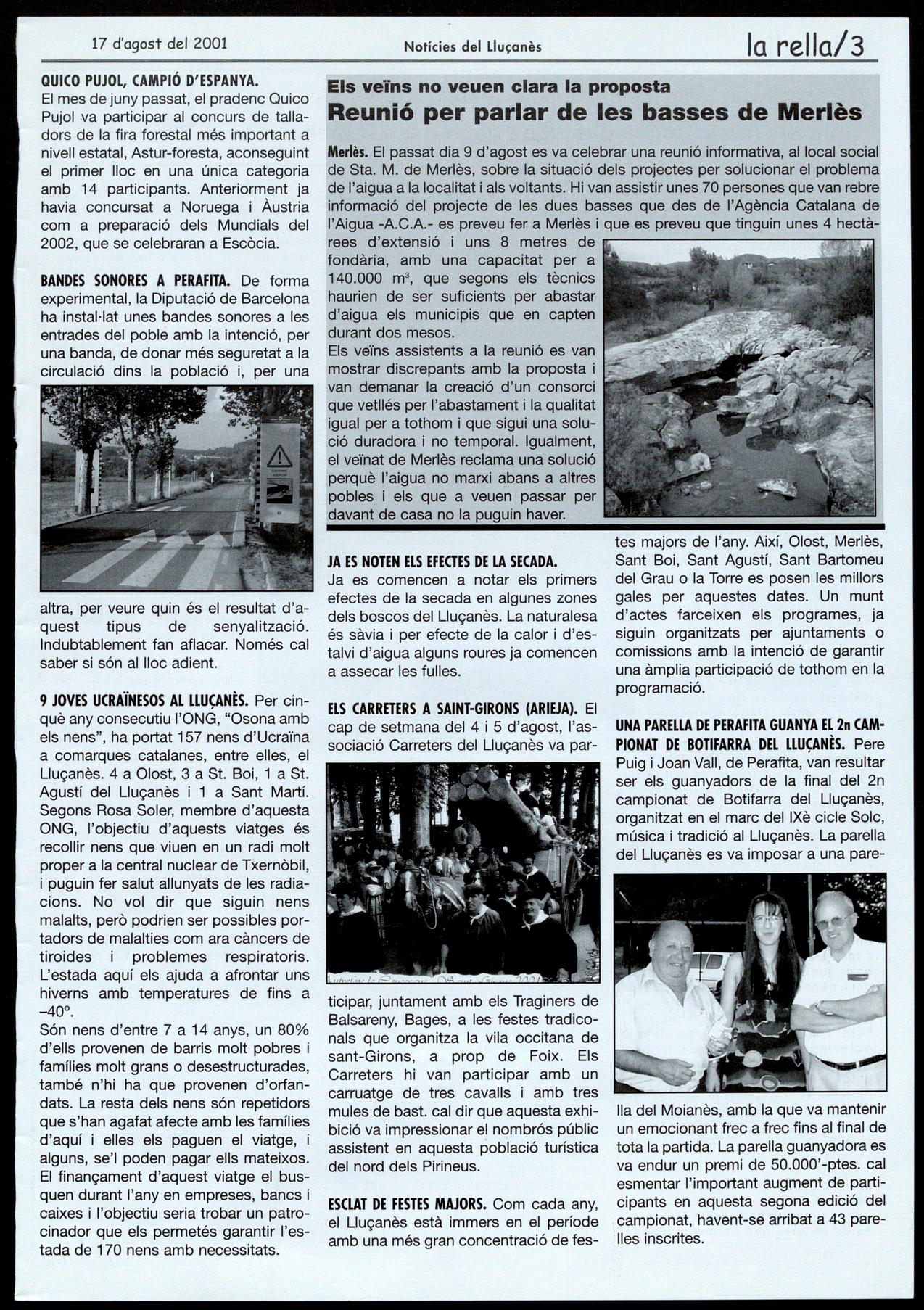 Merlès. El passat dia 9 d'agost es va celebrar una reunió informativa, allocal social de Sta. M. de Merlès, sobre la situació dels projectes per solucionar el problema de l'aigua a la localitat i als voltants. Hi van assistir unes 70 persones que van rebre informació del projecte de les dues basses que des de I'Agència Catalana de l'Aigua -A.C.A.- es preveu fer a Merlès que es preveu que tinguin unes 4 hectàrees d'extensió uns 8 metres de