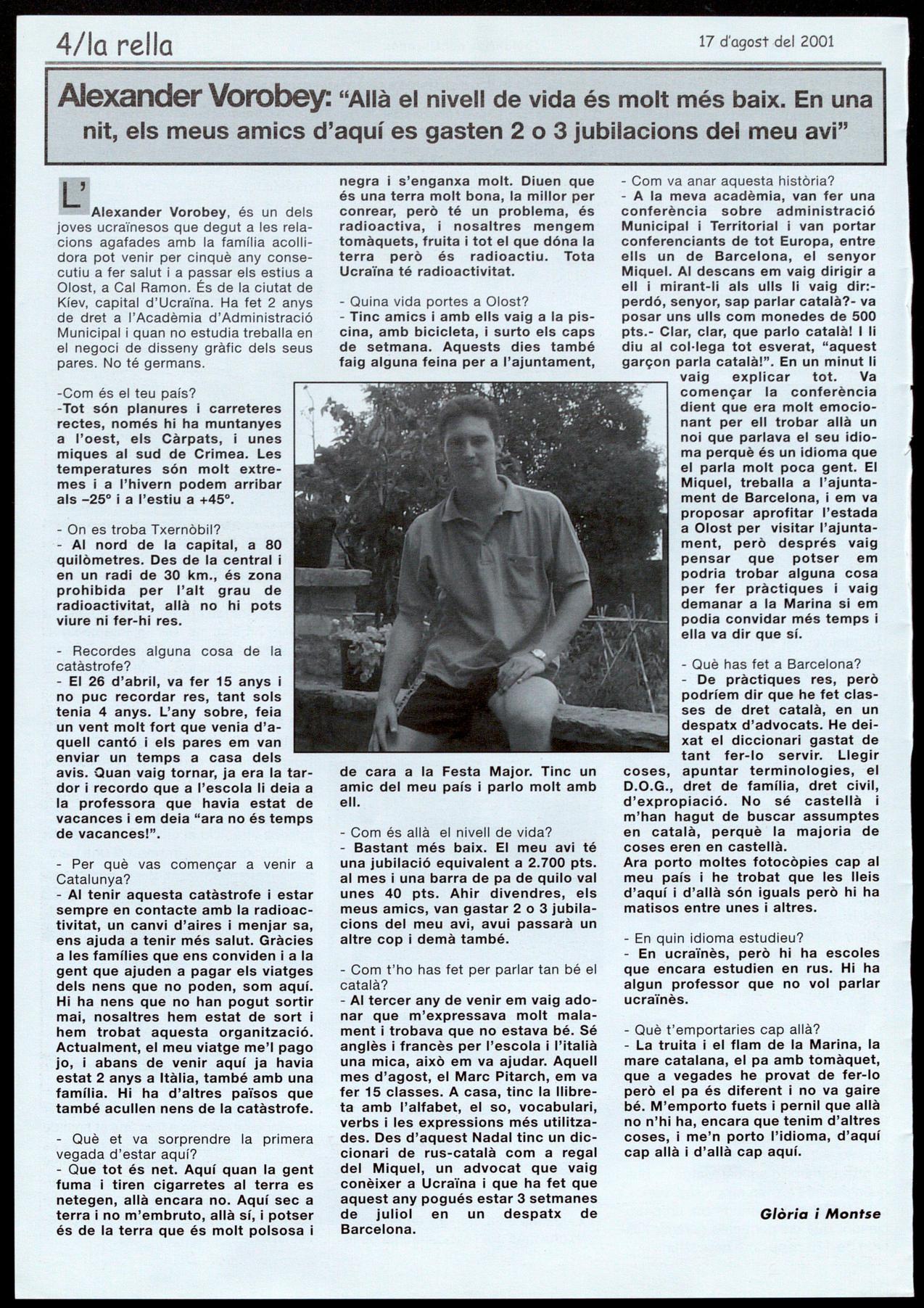 L'Alexander Vorobey, és un dels joves ucraïnesos que degut a les relacions agafades amb la família acollidora pot venir per cinquè any consecutiu a fer salut a passar els estius a Olost, a Cal Ramon. És de la ciutat de Kíev, capital d'Ucraïna. Ha fet 2 anys de dret a l'Acadèmia d'Administració Municipal i quan no estudia treballa en el negoci de disseny gràfic dels seus pares. No té germans.