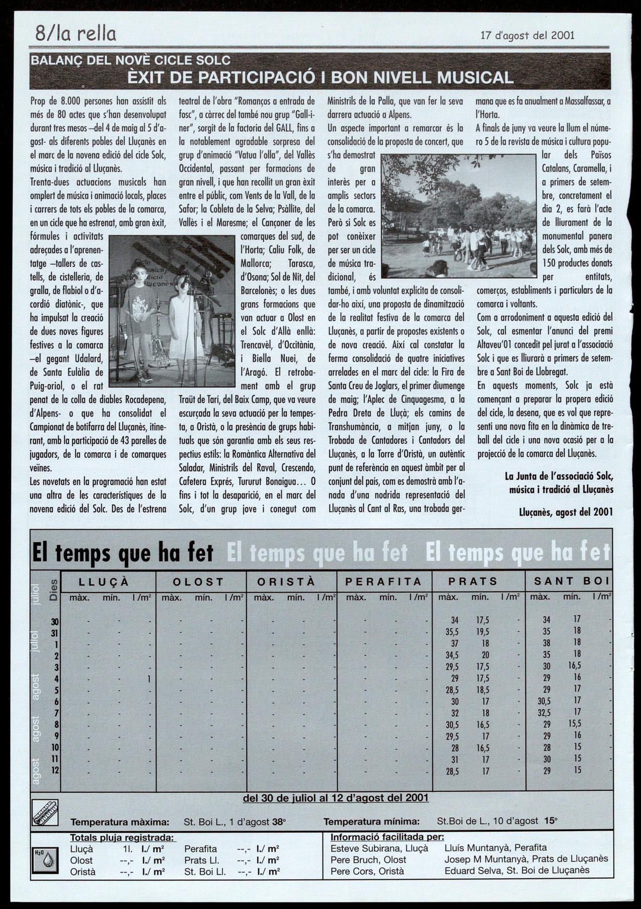 Prop de 8.000 persones han assistit als més de 80 aeles que s'han desenvolupat durant tres mesos -del4 de maig al 5 d'agost- als diferents pobles del Lluçanès en el marc de la novena edició del cicle Solc, música i tradició ul lluçanès, Trenta-dues actuacions musicals han omplert de música i animació locals, places i carrers de tots els pobles de la comarca, en un cicle que ha estrenat, amb gran èxit, fórmules i activitats