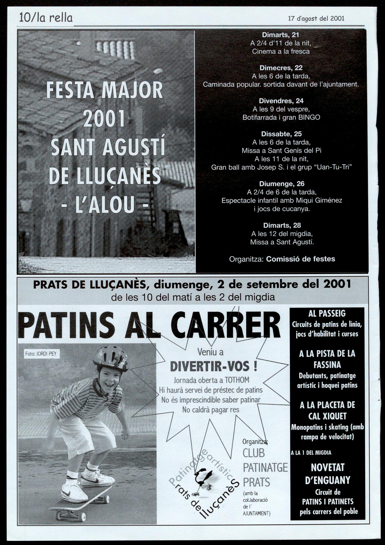 Sant Agustí de Uucanès-L'Alou. - Festa Major. A les 9 del vespre, botifarrada i gran BINGO. Sant Bartomeu del Grau.- Festa Major. A les 9 del matí XIV CONCURS DE DIBUIX. A les 12 del migdia, MISSA SOlEMNE cantada pel "Cor del Grau", seguidament llibret "Art de les parròquiesdeSont Bartomeu del Grau d'A1boquers".A lasortida, e�gegants ens acompanyaran fins a la plaçaamb e� grallers, on hi haurà vennut popular per a tothom. BALlADA DE SARDANES amb la cobla Genisenca. A les 5 de la tarda COMPETICiÓ EN XARXA a la biblioteca-Telecentre SBG. A 2/4 de 6, CAFÈ-CONCERT a càrrecde úistian & Domènech. Ales7, AUDICiÓ DE SARDANESamb lacoble Ginisenca.A2/4de 10del ves pre, BINGO a la plaça. Tot seguit BAll DE FESTA MAJOR amb Cr�an & Domènech. per acabar, DISCOTECA MÒBIL