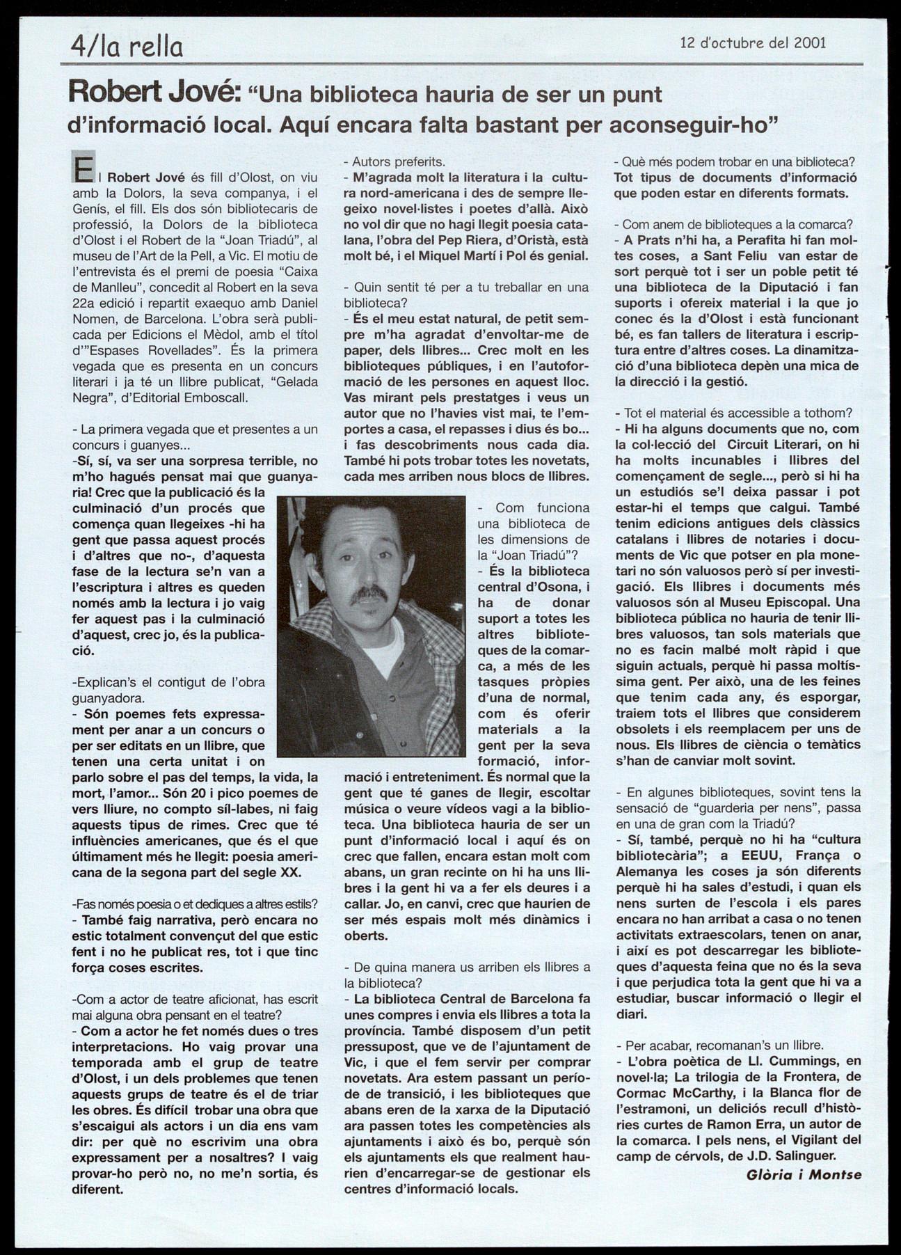 Robert Jové és fill d'Olost, on viu amb la Dolors, la seva companya, i el Genís, el fill. Els dos són bibliotecaris de professió, la Dolors de la biblioteca d'Olost i el Robert de la "Joan Triadú", al museu de l'Art de la Pell, a Vic. El motiu de l'entrevista és el premi de poesia "Caixa de Manlleu", concedit al Robert en la seva 22a edició repartit exaequo amb Daniel Nomen, de Barcelona. L'obra serà publicada per Edicions el Mèdol, amb el títol d"'Espases Rovellades". És la primera vegada que es presenta en un concurs literari ja té un llibre publicat, "Gelada Negra", d'EditorialEmboscall.