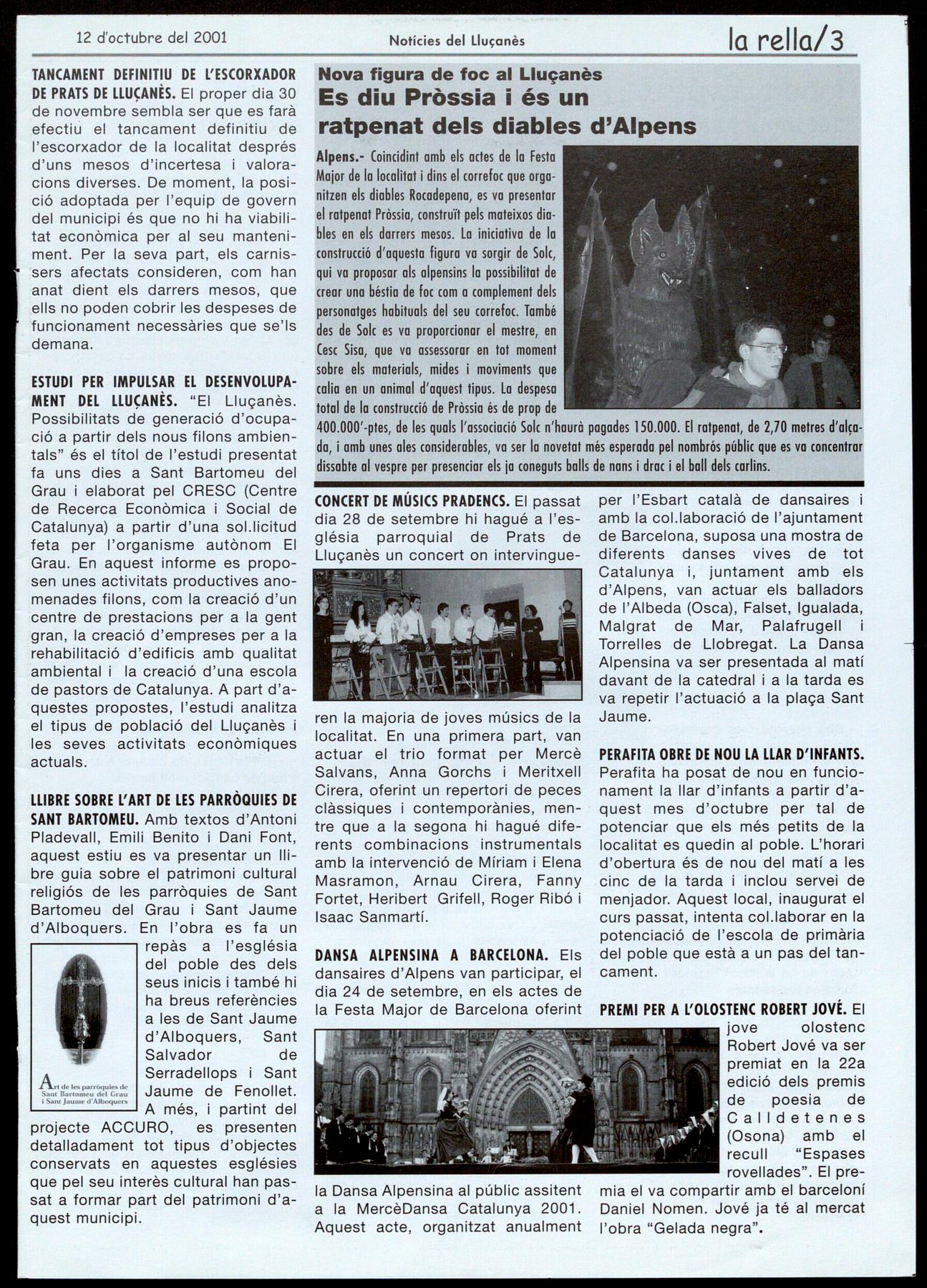 DANSA ALPENSINA A BARCELONA. Els dansaires d'Alpens van participar, el dia 24 de setembre, en els actes de la Festa Major de Barcelona oferint PREMI PER A L'OLOSTENC ROBERT JOVÉ. El jove olostenc Robert Jové va ser premiat en la 22a edició dels premis de poesia de Calldetenes (Osona) amb el recull "Espases rovellades". El premia el va compartir amb el barceloní Daniel Nomen. Jové ja té al mercat l'obra "Gelada negra".