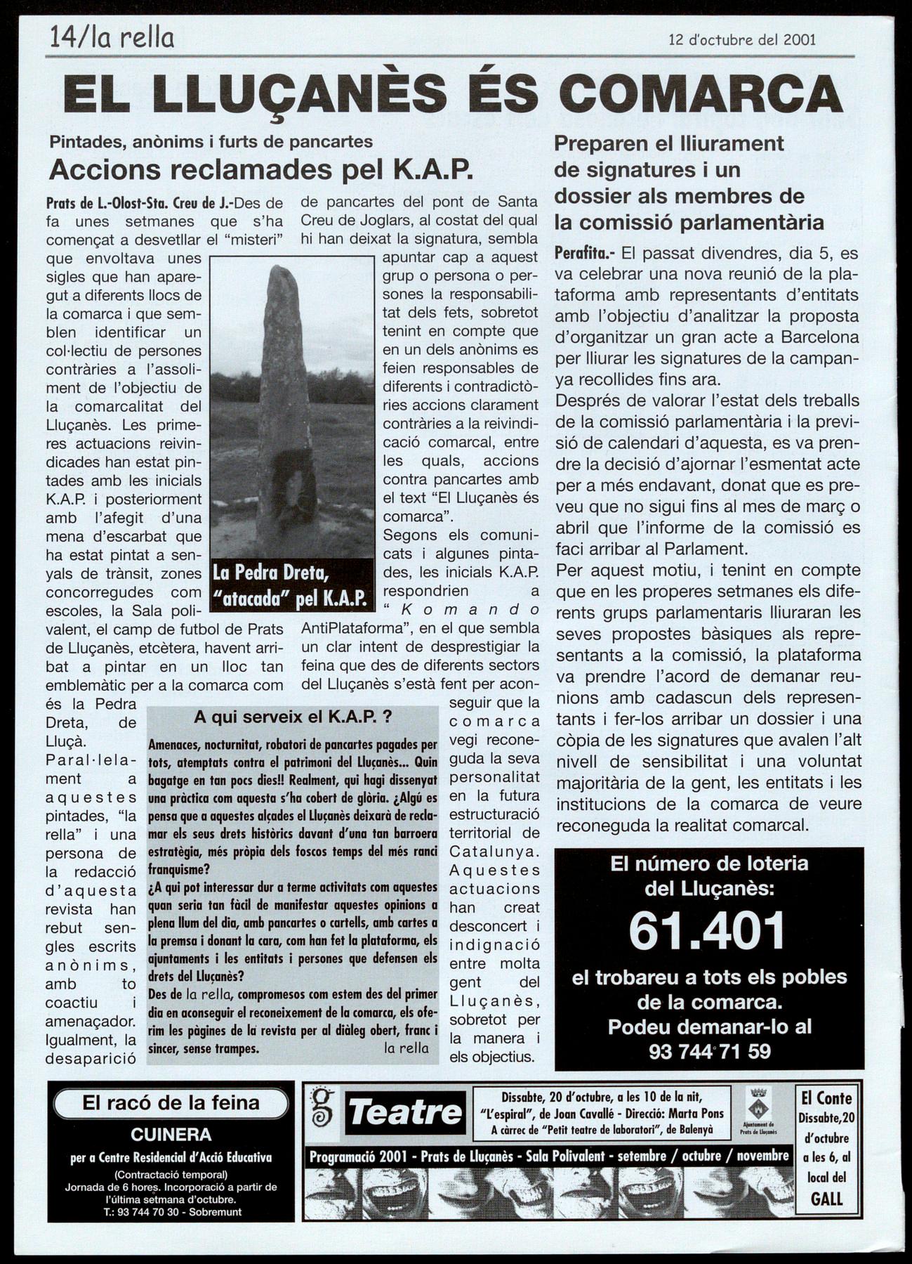 Prats de L.-Olost-Sta. (reu de J.-Des de fa unes setmanes que s'ha començat a desvetllar el "misteri" que envoltava unes sigles que han aparegut a diferents llocs de la comarca i que semblen identificar un col·lectiu de persones contràries a l'assoliment de l'objectiu de la comarcalitat del Lluçanès. Les primeres actuacions reivindicades han estat pintades amb les inicials KAP. i posteriorment amb l'afegit d'una mena d'escarbat que ha estat pintat a senyals de trànsit, zones concorregudes com escoles, la Sala polivalent, el camp de futbol de Prats de Lluçanès, etcètera, havent arribat a pintar en un lloc tan emblemàtic per a la comarca com és la Pedra Dreta, de Lluçà. Paral·lelament a aquestes pintades, "la rella" i una persona de la redacció d'aquesta revista han rebut sengles escrits anònims, amb to coactiu amenaçador. Igualment, la desaparició