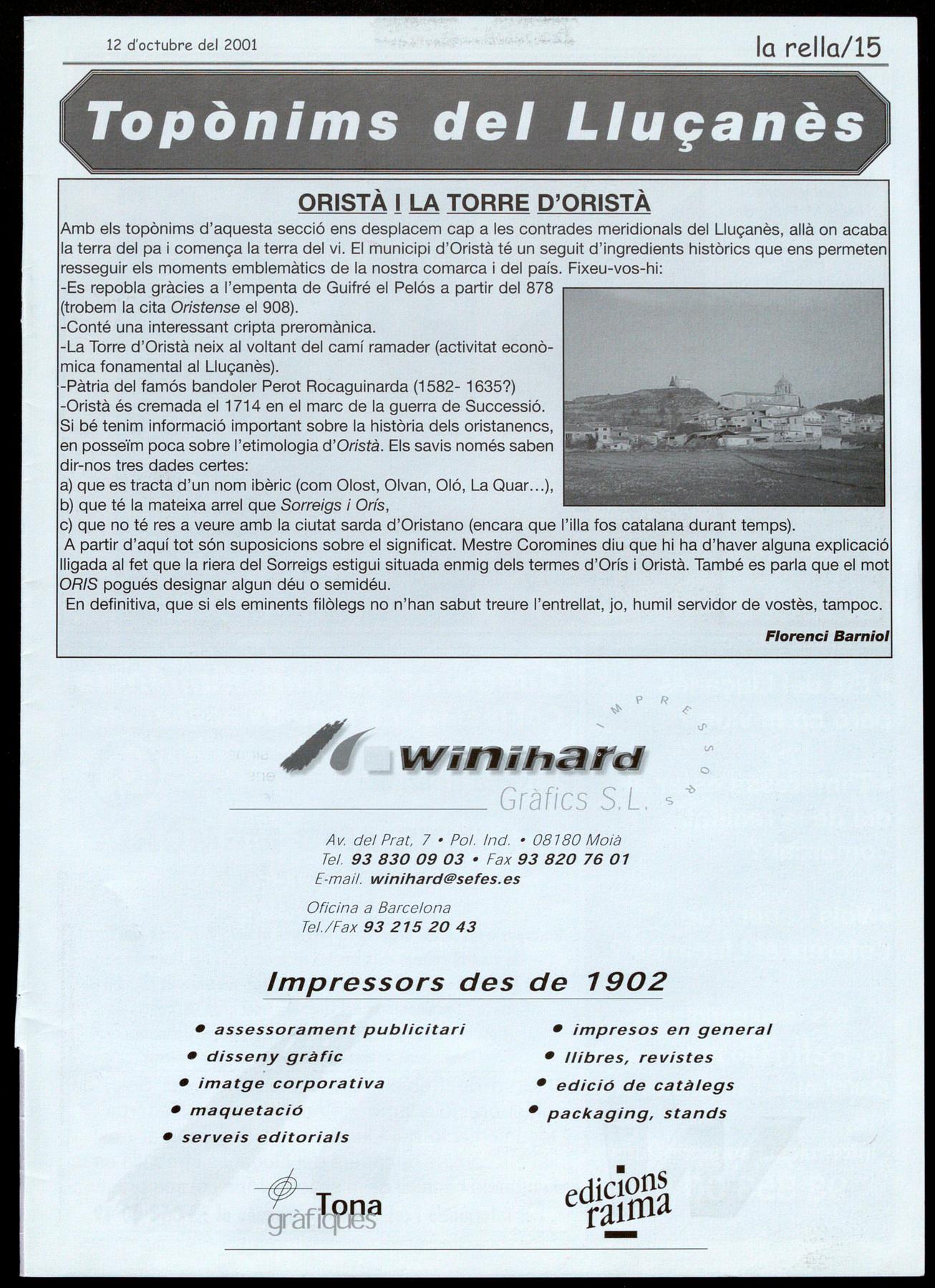 Amb els topònims d'aquesta secció ens desplacem cap a les contrades meridionals del Lluçanès, allà on acaba la terra del pa comença la terra del vi. El municipi d'Oristà té un seguit d'ingredients històrics que ens permeten resseguir els moments emblemàtics de la nostra comarca i del país. Fixeu-vos-hi: