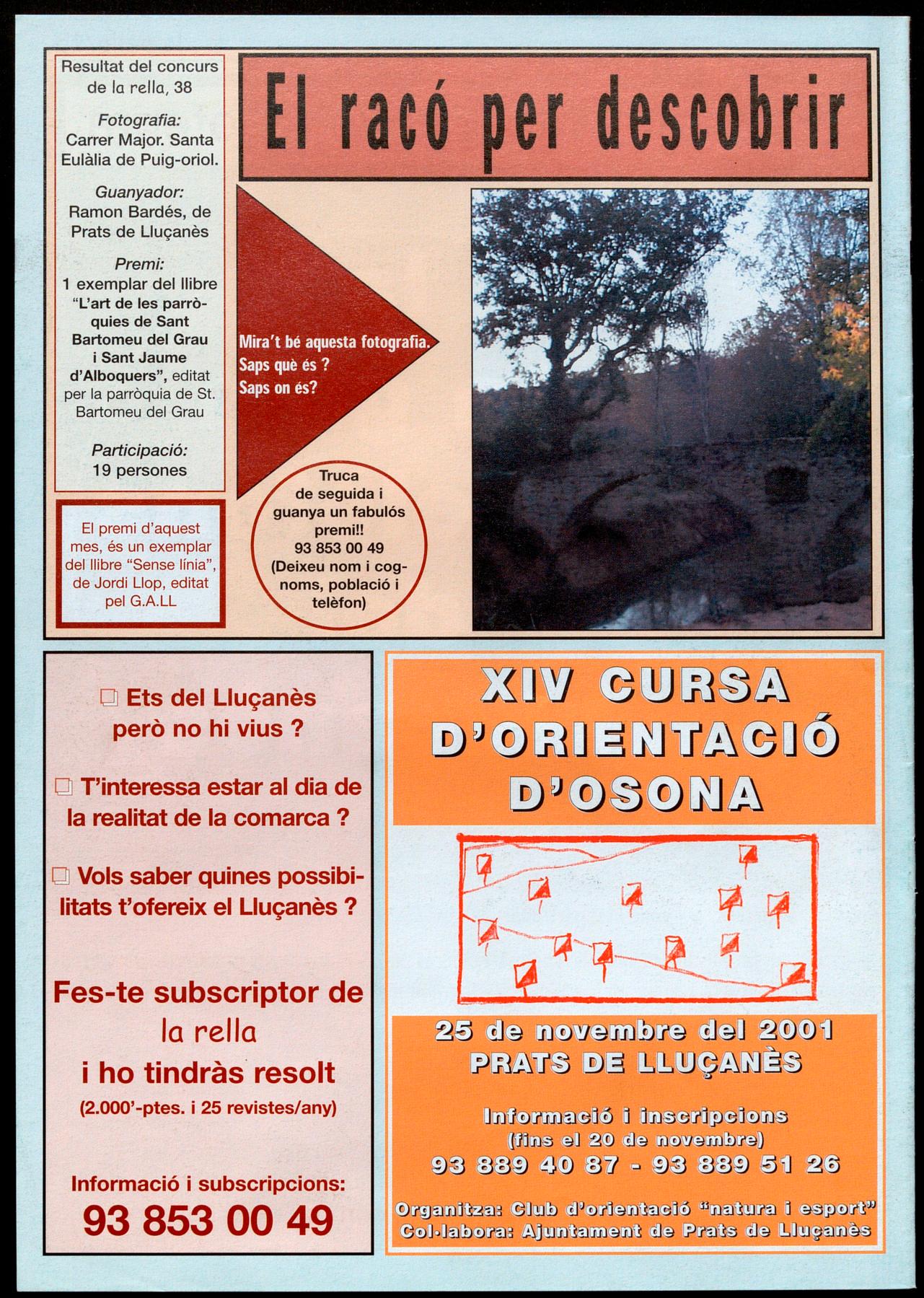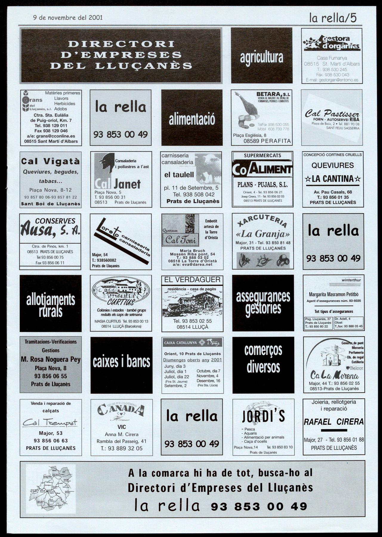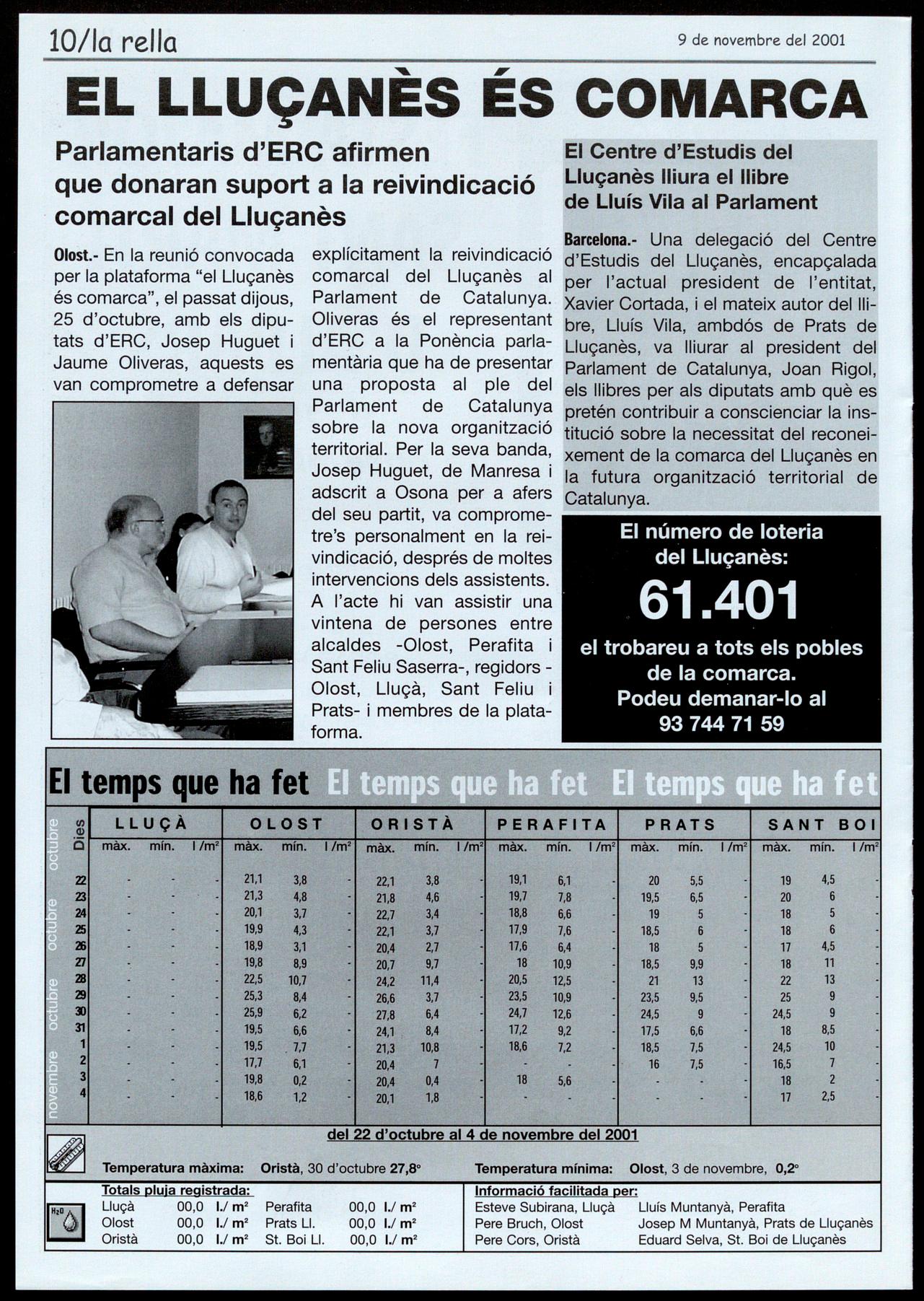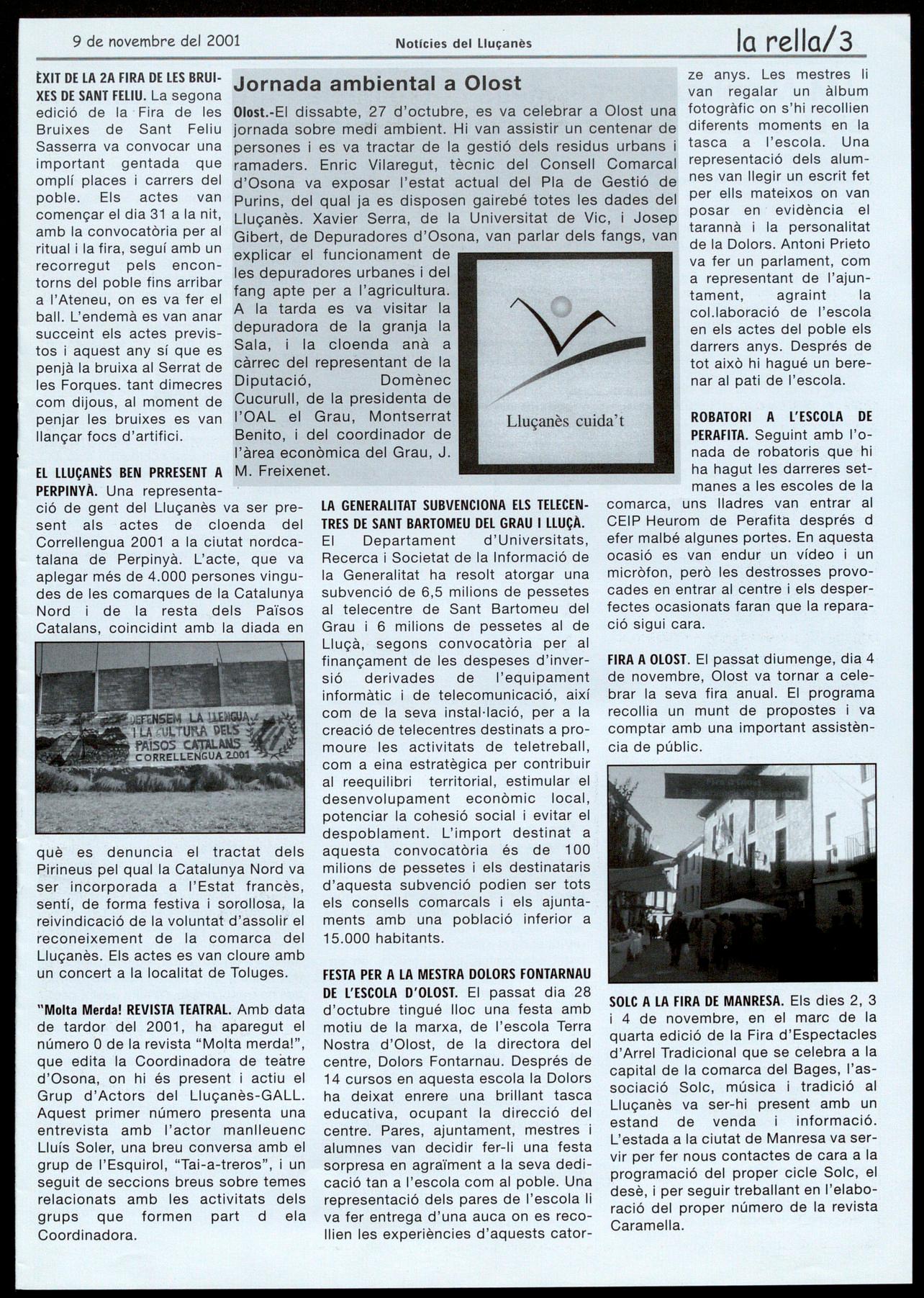EL LLUÇANÈS BEN PRRESENT A PERPINVA. Una representació de gent del Lluçanès va ser present als actes de cloenda del Correllengua 2001 a la ciutat nordcatalana de Perpinyà. L'acte, que va aplegar més de 4.000 persones vingudes de les comarques de la Catalunya Nord de la resta dels Països Catalans, coincidint amb la diada en