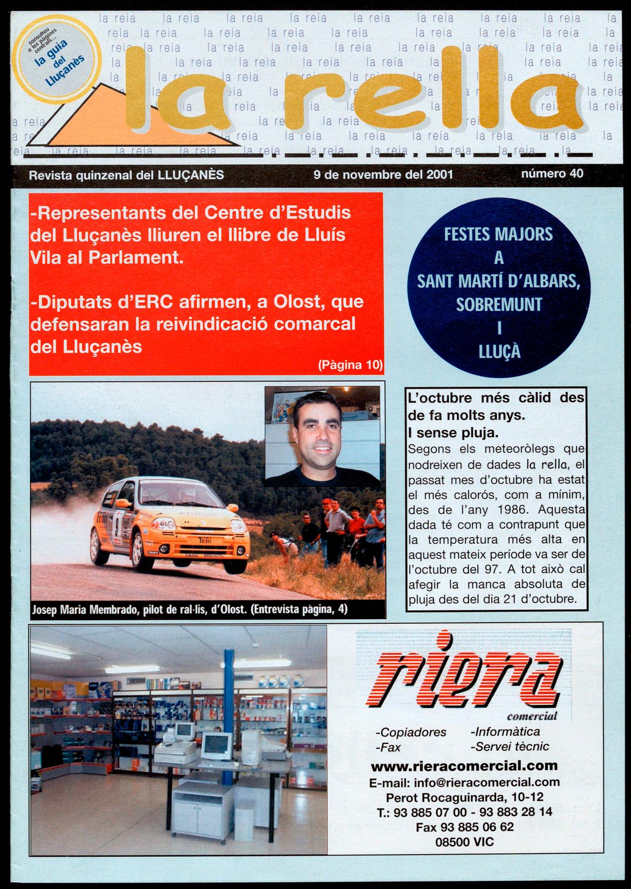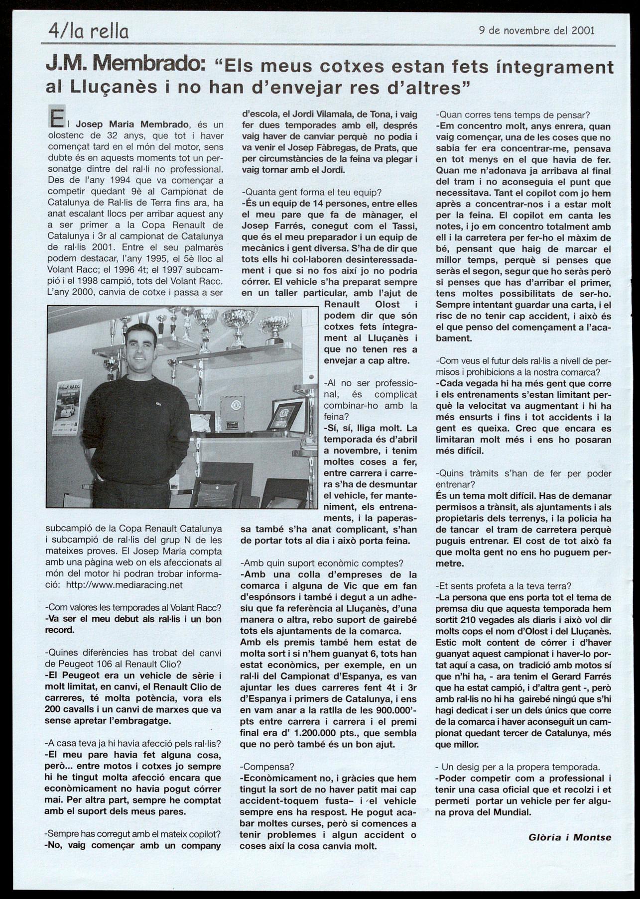 Josep Maria Membrado, és un olostenc de 32 anys, que tot haver començat tard en el món del motor, sens dubte és en aquests moments tot un personatge dintre del ral-li no professional. Des de l'any 1994 que va començar a competir quedant 9è al Campionat de -Quanta gent forma el teu equip? Catalunya de Ral-lis de Terra fins ara, ha -És un equip'de 14 persones, entre elles anat escalant llocs per arribar aquest any el meu pare que fa de mànager, el a ser primer a la Copa Renault de Josep Farrés, conegut com el Tassi, Catalunya i 3r al campionat de Catalunya que és el meu preparador i un equip de de rat-lis 2001. Entre el seu palmarès' mecànics i gent diversa. S'ha de dir que podem destacar, l'any 1995, el 5è lloc al tots ells hi col-laboren desinteressadaVolant Racc; el 1996 4t; el 1997 subcam- ment i que si no fos així jo no podria pió el 1998 campió, tots del Volant Haec. córrer. El vehicle s'ha preparat sempre L'any 2000, canvia de cotxe passa a ser en un taller particular, amb l'ajut de ----� Renault Olost podem dir que són cotxes fets íntegrament al Lluçanès i que no tenen res a envejar a cap altre.