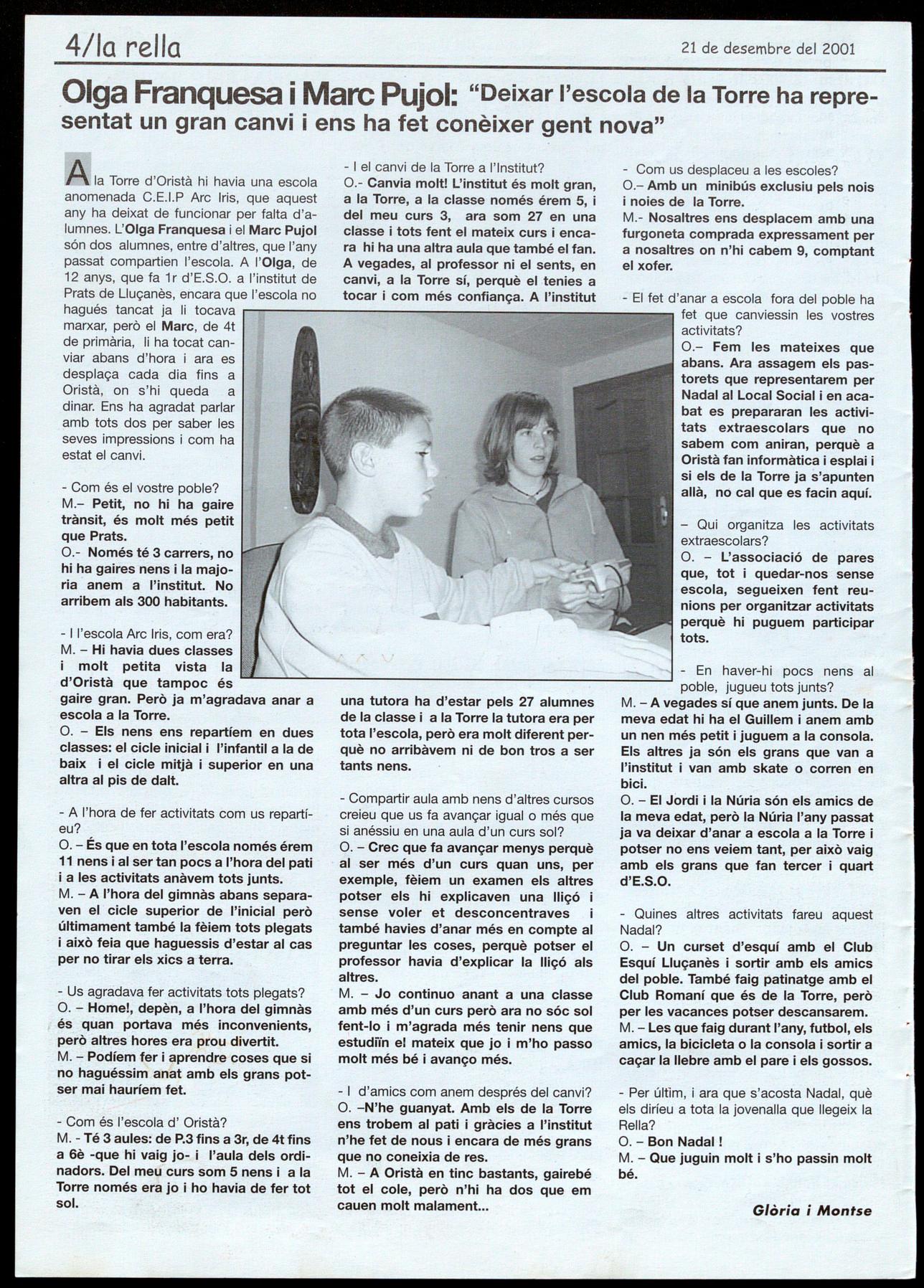 Mi la Torre d'Oristà hi havia una escola 0.- Canvia molt! L'institut és molt gran, anomenada C.E.I.P Arc Iris, que aquest a la Torre, a la classe només érem 5, i any ha deixat de funcionar per falta d'a- del meu curs 3, ara som 27 en una lumnes. L'Olga Franquesa el Marc Pujol classe i tots fent el mateix curs i encasón dos alumnes, entre d'altres, que l'any ra hi ha una altra aula que també el fan. passat compartien l'escola. A l'Olga, de A vegades, al professor ni el sents, en 12 anys, que fa 1 r d'E.S.O. a l'institut de canvi, a la Torre sí, perquè el tenies a Prats de Lluçanès, encara que l'escola no tocar i com més confiança. A l'institut - El fet d'anar a escola fora del poble ha hagués tancat ja li tocava .-------------------__,...,...----....,.':""""'"=.,..,.,.., fet que canviessin les vostres marxar, però el Marc, de 4t activitats? de primària, li ha tocat can- 0.- Fem les mateixes que viar abans d'hora ara es abans. Ara assagem els pasdesplaça cada dia fins a torets que representarem per Oristà, on s'hi queda a Nadal al Local Social en acadinar. Ens ha agradat parlar bat es prepararan les activiamb tots dos per saber les tats extraescolars que no seves impressions com ha sabem com aniran, perquè a estat el canvi. Oristà fan informàtica esplai si els de la Torre ja s'apunten allà, no cal que es facin aquí.