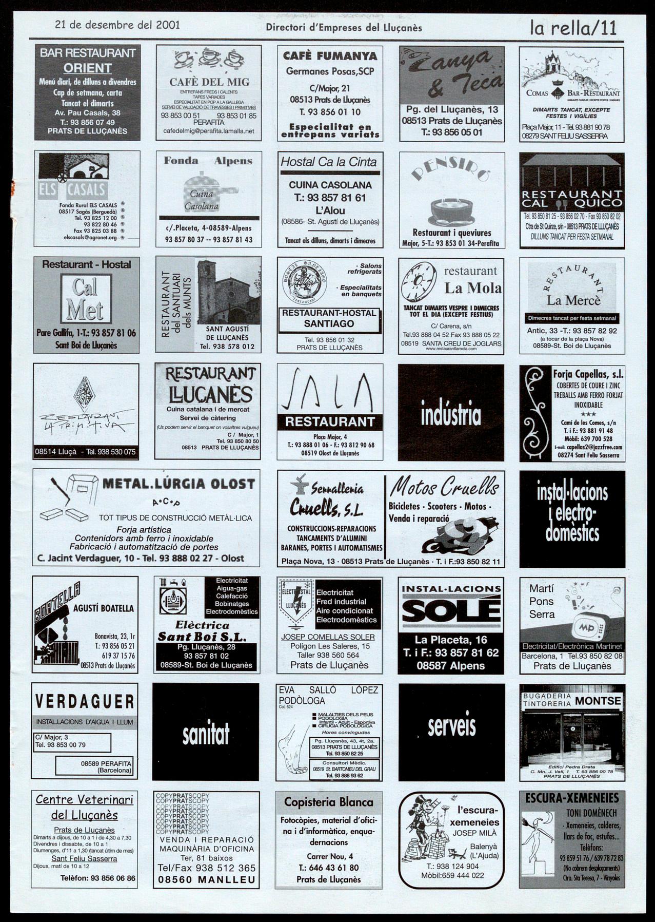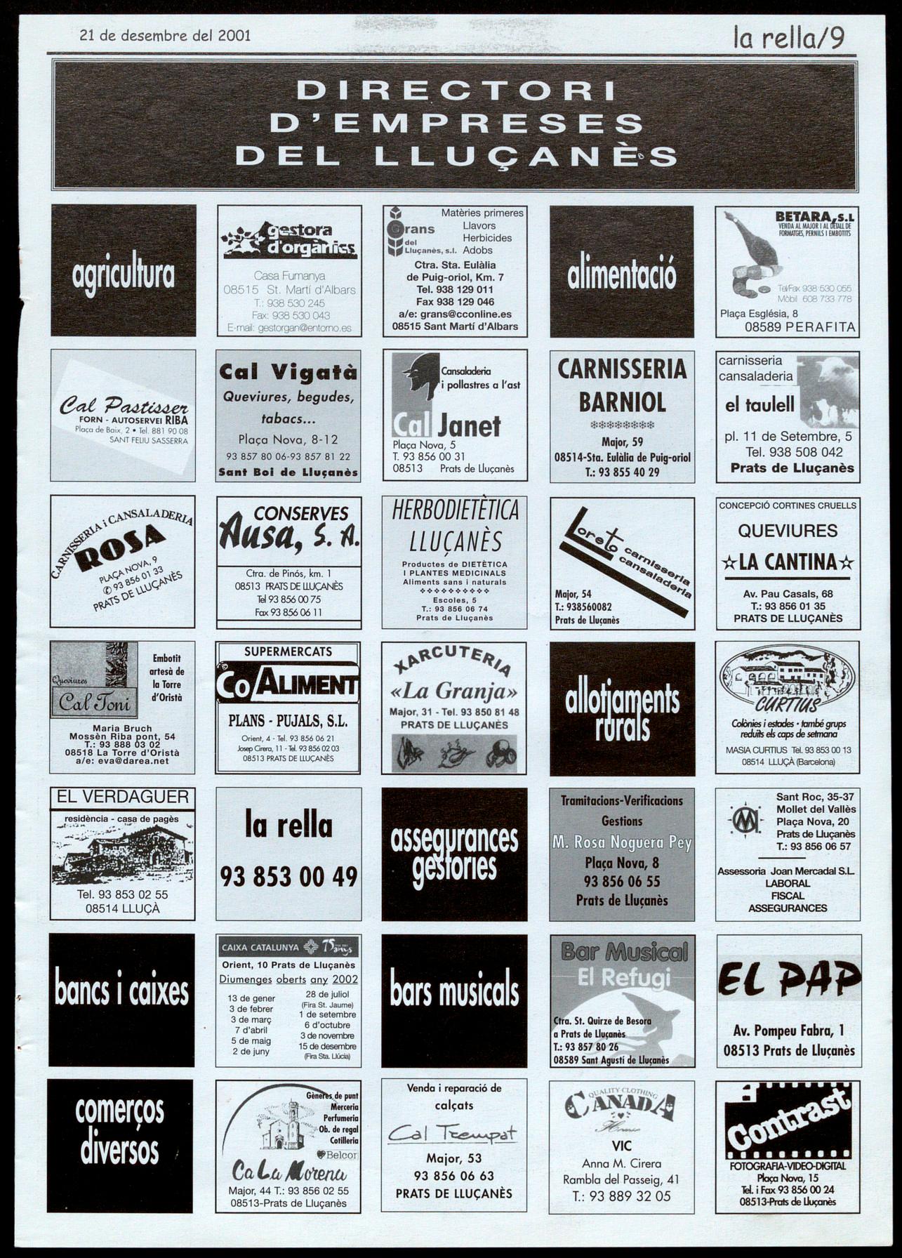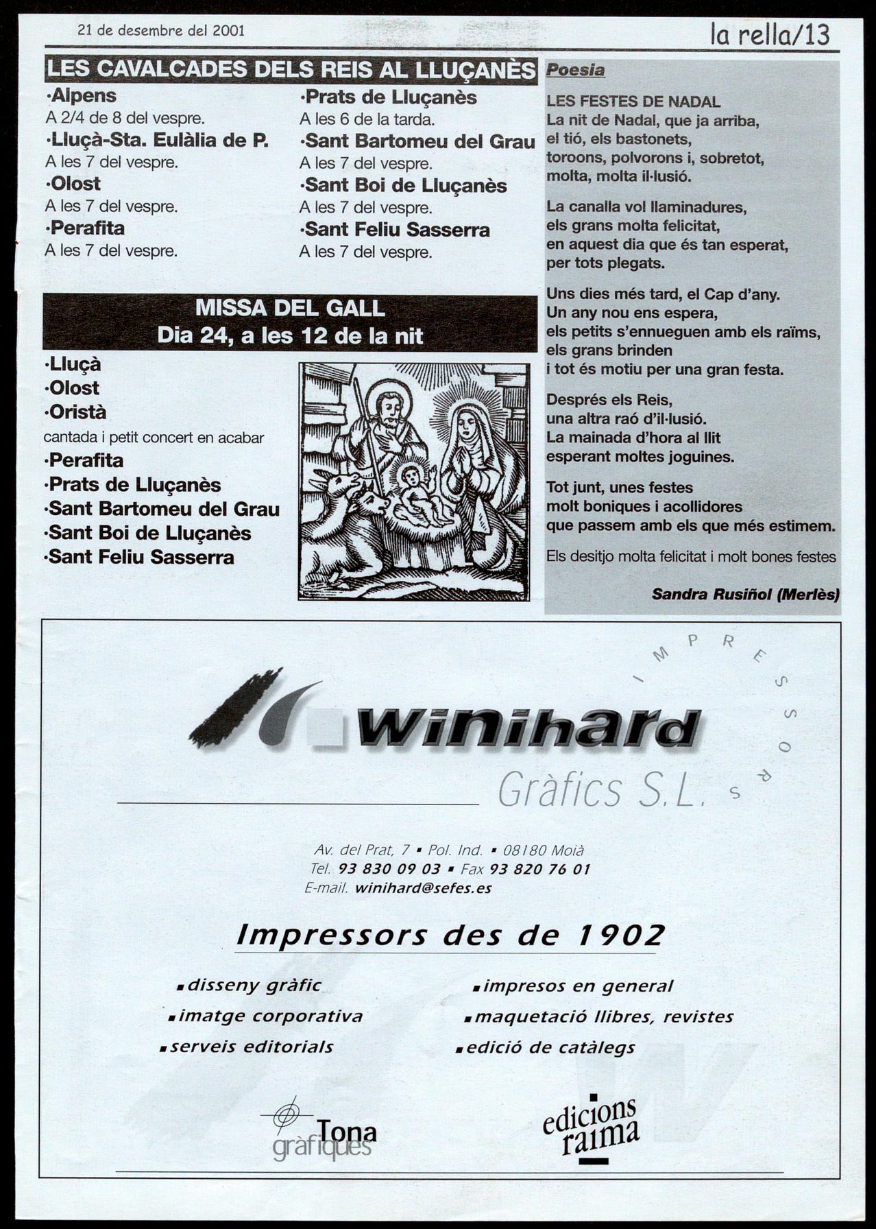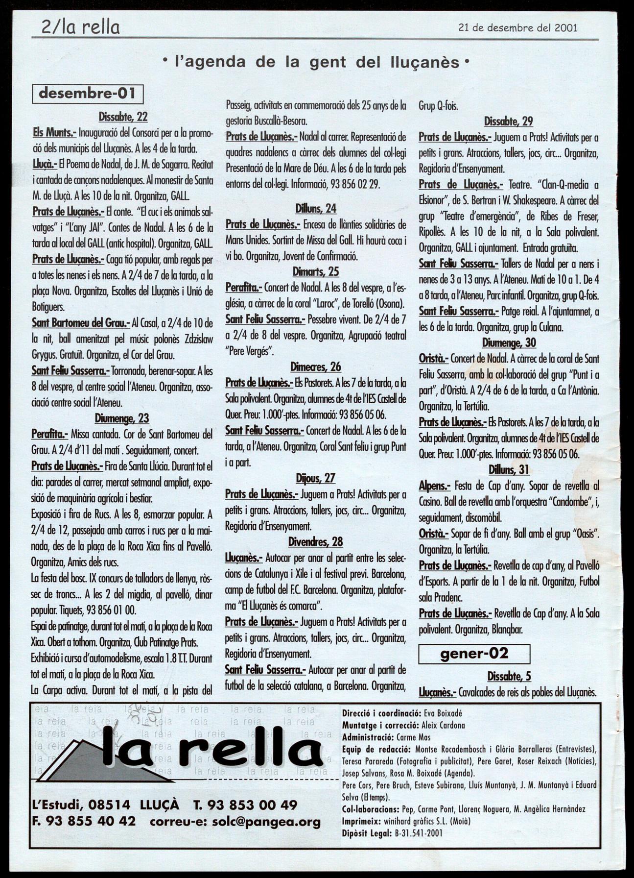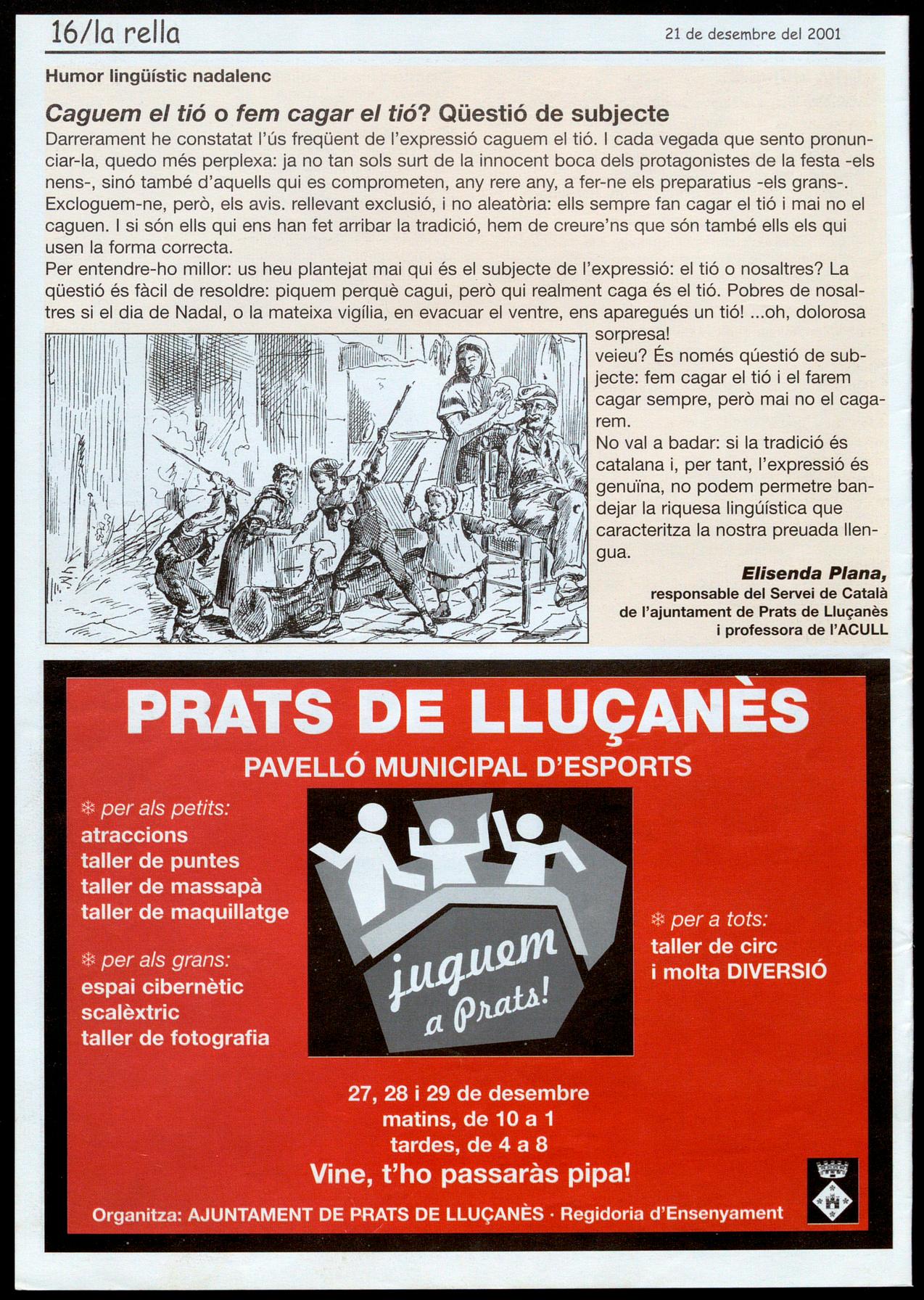 Els Munts.-Inauguració del Consorci per a la promoció de� municip� del Uuçanès.A les 4 de la tarda. Uucà.- 8 Poemade Nadat deJ. M. deSagarra. Recitat icantadadecançonsnadalenques.AI monestirdeSanta M. de Uuçà. A les 10de la nit. Organitza, GALL Prats de Llucanès.- 8 conte. "8 cuc ie� anima�salvatges" i 'Tany JAI". Contes de Nadal. A les 6 de la tarda allocaldel GAll(antichospital). Organitza, GALL Prats de Uucanès. - Cagatió populaç amb rega� per a totes les nenes i e� nens. A2/4 de 7 de latarda, a la plaça Nova. Organitza, Escokes del Uuçanès i Unió de Botiguers.
