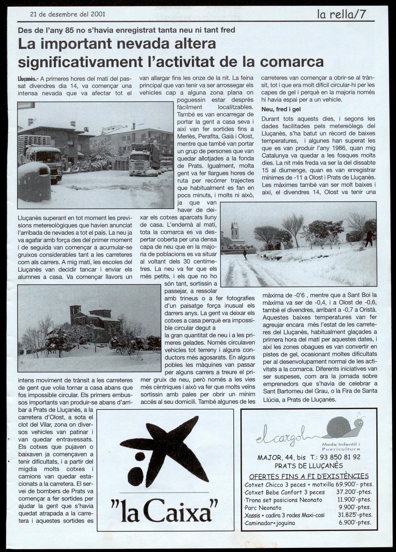 AJORNADA LA FIRA DE SANTA LLÚCIA. Amb motiu de la intensa nevada que es va produir durant tot el divendres dia 14, l'ajuntament de Prats va decidir ajornar la fira per aquest diumenge 23. Tal com estava previst, durant tot el dia hi haurà diferents activitats, exposicions de bestiar maquinària, passejada amb rucs, concurs de talladors de lIenya,exhibició de patinatge, automodelisme, carpa activa i representació del Nadal al carrer. A més, coincidint amb el diumenge anterior a Nadal, els botiguers obriran durant tot el dia.