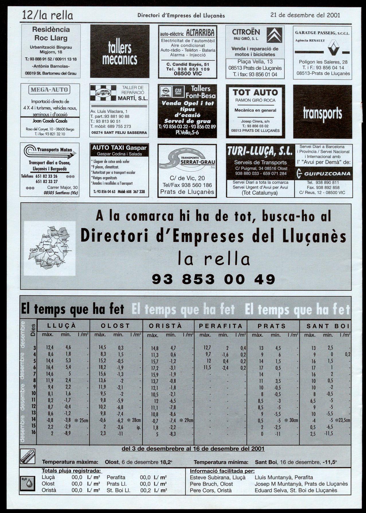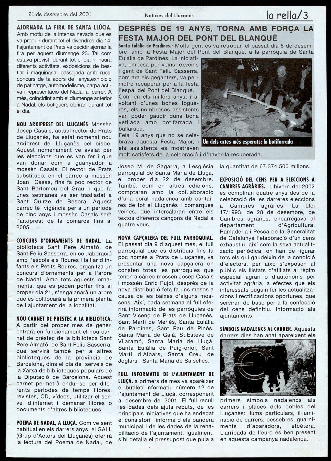 FULL INFORMATIU DE L'AJUNTAMENT DE LLUÇÀ. a primers de mes va aparèixer el butlletí informatiu número 12 de l'ajuntament de Lluçà, corresponent al desembre del 2001. El full recull les dades dels ajuts rebuts, de les principals iniciatives que ha endegat el consistori informa d ela bandera municipal de les dades de la rehabilitació de l'ajuntament. Igualment, s'hi detalla el pressupost que puja a