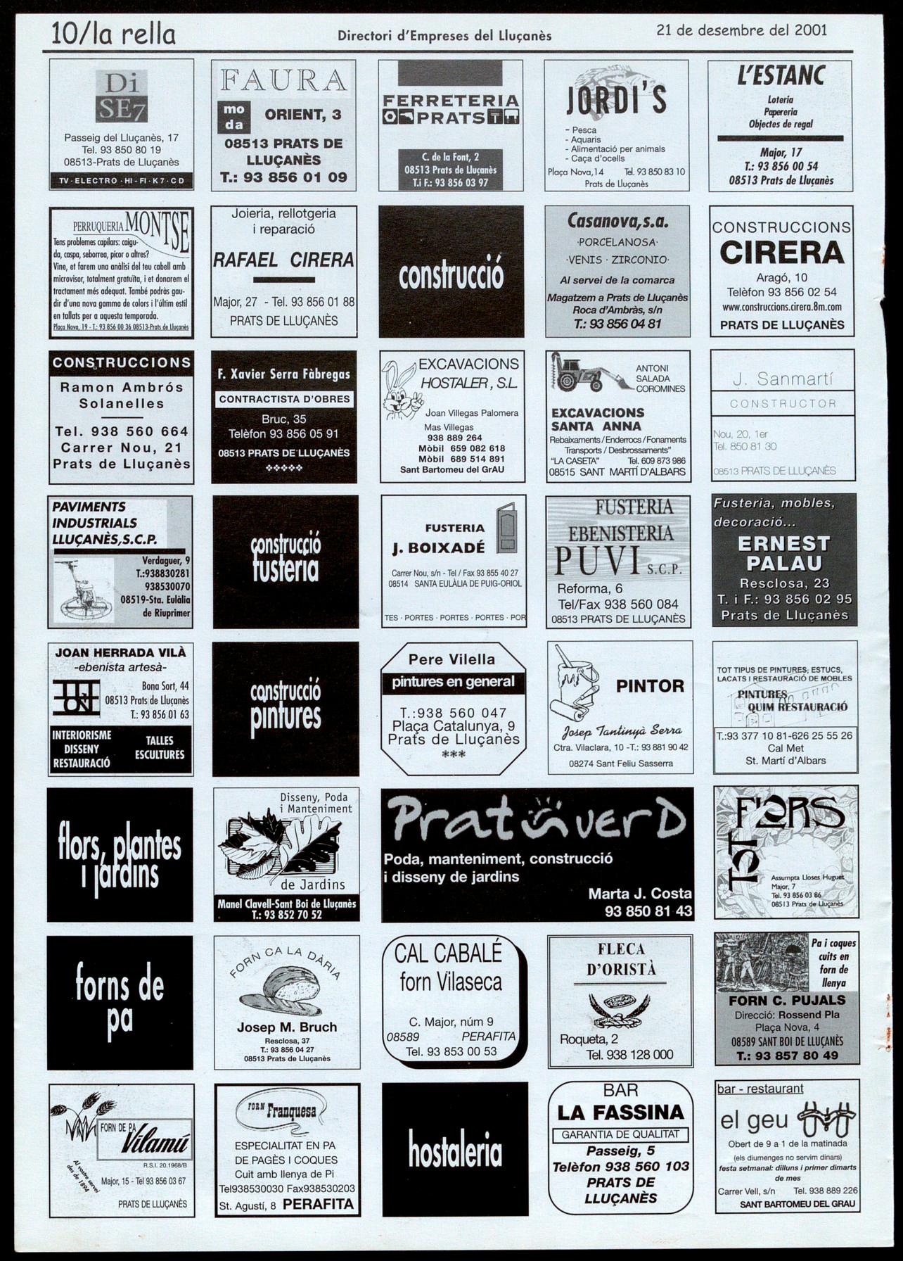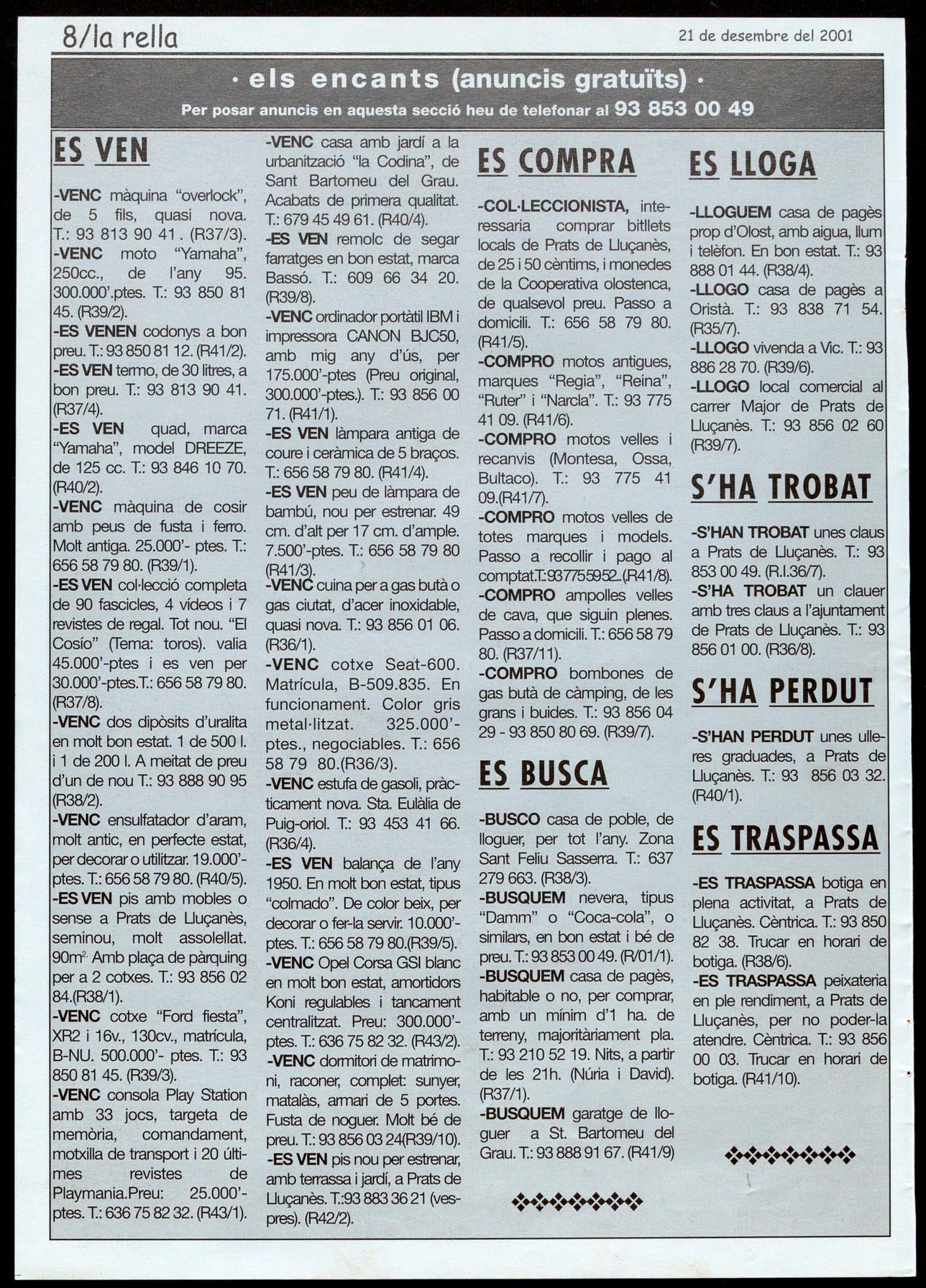 Pratsde lbmès. - Ss Pastorets.Ales7 de�taroo, a � Sa�potlValent.Organitza,alumnesde4tde l'lESCastellde Ouer. Preu: 1.000'-ptes.lnforrnodó: 93 856 0506. Sant Felu Sasserra. - Concert de Nadal. A les 6 de la tarda, a l'Ateneu. Organitza, CoralSantfeliu igrup Punt i a part.