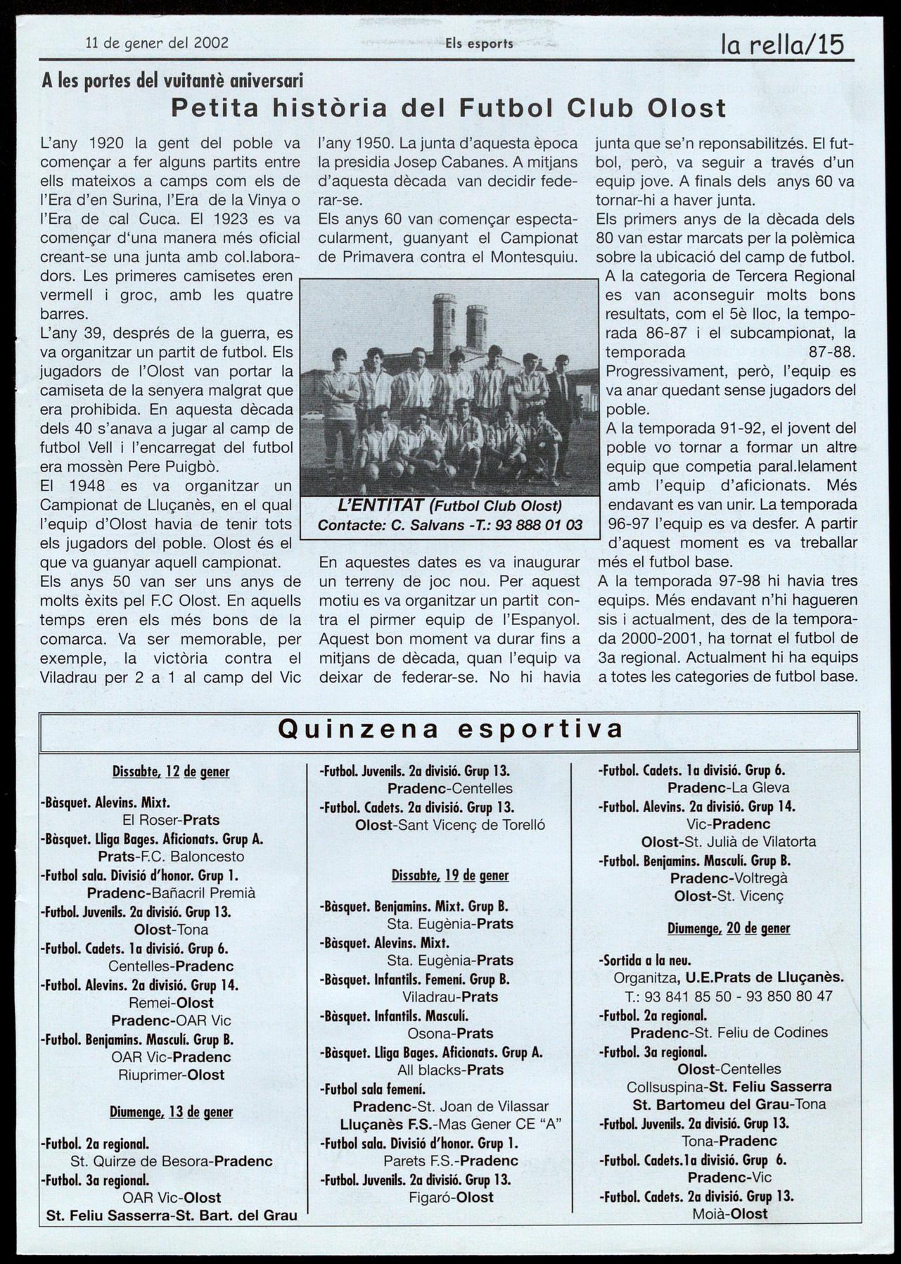 Contacte: C. Sa/vans -T.: 93 888 0103 96-97 l'equip es va desfer. A partir els jugadors del poble. Olost és el d'aquest moment es va treballar que va guanyar aquell campionat. En aquestes dates es va inaugurar més el futbol base.' Els anys 50 van ser uns anys de un terreny de joc nou. Per aquest A la temporada 97-98 hi havia tres molts èxits pel F.C Olost. En aquells motiu es va organitzar un partit con- equips. Més endavant n'hi hagueren temps eren els més bons de la tra el pirmer equip de l'Espanyol. sis actualment, des de la temperacomarca. Va ser memorable, per Aquest bon moment va durar fins a da 2000-2001, ha tornat el futbol de exemple, la victòria contra el mitjans de dècada, quan l'equip va 3a regional. Actualment hi ha equips Viladrau per 2 a 1 al camp del Vic deixar de federar-se. No hi havia a totes les categories de futbol base.